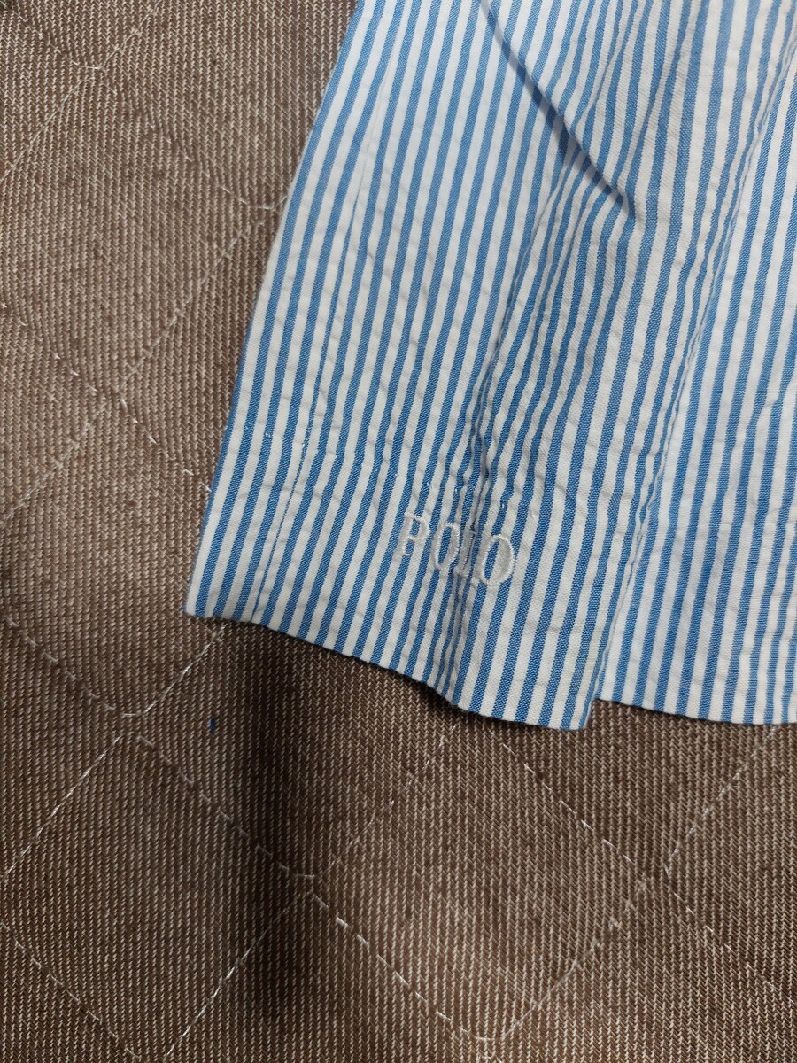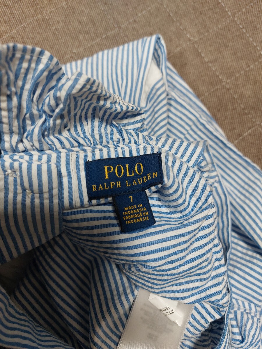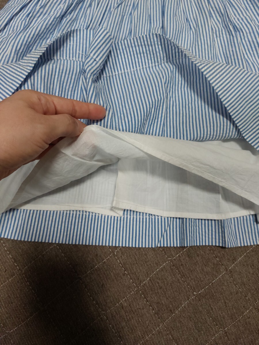 水色と白のストライプデザイン、フリル付きのノースリーブワンピース。