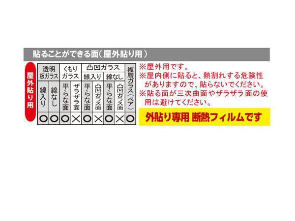 | 今まで熱で割れる恐れがあって貼れなかった鉄線の入った網入りガラス、複層(ペア)ガ ラスが貼れる、外貼り用の断熱フィルムです。日光の熱を鏡のように反射し、冬は室温を保ちます。マジックミラー効果で視線をカット!ガラスが割れても飛び 散りません。キズがつきにくく、窓拭きなどでのお手入れも簡単。有害なUV(紫外線)を99%以上カット。尚UVカットは全面貼りした時に最大限の能力を 発揮します。 |