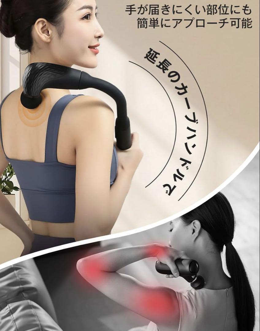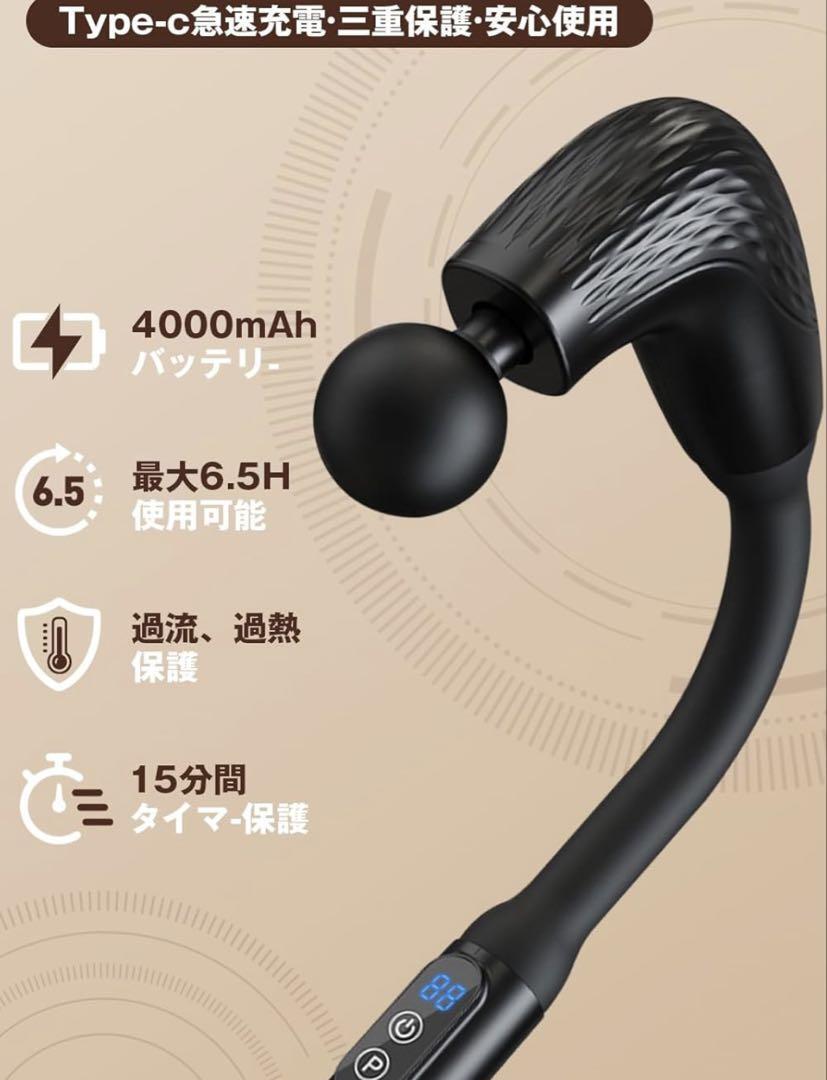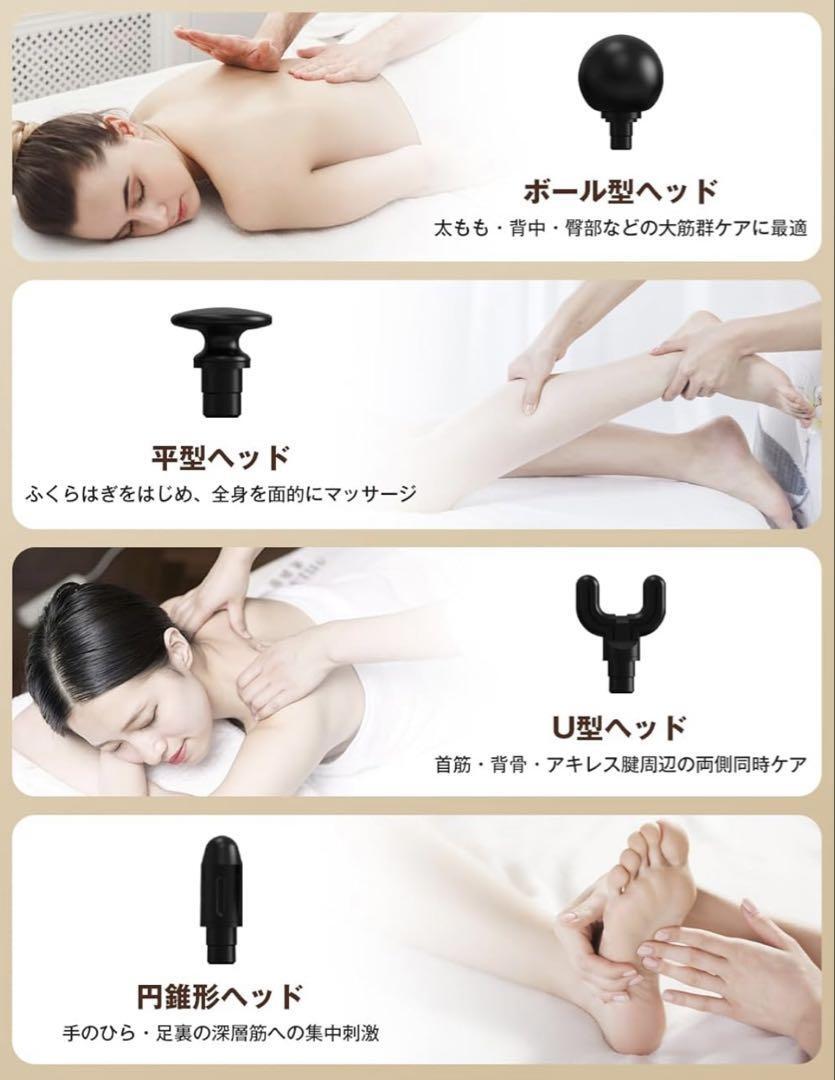 プロフェッショナル仕様の4種交換可能ヘッド(円錐形ヘッド、U型ヘッド、平型ヘッド、ボール型ヘッド)を搭載し。人間工学に基づいた新設計ハンドルはボタン配置を最適化し、握りやすさと操作性を両立。直感的な液晶ディスプレイ付き(強度・モード・残量アイコン表示)でシニアでも簡単操作。