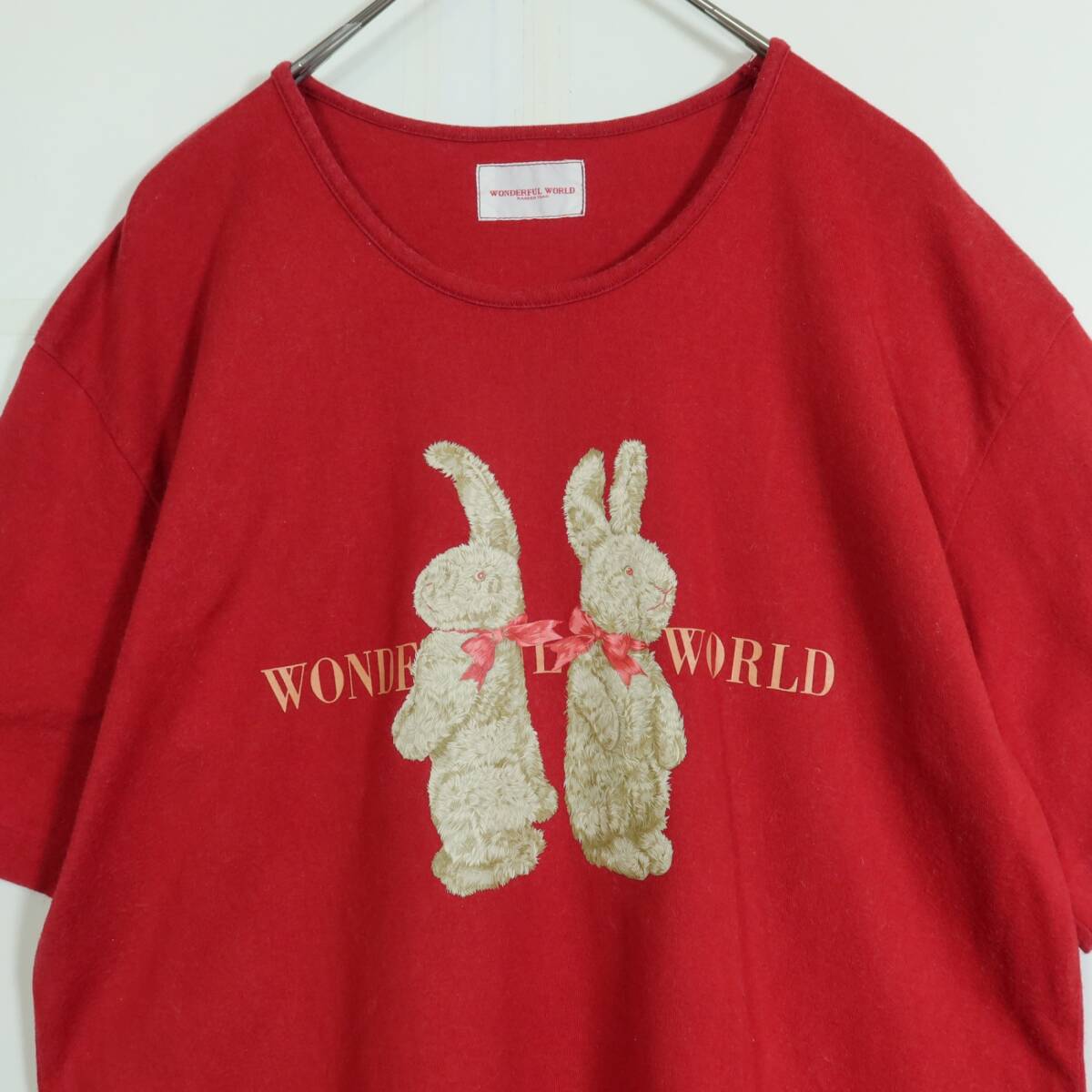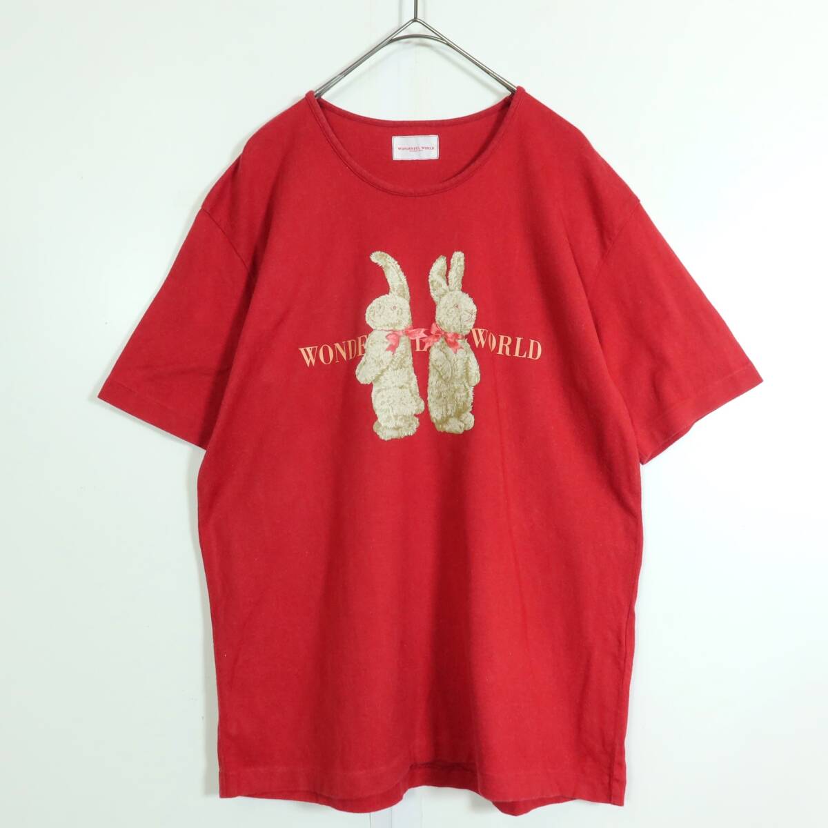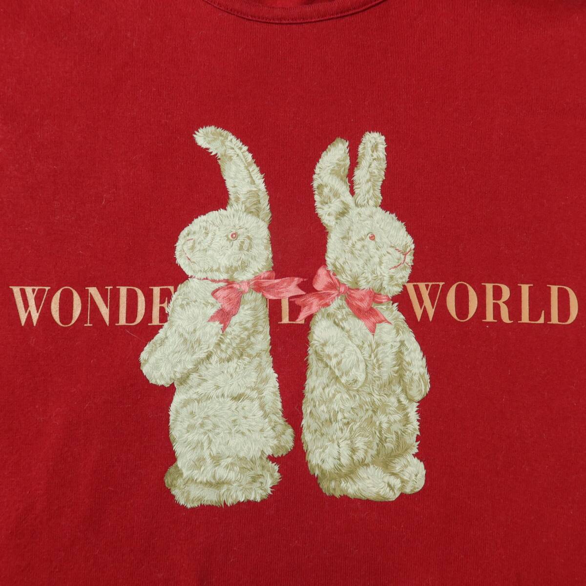 商品説明 | 【実寸約】肩幅45袖丈20バスト98着丈62(cm) 【サイズ表記】 表記なし(実寸をご参照ください) 【素材】綿100% 【状態】普通の使用感のあるお品物 袖の縫い合わせに毛羽立ち、裾にややスレ感がございます。 【デザイン】赤系 シンプルな半袖カットソーです。 リボンを付けたラビットのプリントが可愛い一着です。 薄手/無地 |
