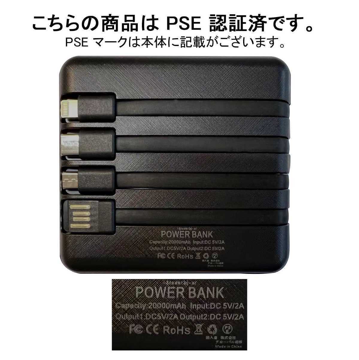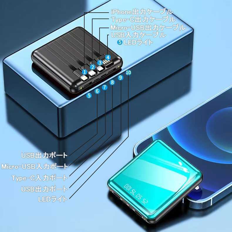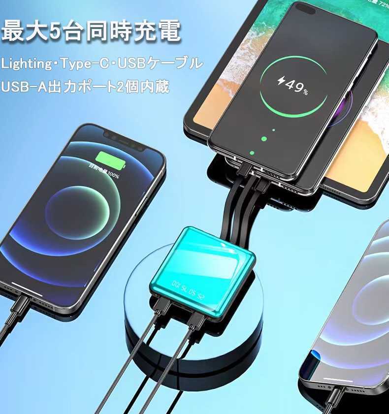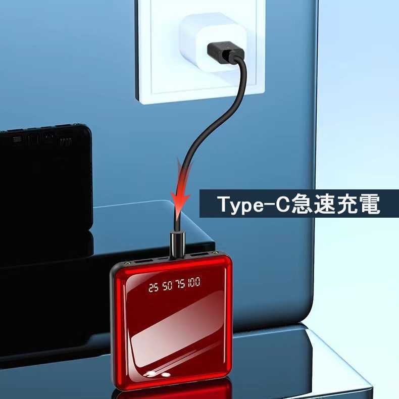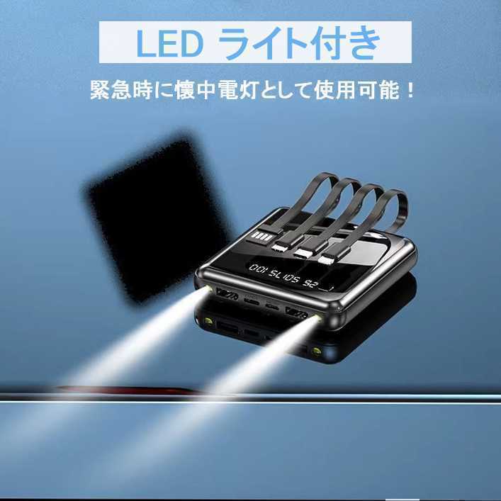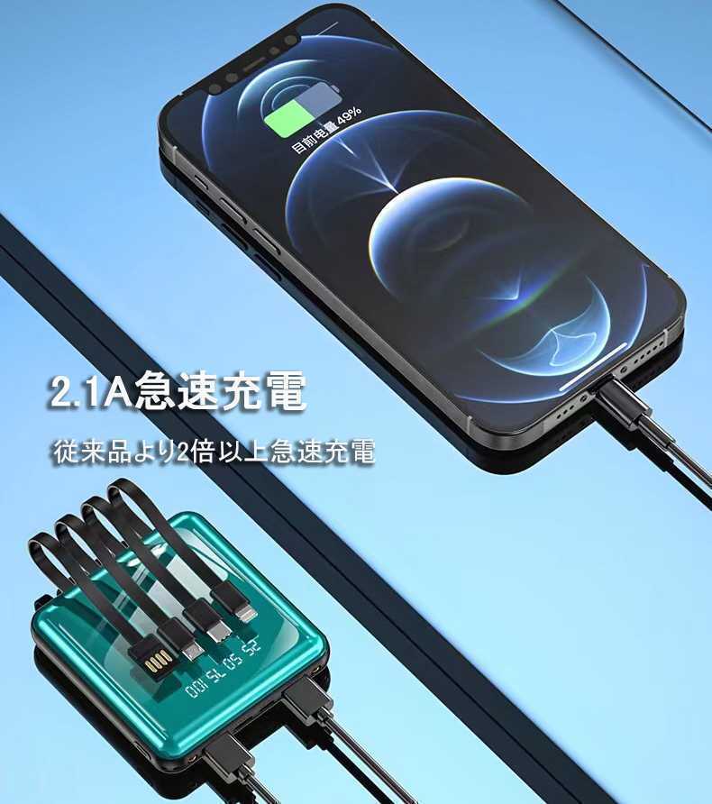 出力にはLightning、microUSB、USB type-Cの3規格出力ケーブルが内蔵された最新型のケーブル内蔵モバイルバッテリーです。専用ケーブルを持ち歩く必要がなく、AndroidとiPhoneどちらにも対応出来ます。ケーブルを忘れたときも充電ができないなんて心配はいりません。更に、モバイルバッテリーの本体に充電ケーブルが内蔵されているため、USB-Aポートのある場所であれば即時モバイルバッテリーの充電が可能。