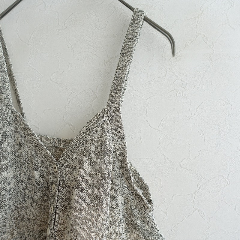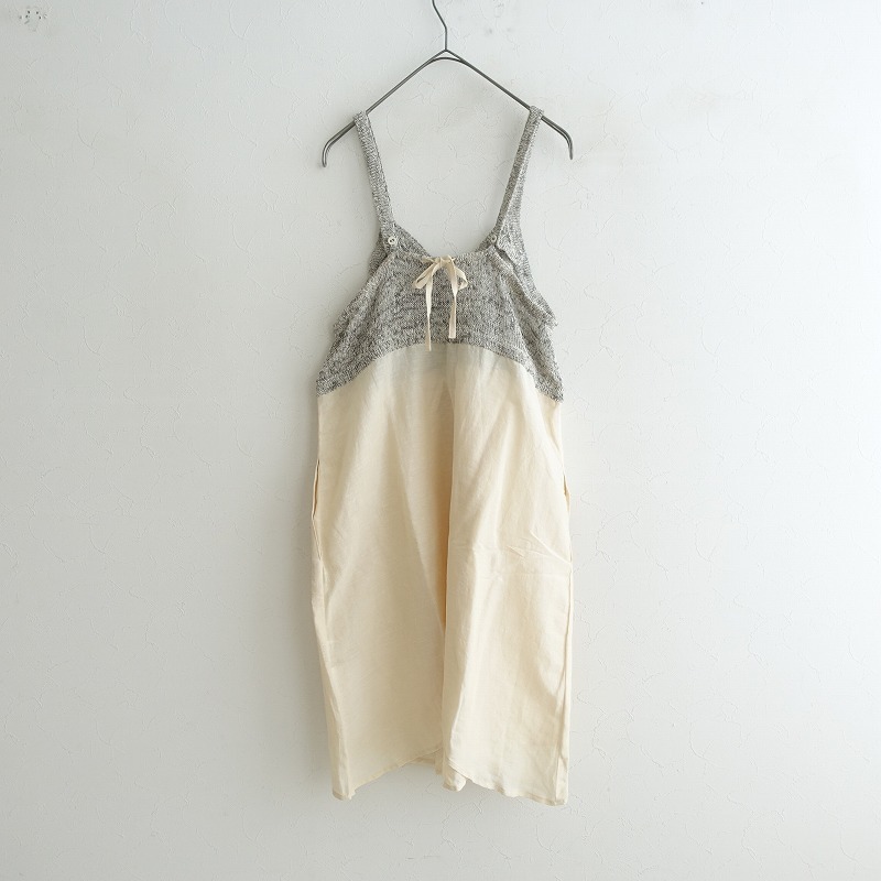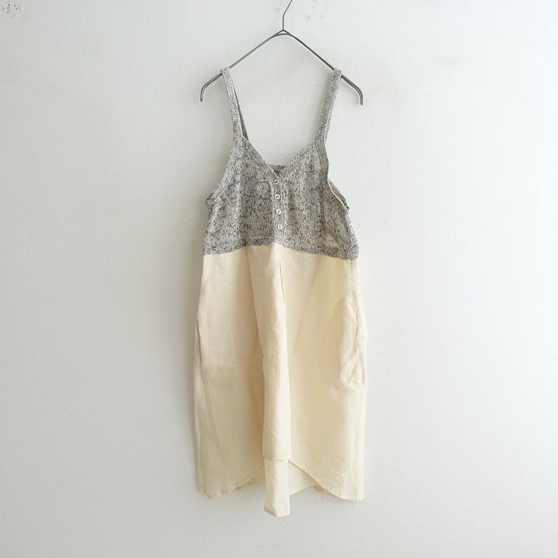 Tabrikのシルクニット切替キャミソールワンピースです。 カラーはカラーはブラック×オフホワイトミックスのシルクニット地×麻綿混紡の薄手生地です。 肩紐はボタンにて2段階調整が可能で、背上部はひも入りです。 |