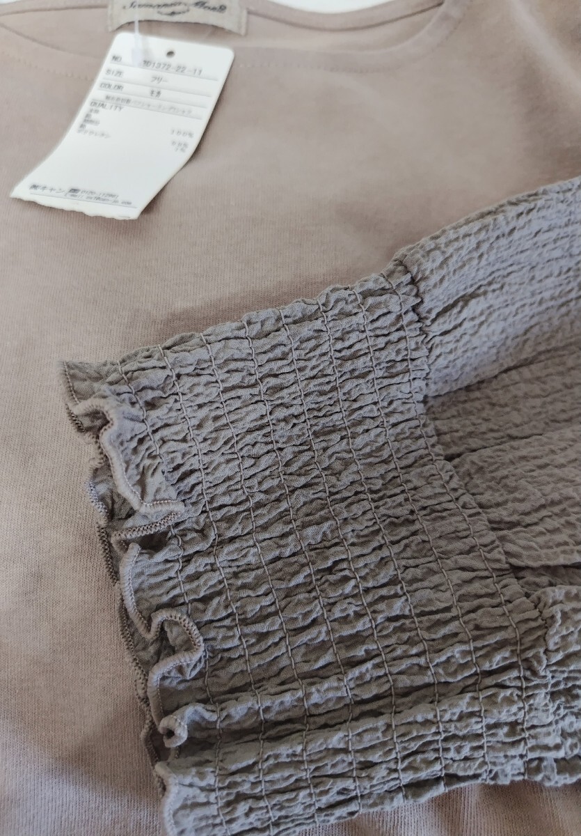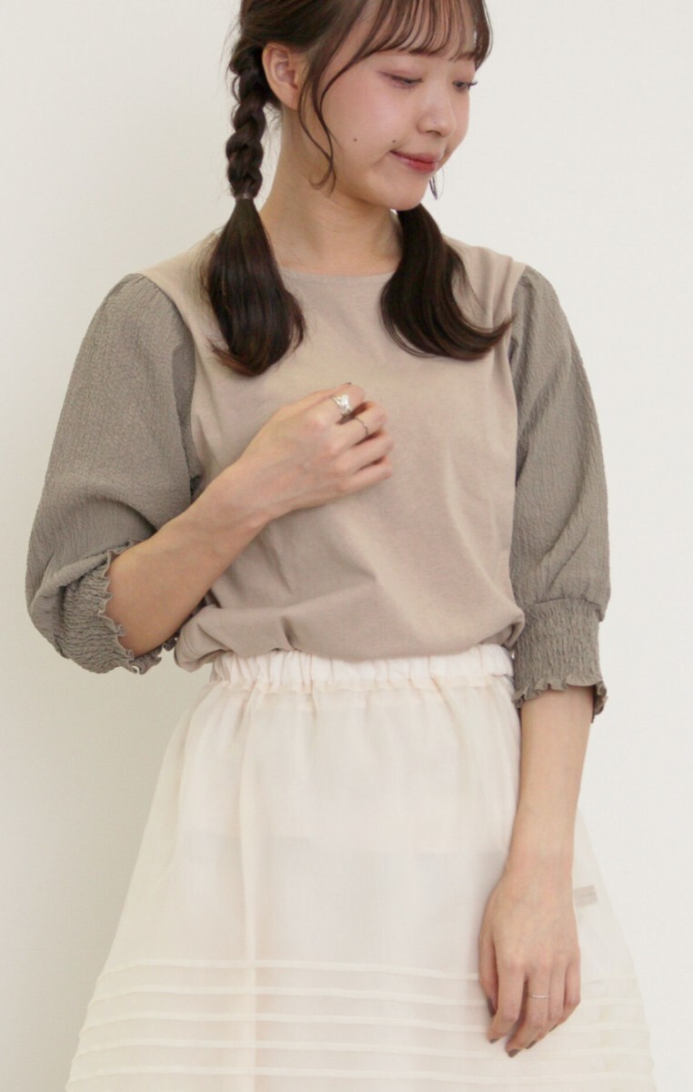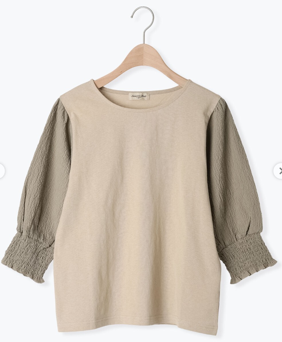 スリーブの布帛切り替えが表情豊かな印象を与えるTシャツ。