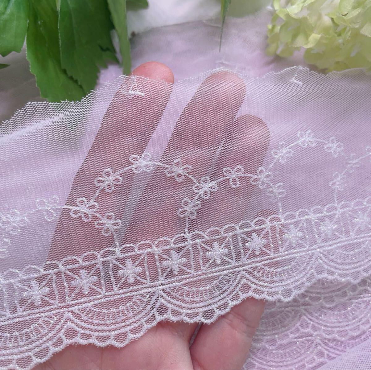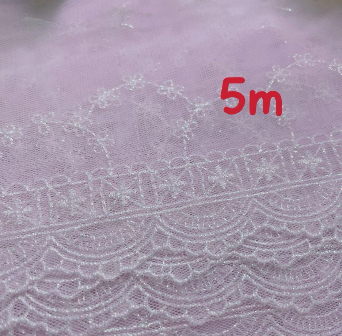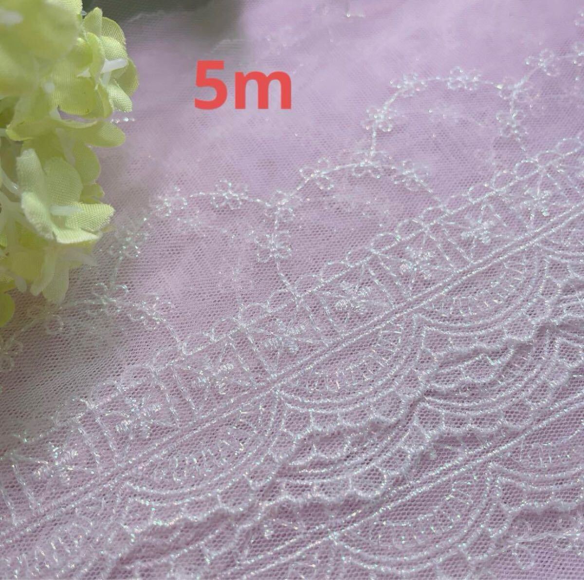5mの薄いピンク色のレース生地、花柄デザインで、手芸や装飾に最適。