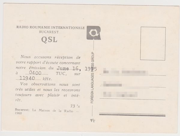 | 商品説明 | Radio Romania International のベリカードです。カード取得者の名前は出品上、画像から消してあります。 |