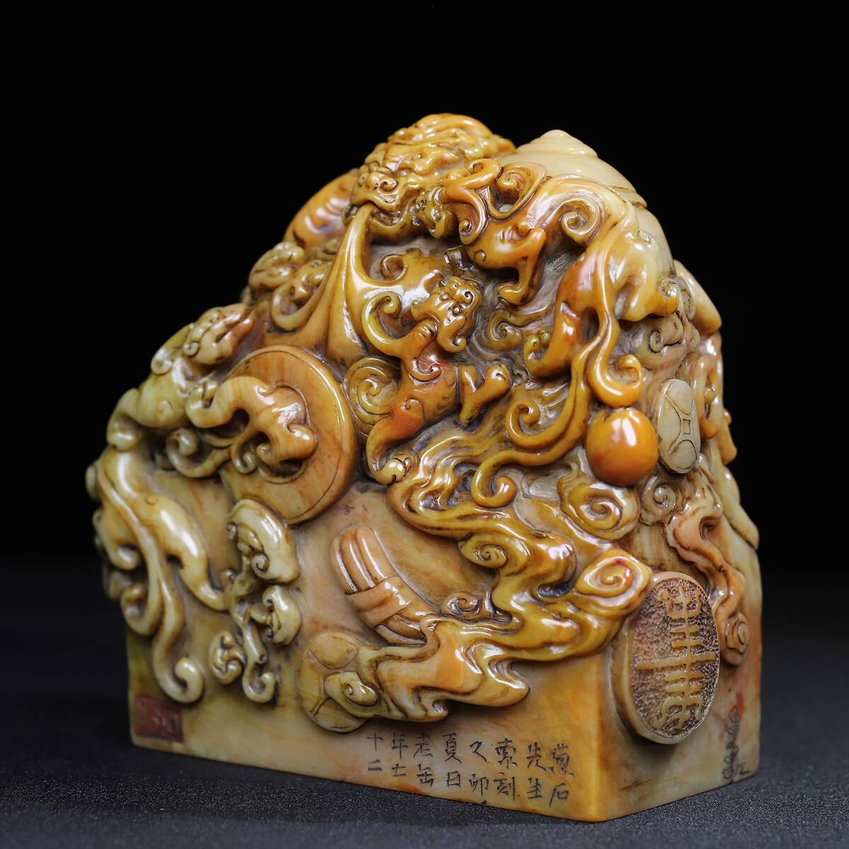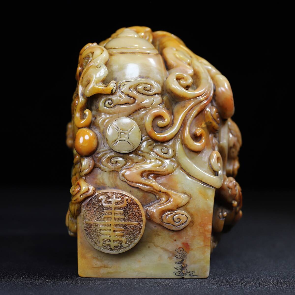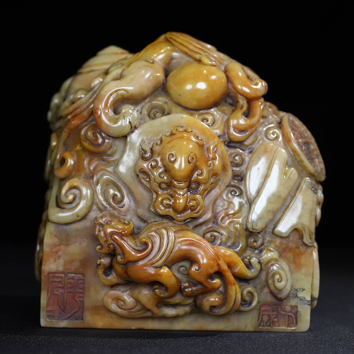 旧蔵 【清代篆刻家 呉昌碩 号:老缶】寿山石 彫刻 キレート龍獻壽 印章 天然石 手彫 篆刻 古印材 極細工 中国古玩 骨董品 古美味 206-21