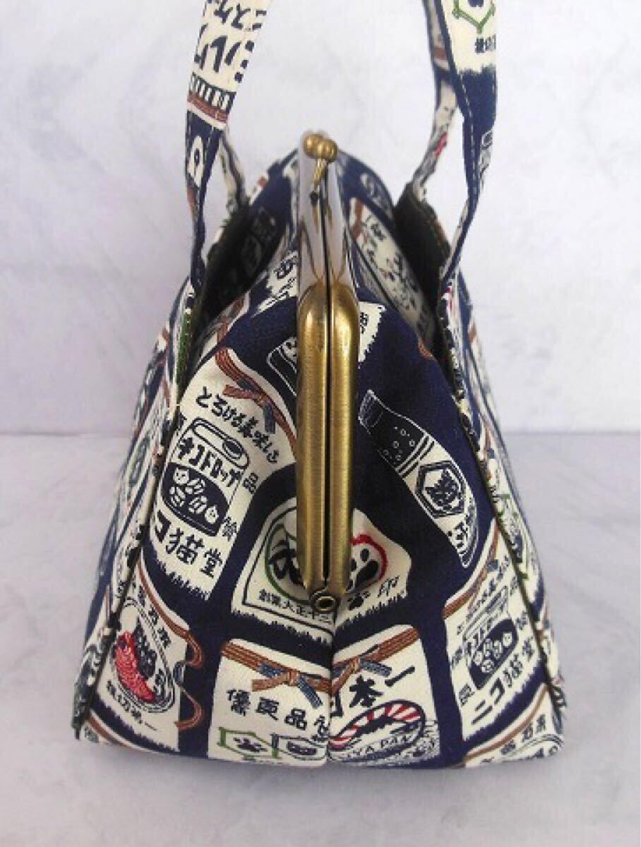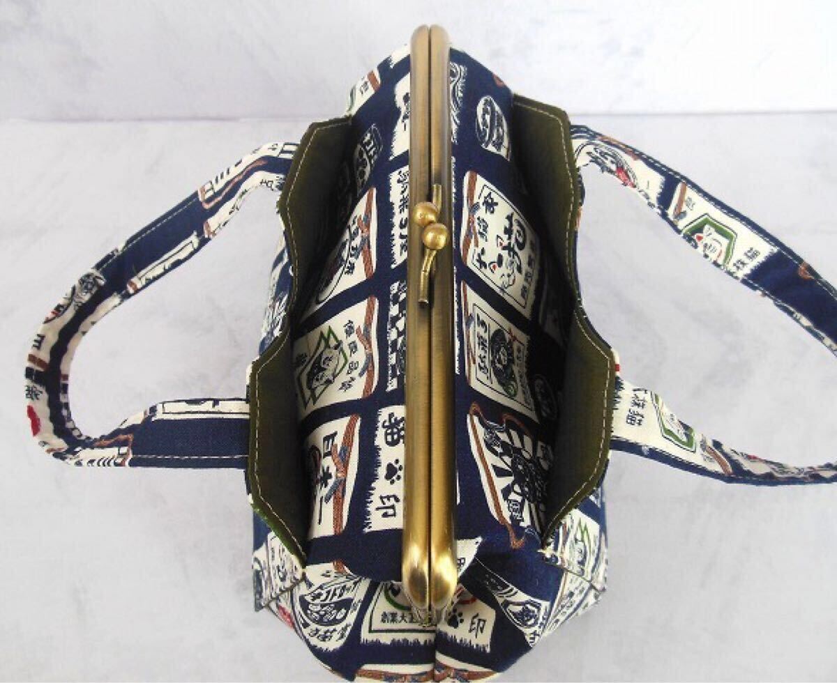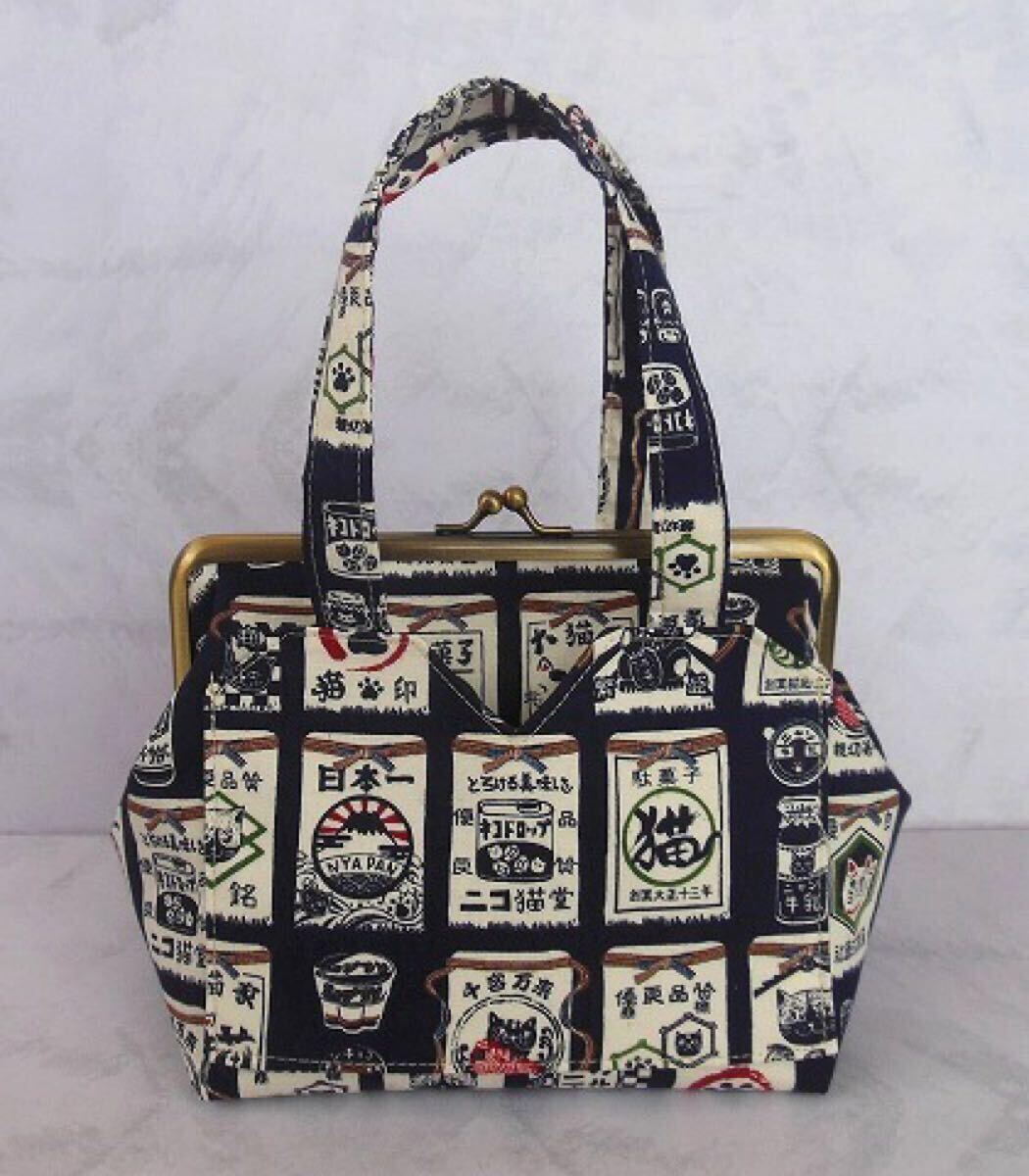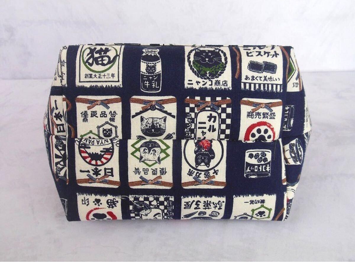 訳あり◆がま口ポーチ◆あおりバッグ風◆ねこ柄 前掛け風 紺色◆ハンドメイド 化粧ポーチ 口金16.5㎝ 招き猫 千客万来