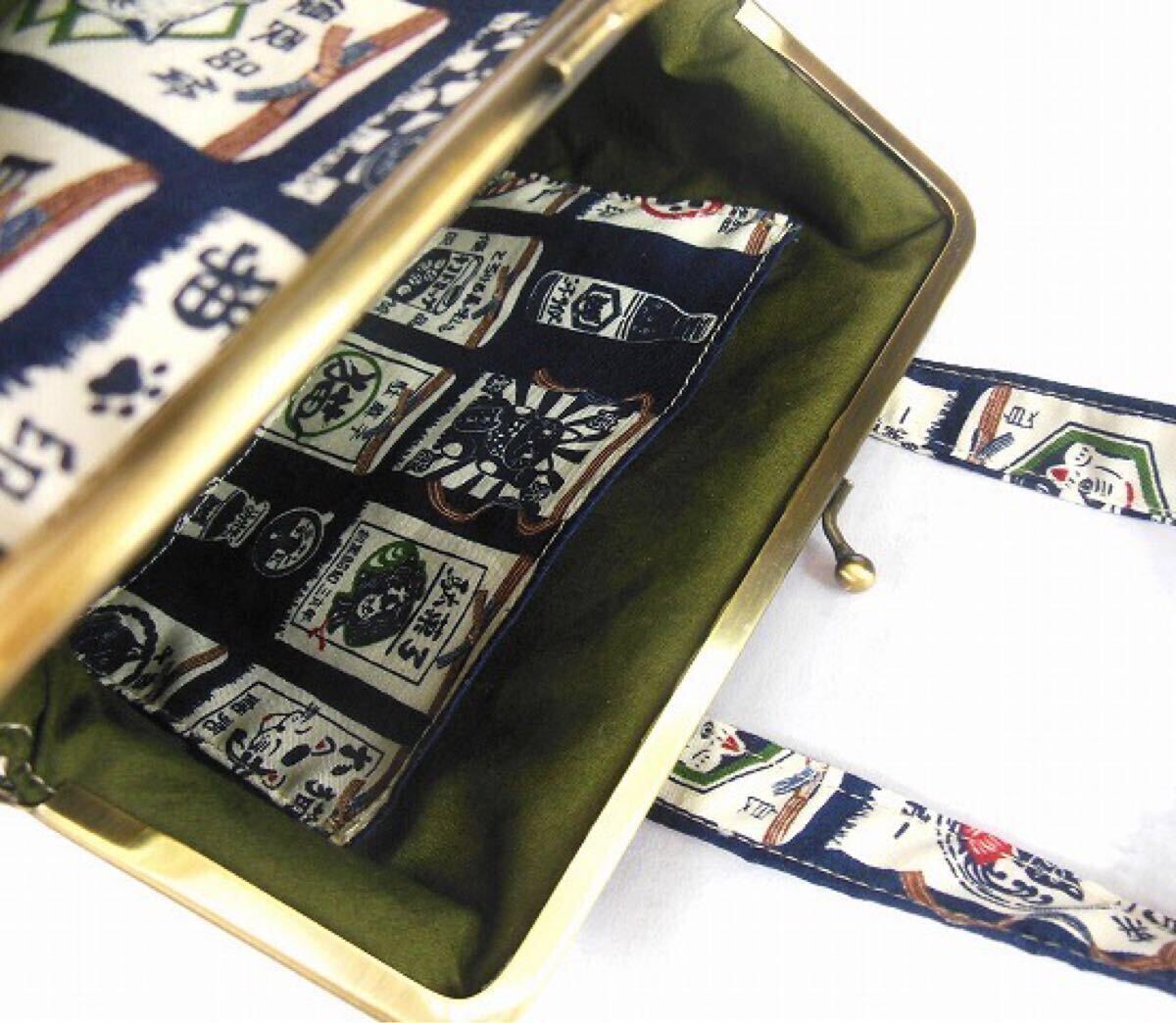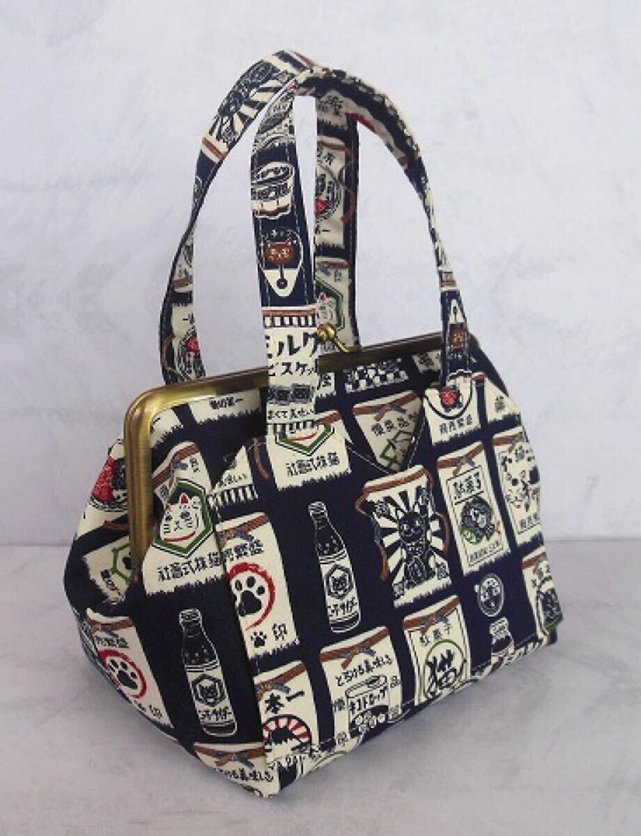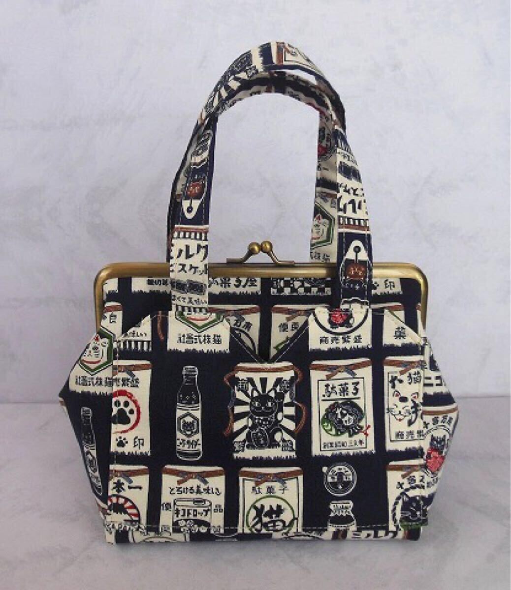 訳あり◆がま口ポーチ◆あおりバッグ風◆ねこ柄 前掛け風 紺色◆ハンドメイド 化粧ポーチ 口金16.5㎝ 招き猫 千客万来