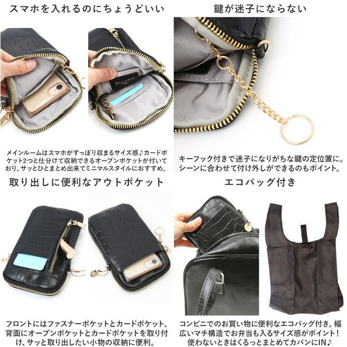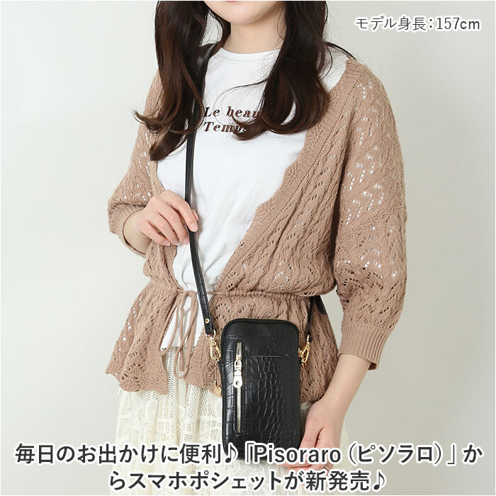 | 商品説明 | ・・毎日のお出かけに便利♪「Pisoraro(ピソラロ)」からスマホポシェットが新発売♪ ・【うれしいスリムサイズ】 ・ちょっとそこまでのお出かけにぴったり。旅行やレジャーシーンでも活躍☆ ・【コーデのアクセントに】 ・本革のようなシボが特徴的なカラーや、パイソン柄などカバンのアクセントになるような型押しデザインもご用意。 ・フロントのファスナーの引き手は、それぞれのカラーに合う異なるチャームと組み合わせて細部までオシャレなアイテム♪ ・【スマホを入れるのにちょうどいい】 ・メインルームはスマホがすっぽり収まるサイズ感♪カードポケット2つと仕分けて収納できるオープンポケットが付いており、サッとひとまとめ出来てミニマルスタイルにおすすめ。 ・【鍵が迷子にならない】 ・キーフック付きで迷子になりがちな鍵の定位置に。シーンに合わせて付け外しができるのもポイント。 ・【取り出しに便利なアウトポケット】 ・フロントにはファスナーポケットとカードポケット、背面にオープンポケットとカードポケットを取り付け、サッと取り出したい小物の収納に便利。 ・【持ち方をアレンジ】 ・ショルダーストラップの長さを調節して、斜め掛けなど自分仕様に!ストラップを取り外してバッグインポーチとしても。 ・【エコバッグ付き】 ・コンビニでのお買い物に便利なエコバッグ付き。幅広いマチ構造でお弁当も入るサイズ感がポイント!使わないときはくるっとまとめてカバンにIN♪ ・【ポケット仕様】 ・メインルーム・・・カードポケット×2、オープンポケット×1 ・フロント・・・ファスナーポケット×1、カードポケット×1 ・背面・・・オープンポケット×1(内カードポケット×1) |