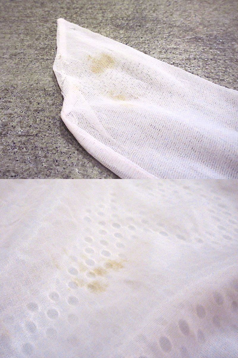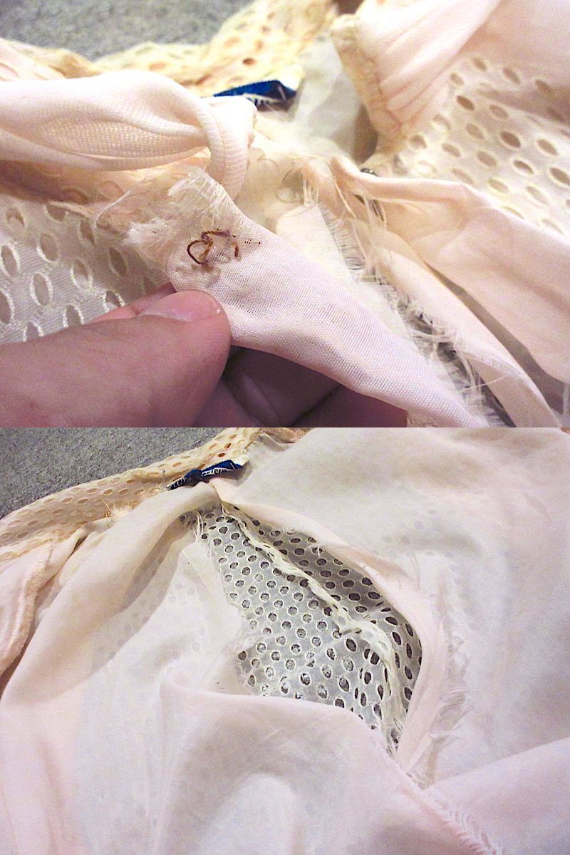 首元のスナップボタン欠損、裏地に破れ、所々にシミ、破れ