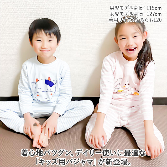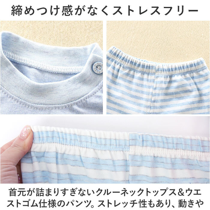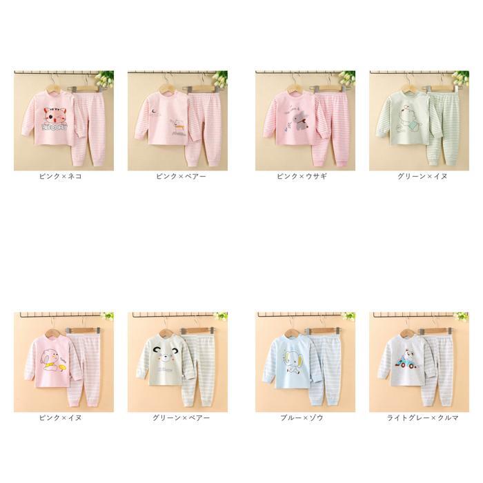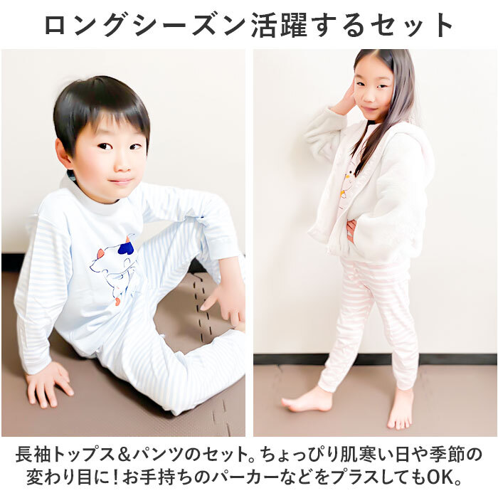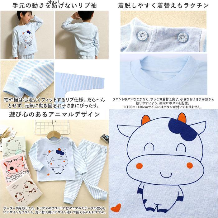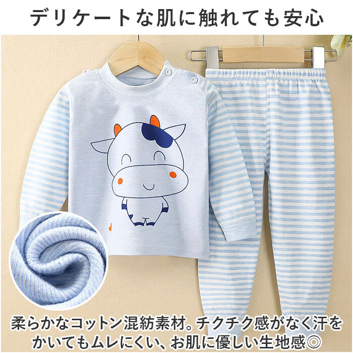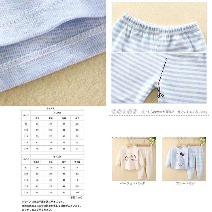 | 商品説明 | ・・着心地バツグン。デイリー使いに最適な「キッズ用パジャマ」が新登場。 ・【ロングシーズン活躍するセット】 ・長袖トップス&パンツのセット。ちょっぴり肌寒い日や季節の変わり目に!お手持ちのパーカーなどをプラスしてもOK。 ・【デリケートな肌に触れても安心】 ・柔らかなコットン混紡素材。チクチク感がなく汗をかいてもムレにくい、お肌に優しい生地感◎ ・【締めつけ感がなくストレスフリー】 ・首元が詰まりすぎないクルーネックトップス&ウエストゴム仕様のパンツ。ストレッチ性もあり、動きやすい! ・【手元の動きを妨げないリブ袖】 ・袖や裾は心地よくフィットするリブ仕様。だら~んとせず、元気に動き回るお子さまにぴったり。 ・【着脱しやすく着替えもラクチン】 ・フロントボタンなどがなく、サッとお着替え完了。小さなお子さまが頭から被りやすいよう、襟元にボタンを配置。(※120m・130cmサイズにはボタンが付いておりません。) ・【遊び心のあるアニマルデザイン】 ・ボーダー柄を取り入れ、トップスのフロントにはアニマルモチーフの愛らしいデザインをプリント。洗い替え用にデザイン違いで揃えるのもおすすめ。 |