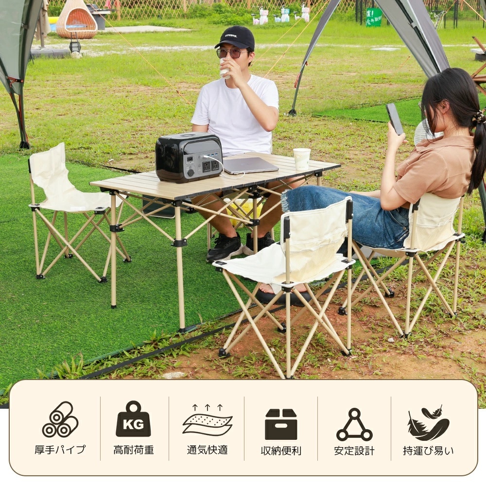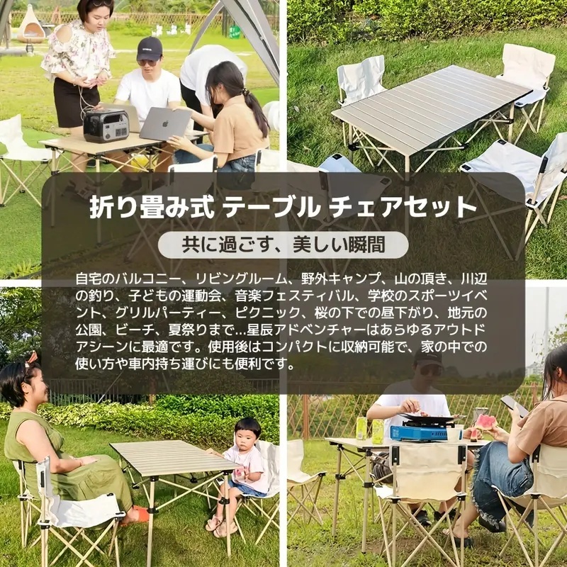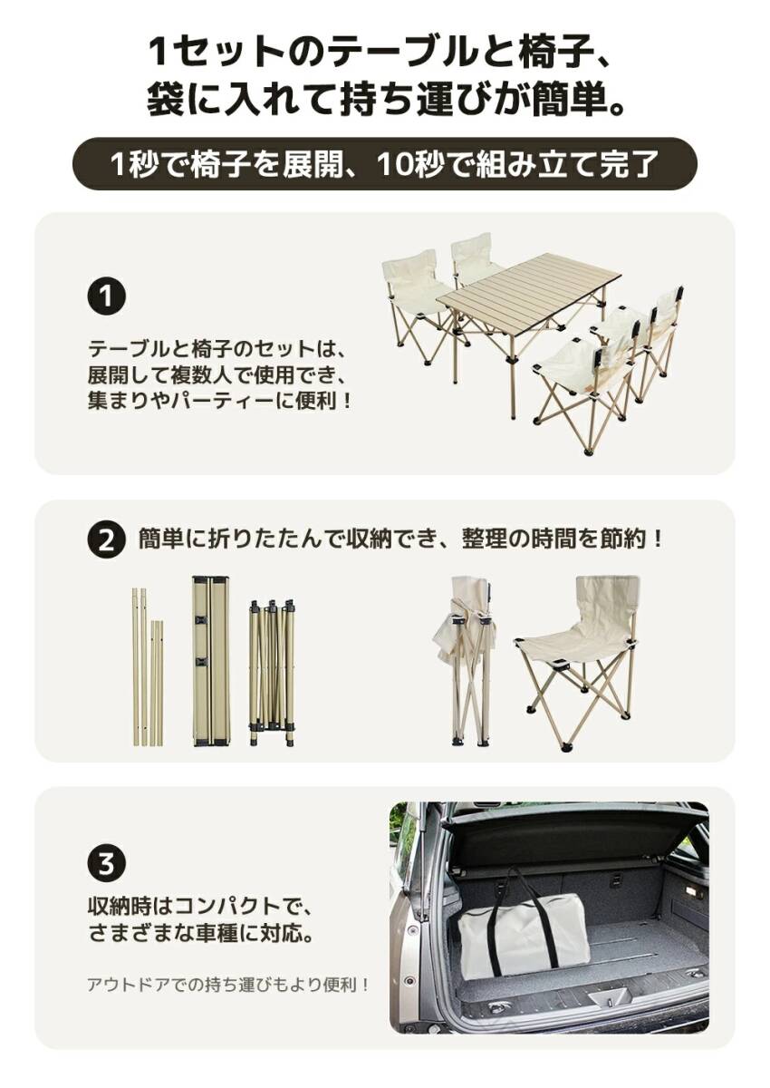 1.軽量で持ち運び簡単:テーブルとチェアは高強度のアルミ合金製で、安定性を保ちながらも軽量です。折りたたみ式デザインで、使用しないときは簡単に収納袋に収めることができ、車に積んでも場所を取りません。