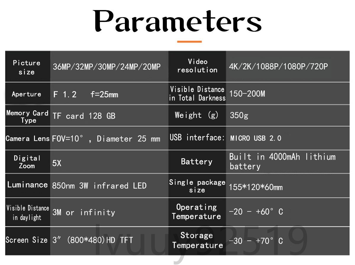 対象年齢 大人 特徴 暗視 対物レンズの直径 25 ミリメートル 最大倍率 5 x この商品について 暗闇ではっきりと見る: 暗視双眼鏡は、7 レベルで調整可能な 850nm IR イルミネーターを備えており、全光学システムにより、動物や植物を 100% の暗闇や薄暗い環境光ではっきりと見ることができます。写真の撮影、ビデオの録画、再生の 3 つのモードを使用すると、昼間、暗い場所、夜間でも、優れた光学的透明度で高解像度の写真とビデオを撮影できます。 3 インチ大型 HD ディスプレイ: 3 インチ TFT LCD スクリーンを備えたナイト ビジョン ゴーグルにより、非常に鮮明な写真やビデオを表示できます。25 mm の対物レンズ絞りと 5 倍のデジタル ズームのビューにより、より広い視野が得られます。野外活動、夜間に最適です。狩猟、パトロール探知、警備と監視、キャンプ、野生生物と風景の観察。 【フルハイ4K動画&36MP画像】ナイトビジョン双眼鏡は、4KフルHD動画解像度と3600万画素の写真を実現。動く動物の動画撮影時に動体検知機能をオンにすることができ、手ぶれ防止機能も備えています。 充電式リチウム電池:4000mAhのリチウムイオン充電式セルを内蔵。赤外線ハイテク暗視双眼鏡は、850 NM の赤外線イルミネーターを備えており、暗闇の中で動物を何時間も見ることができます。単三電池は必要ありません。お金と環境を節約しましょう。 商品内容: ナイトビジョンゴーグル x 1、ネックストラップ x 1、32GB SDカード x 1、データケーブル x 1。真っ暗な状態で鮮明な写真やビデオを撮影し、付属のメモリ カードにすべてを保存し、すぐにダウンロードして友達に見せることができると想像してみてください。