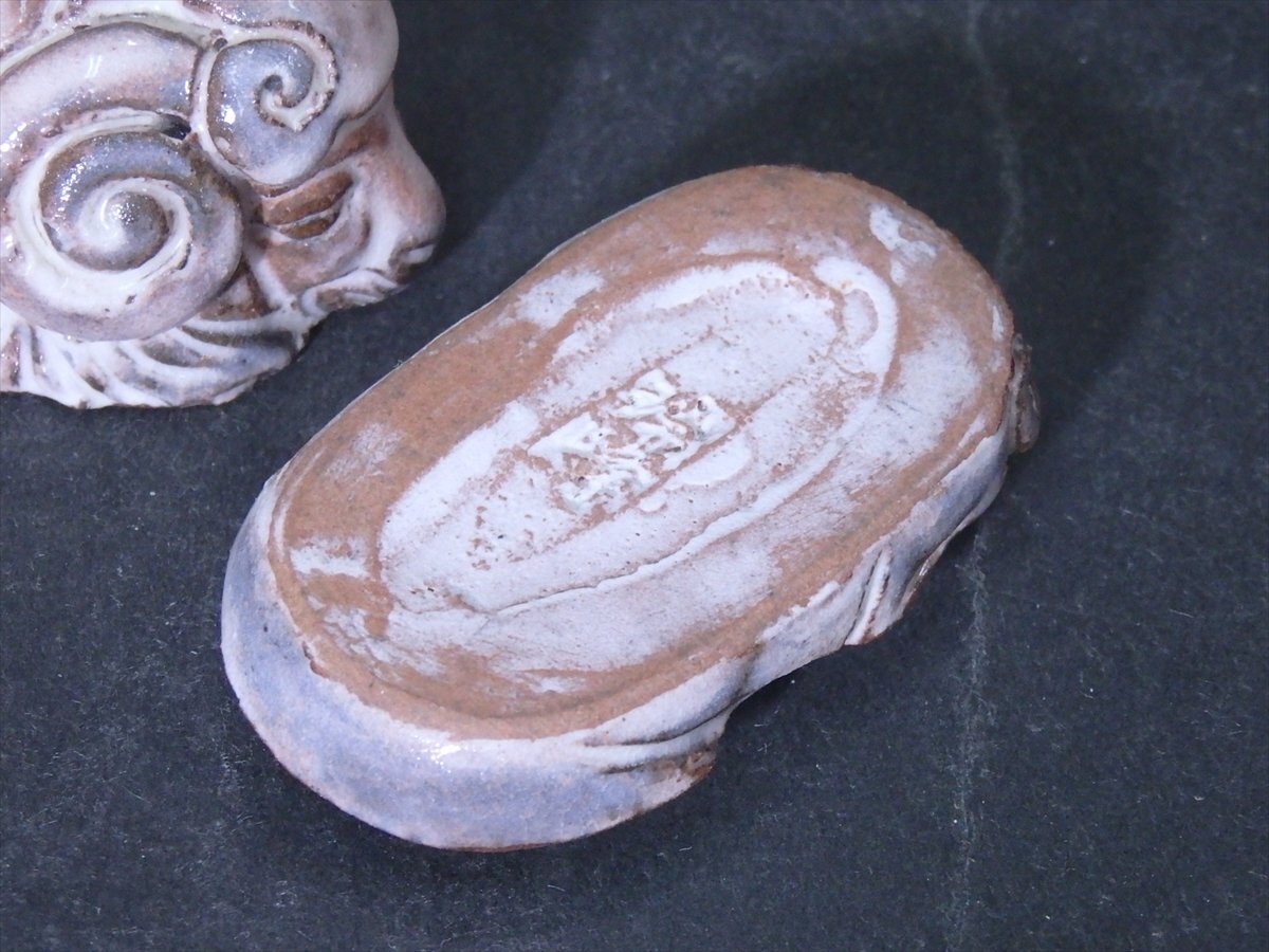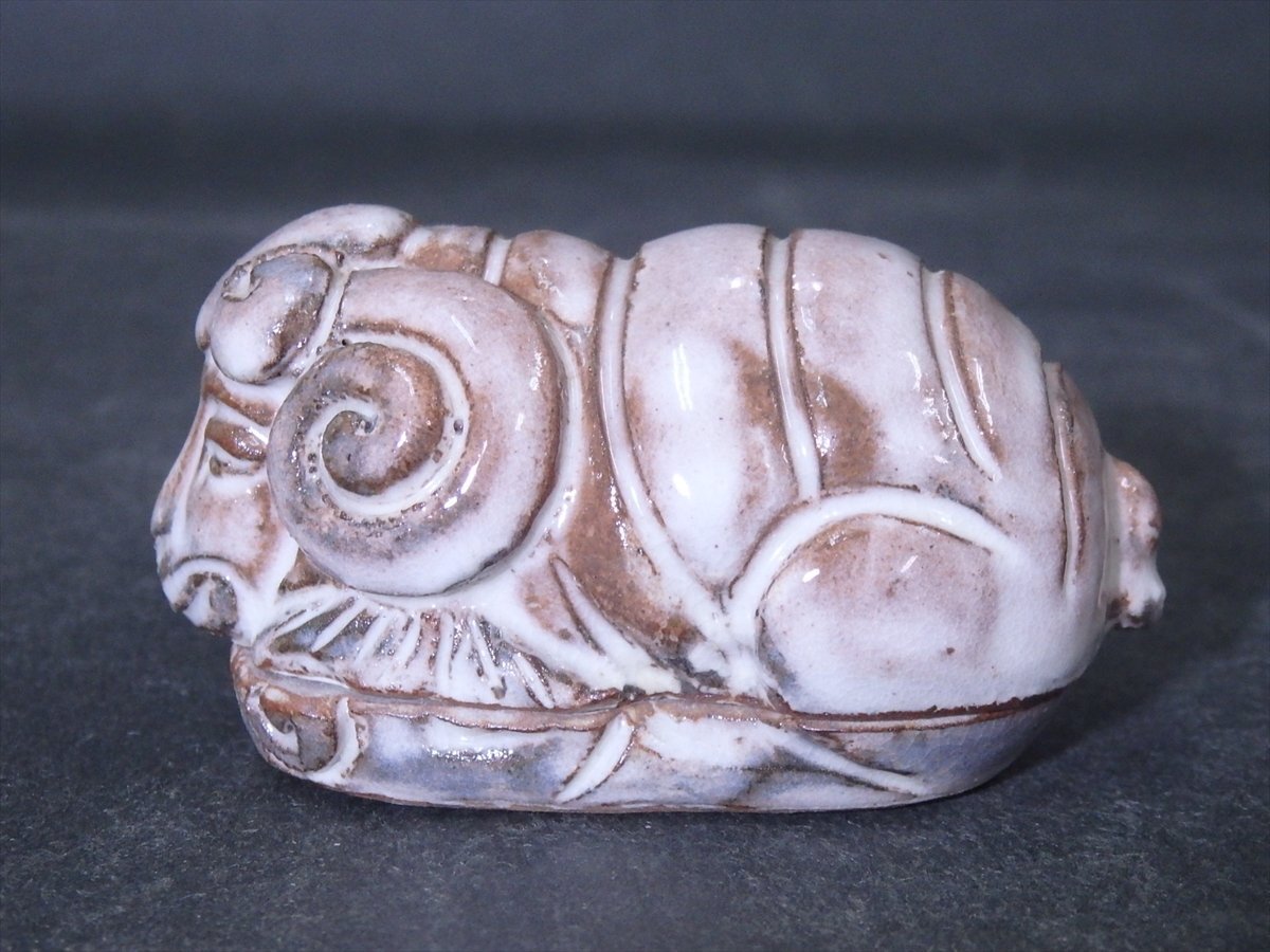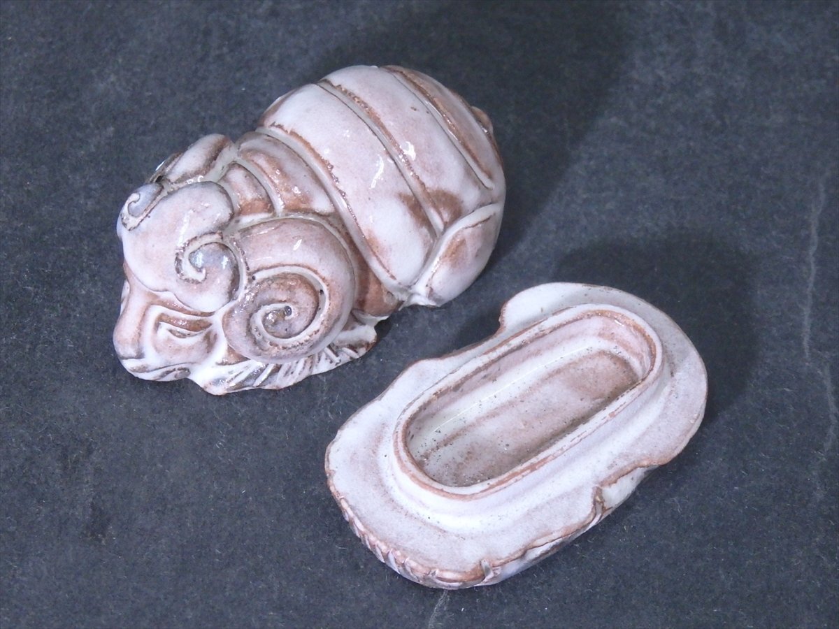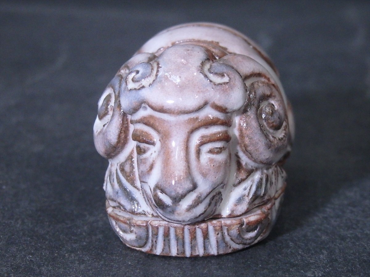 【管理番号5-0613171-6 スタッフコメント:iy】  ☆くるんと巻いた大きな角、人面のような顔です。割れや欠けはありません。共箱入り、共布付き。