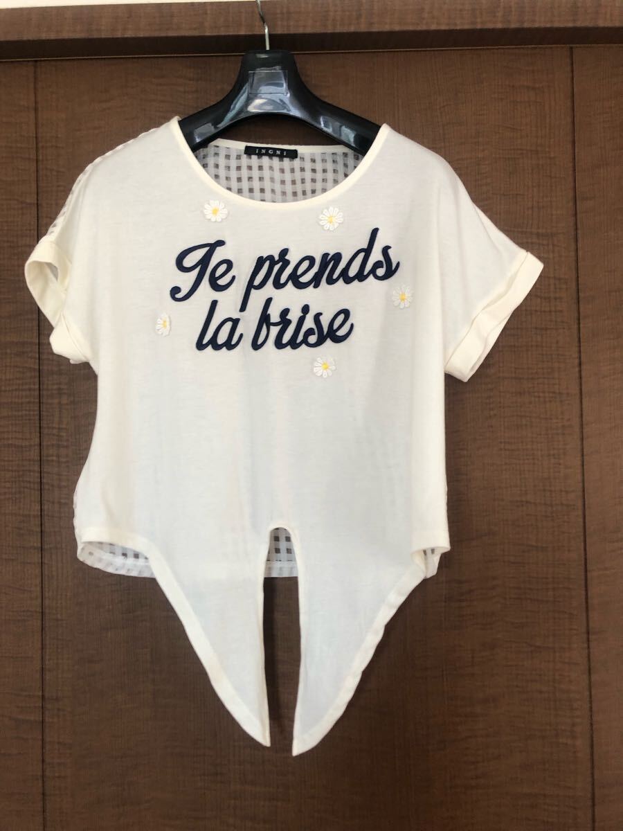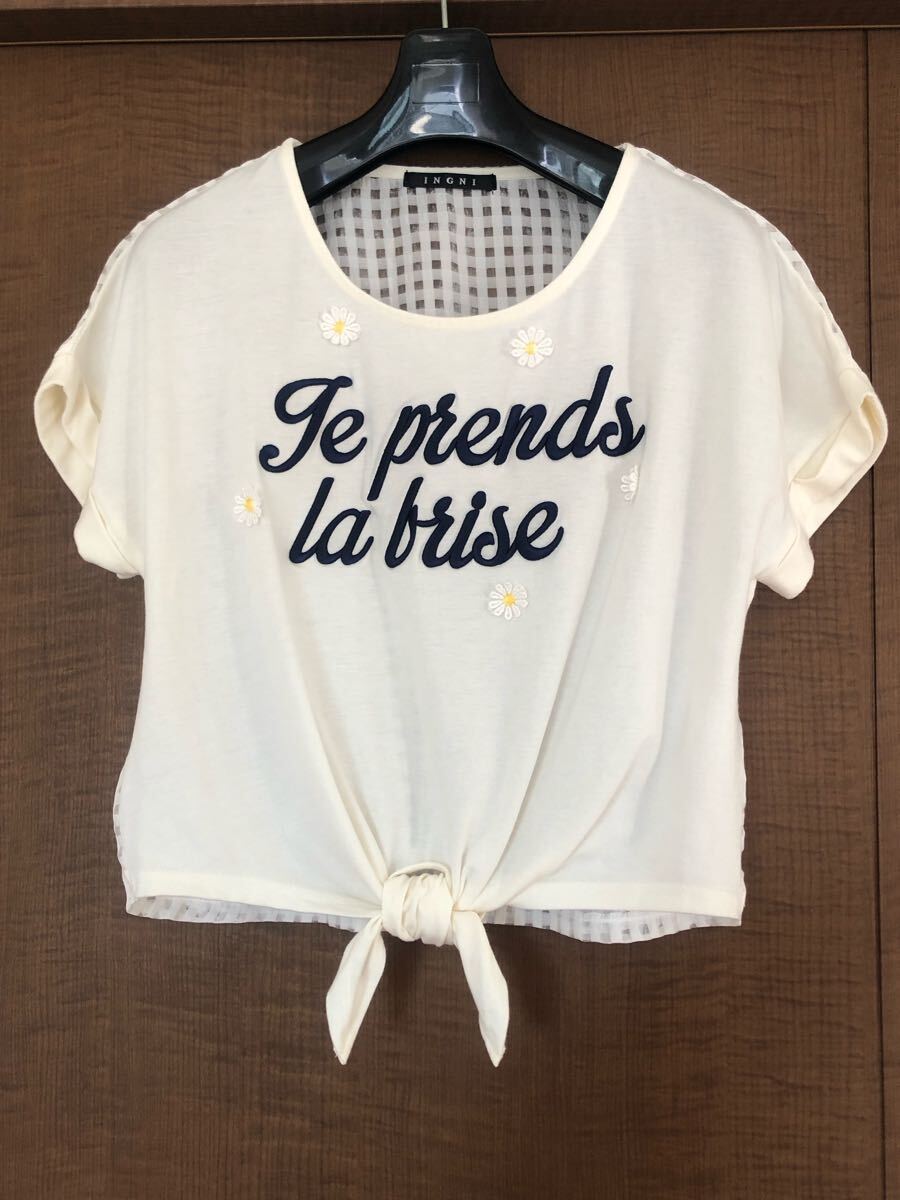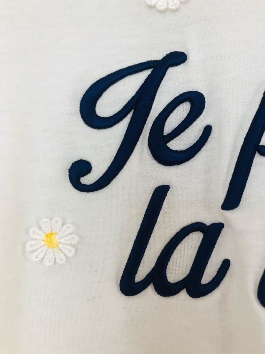 胸元の刺繍のロゴとフラワーモチーフのアップリケ。背中のオーガンジーメッシュがポイントです。
