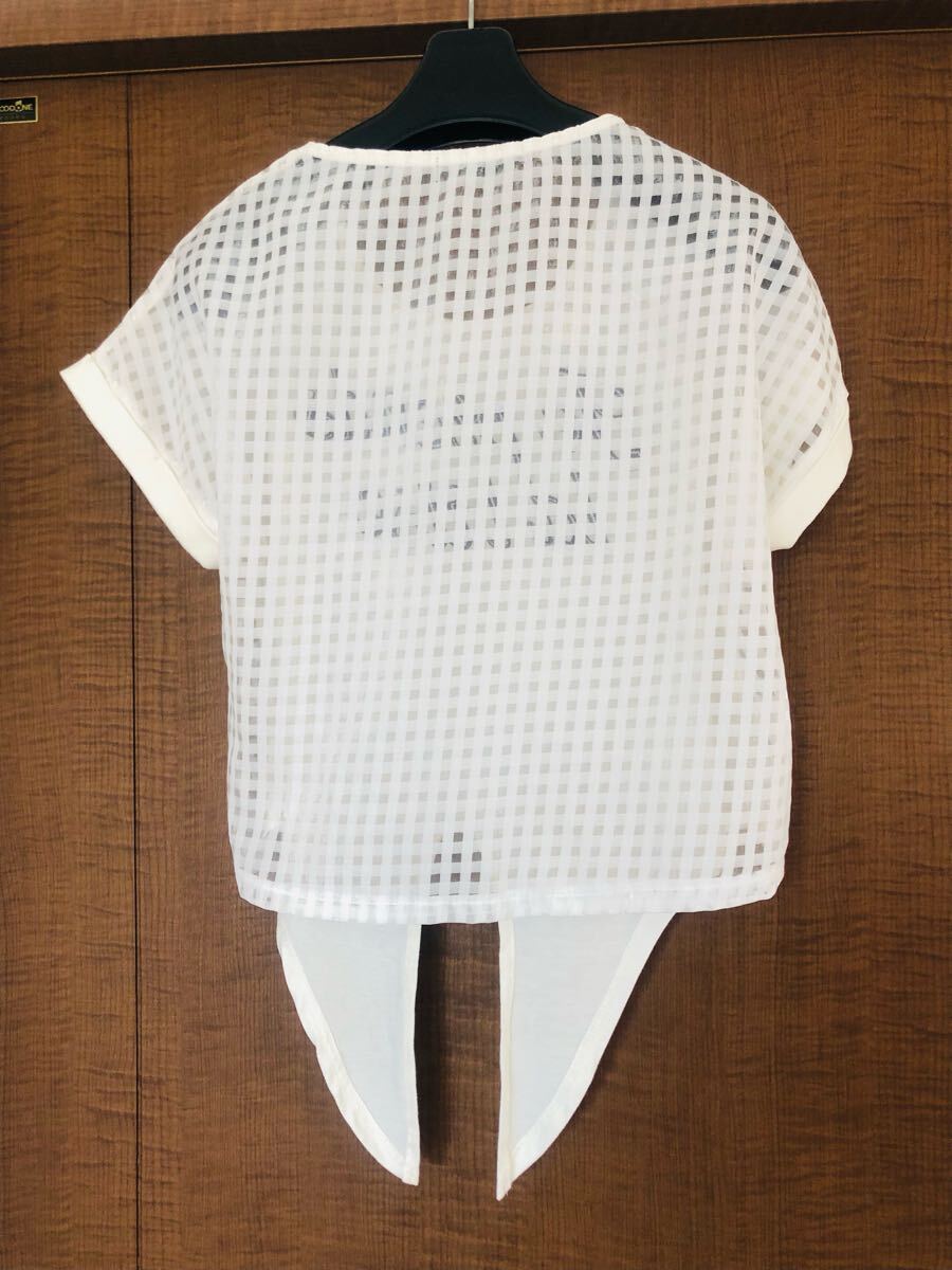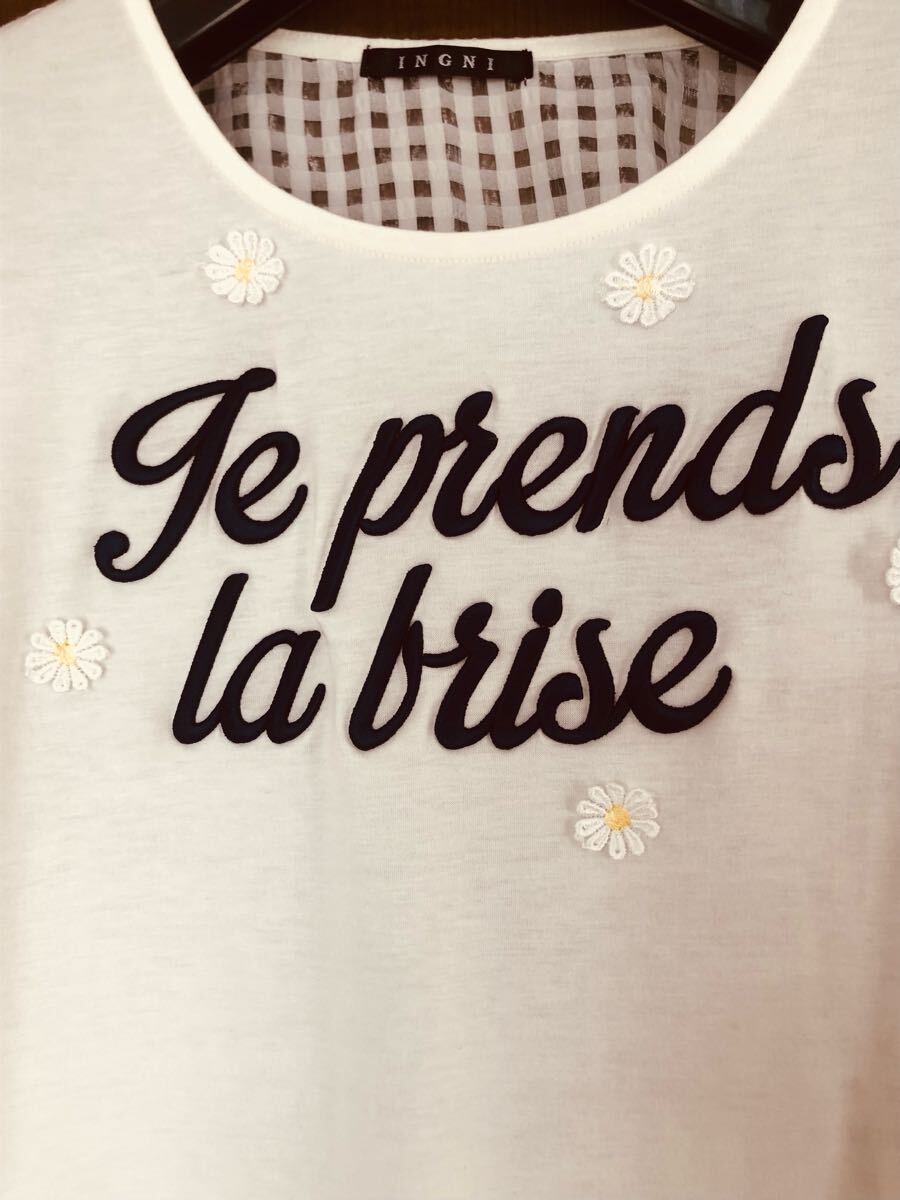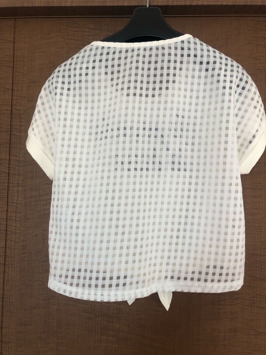 胸元の刺繍のロゴとフラワーモチーフのアップリケ。背中のオーガンジーメッシュがポイントです。