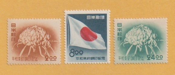 ○【記念切手】平和条約《 2oo・8oo・24oo円 》 3種 菊の花・国旗 1951年  未使用