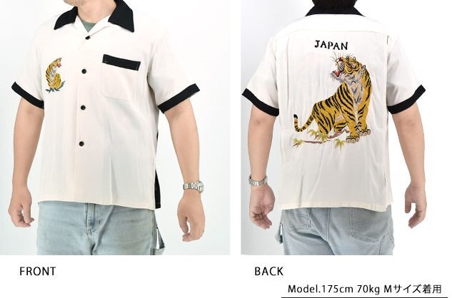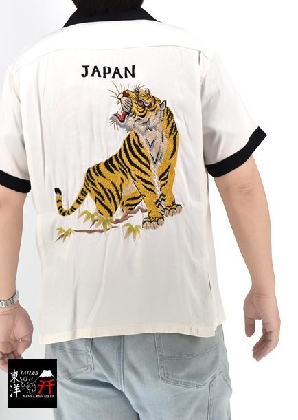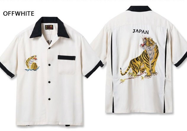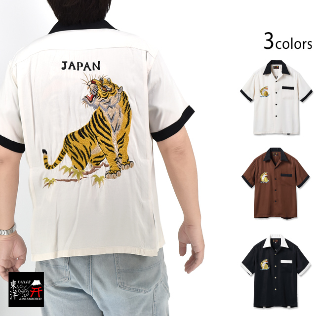 探求心と情熱を持って、上質なアイテムを製作し続けている「テーラー東洋」から、スカシャツ「ROARING TIGER」(TT39508)のご紹介です。 1950年代にスカジャンに描かれた図案をボウリングシャツ型へ落とし込んだ一着。 襟や袖口、アクションプリーツの色を身頃と切り替えることで、デザインのアクセントとしているのも特徴です。 軽やかなレーヨン素材のため、夏場でも気軽にスカジャンの雰囲気を味わえる一着に仕上がりました。 | |||||||||||||||||||||||||