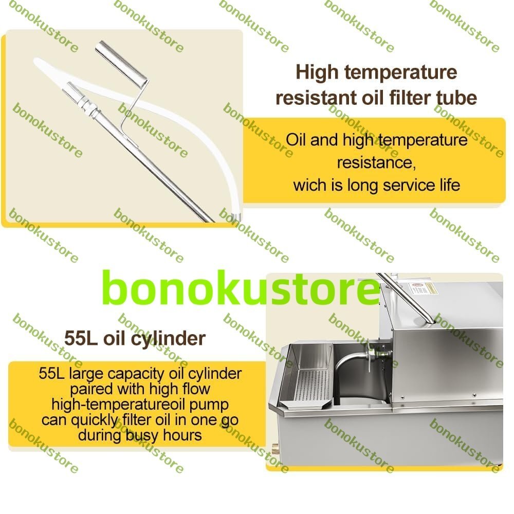 食用油、植物油、大豆油、混合油など、ハンバーガーショップ、ファーストフードレストラン、フライドチキンショップ、ホテル、スナックバー、食堂などで140~248の温度でろ過するために使用できます。