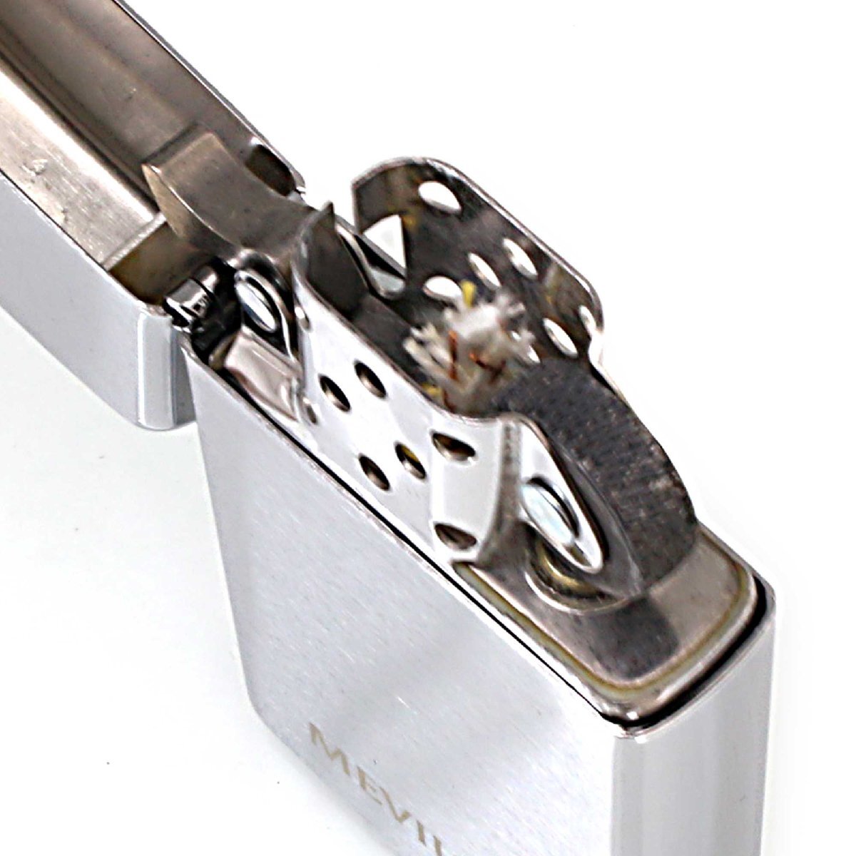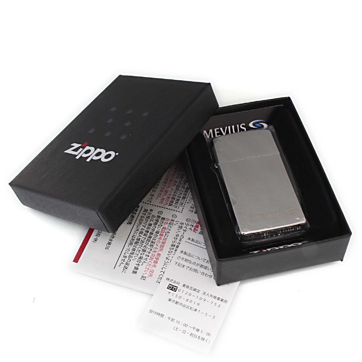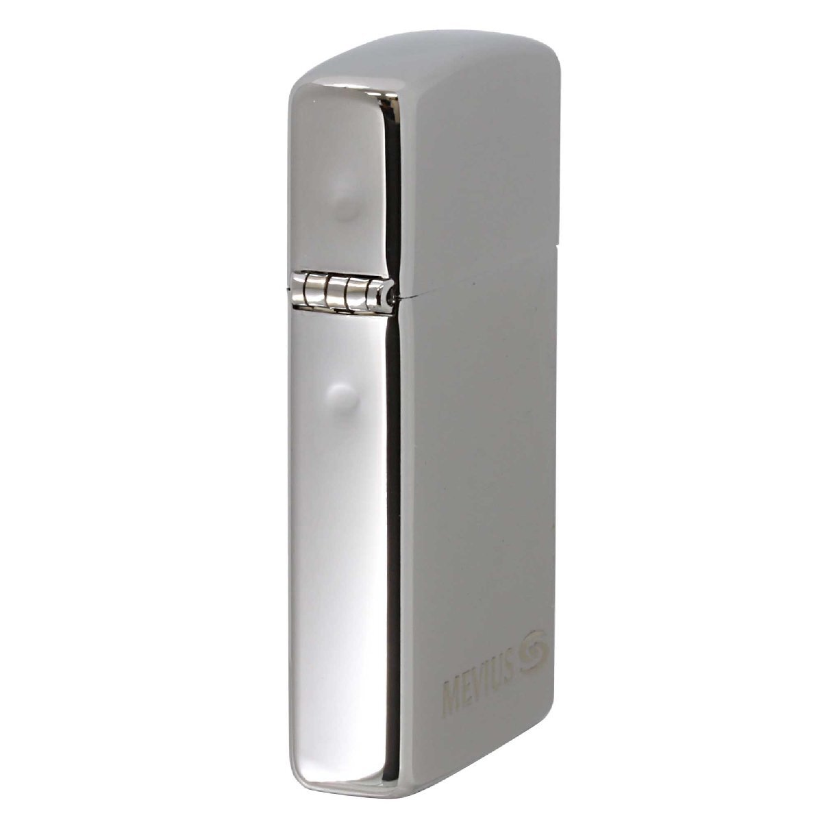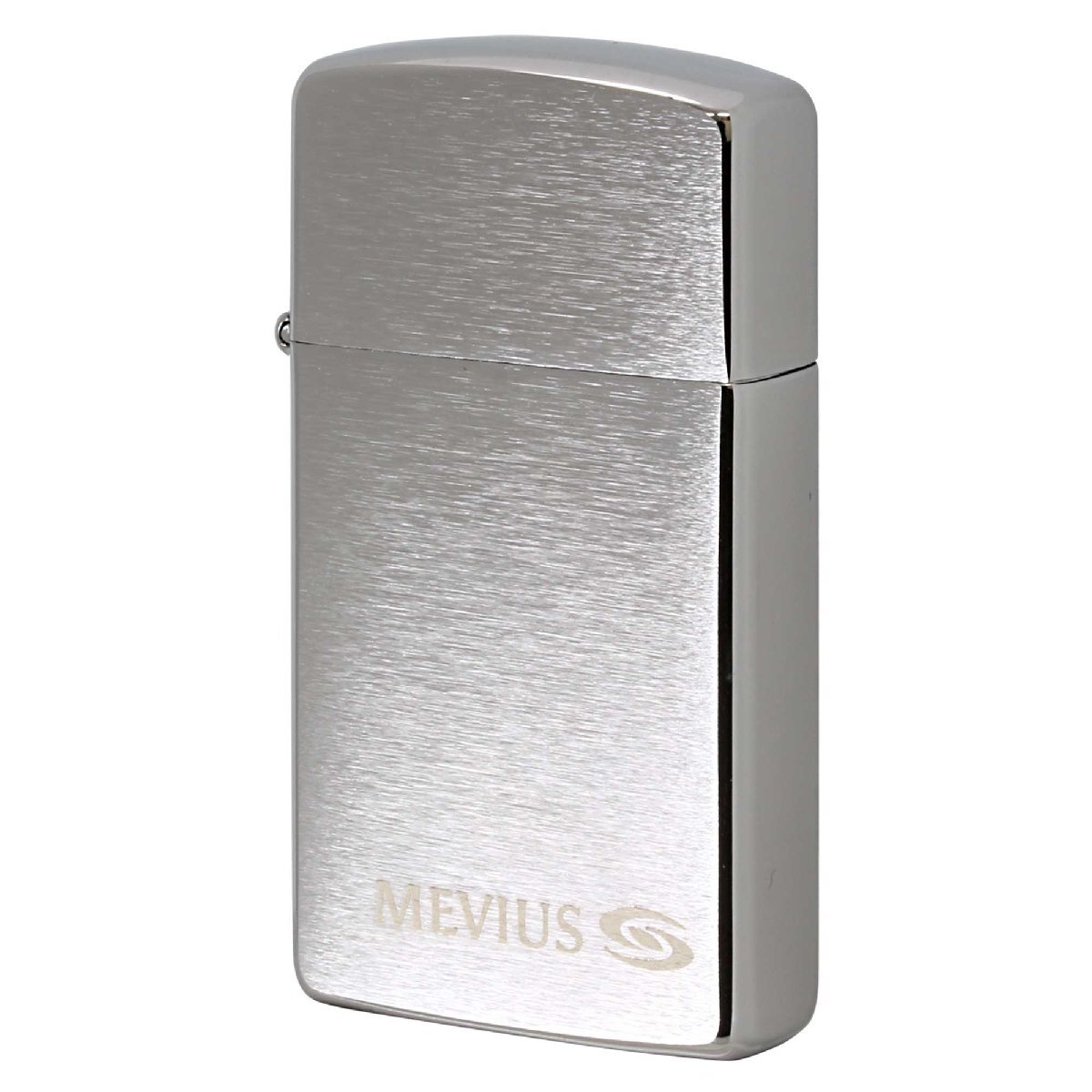 タバコ銘柄Mevius(メビウス)のZIPPOライターです。懸賞のWチャンス品。ブラッシュドクロームのスリムにレーザー彫刻でロゴマークがデザインされています。