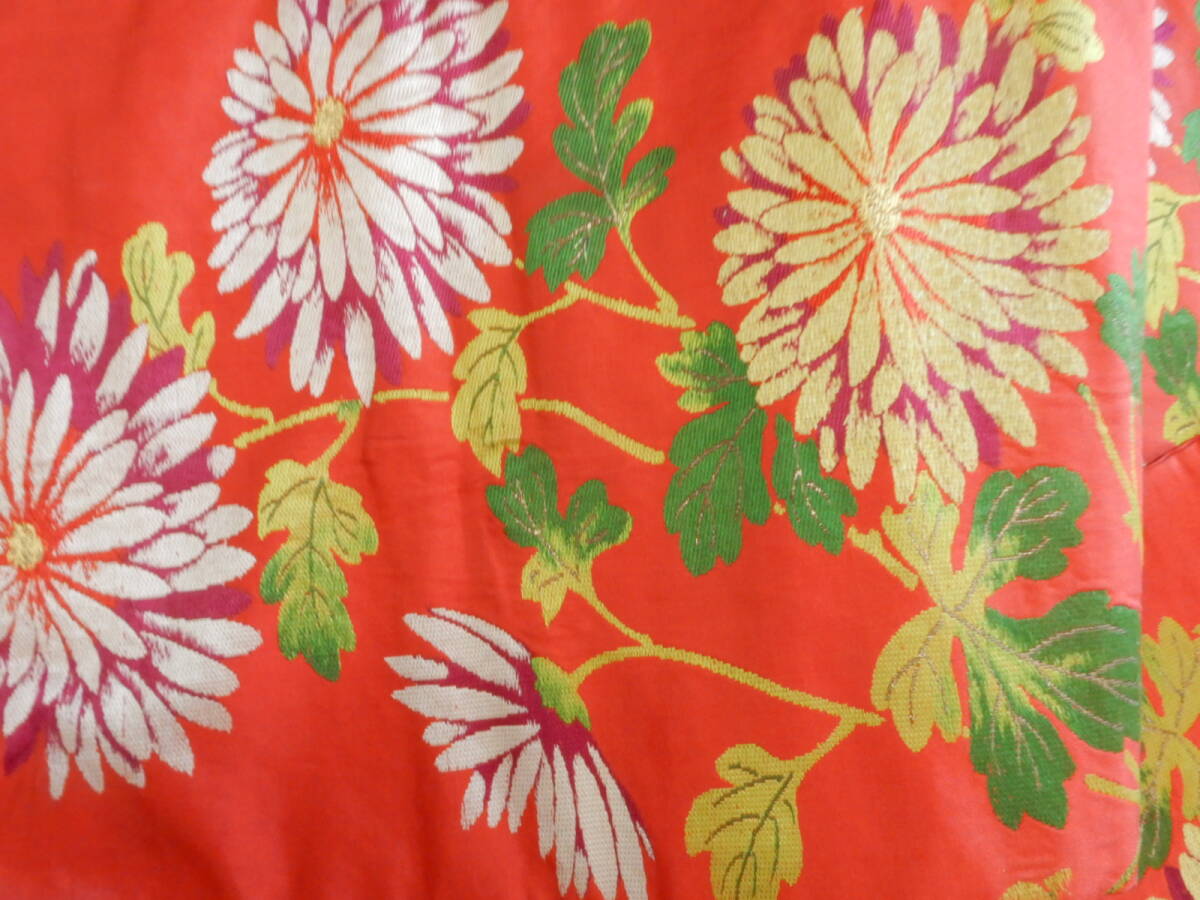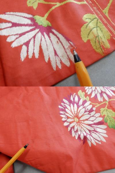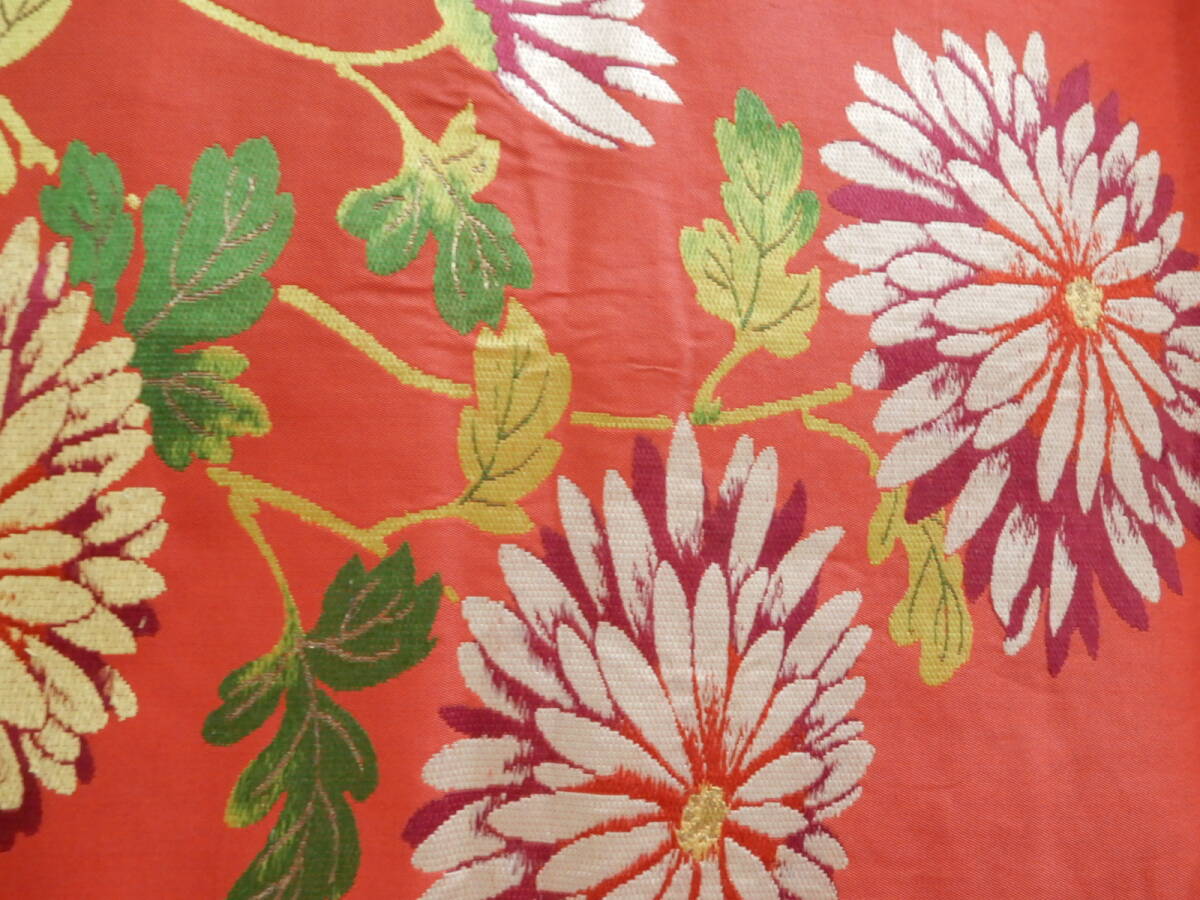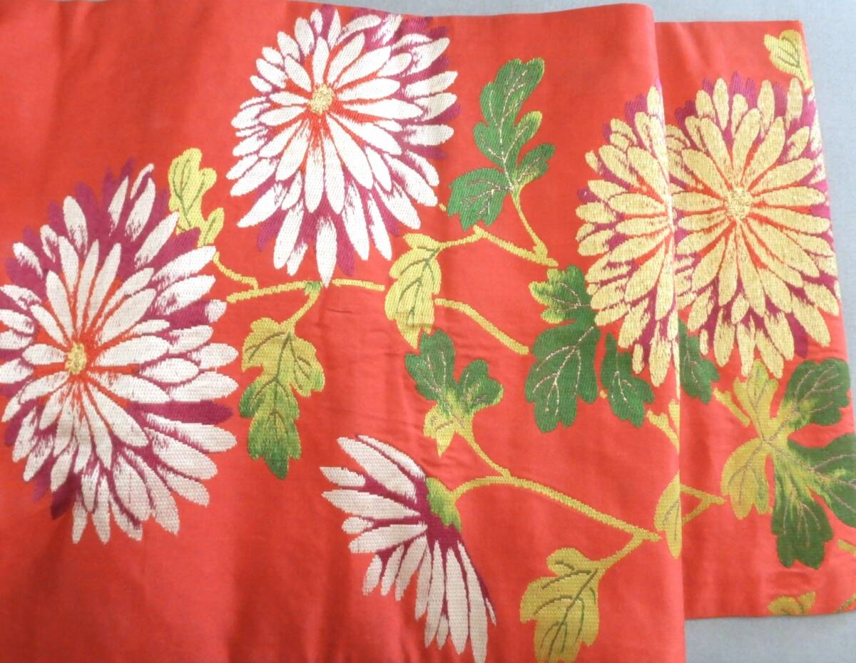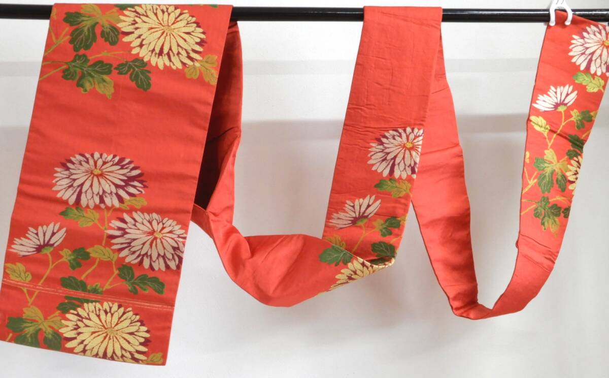 <銀の斧>正絹・アンティーク名古屋帯・昭和レトロ帯・和名 火色・赤色に菊花