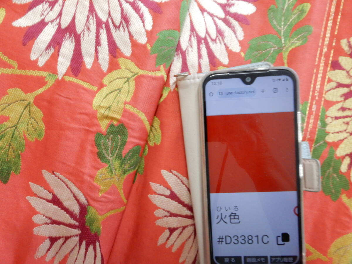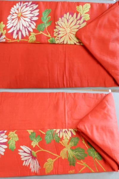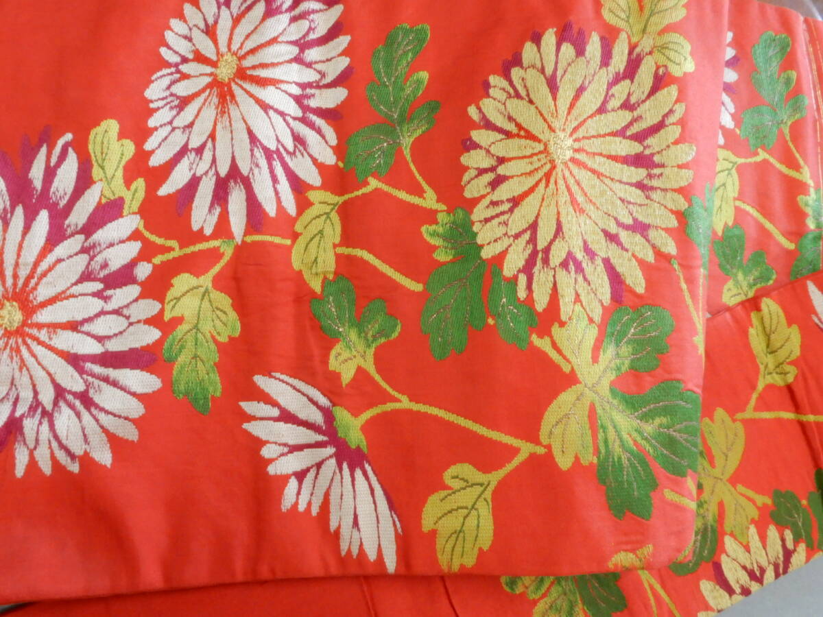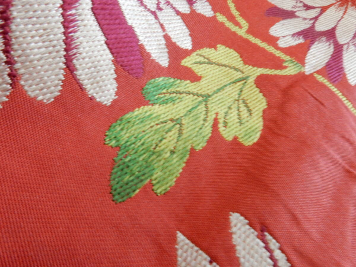 <銀の斧>正絹・アンティーク名古屋帯・昭和レトロ帯・和名 火色・赤色に菊花