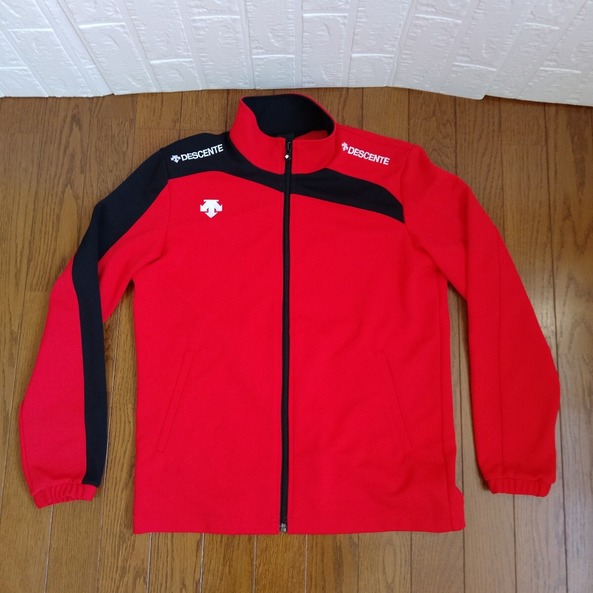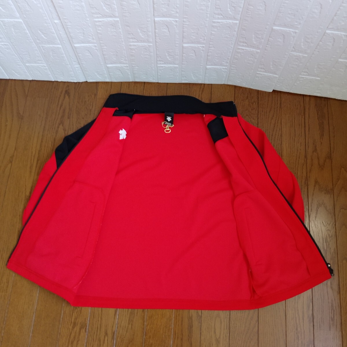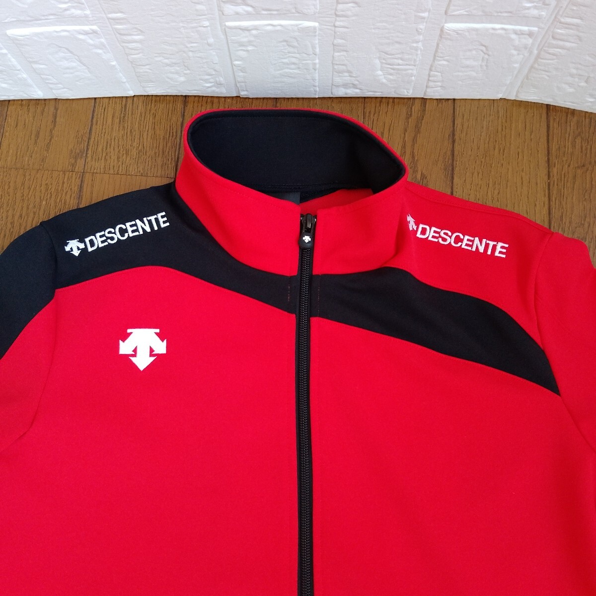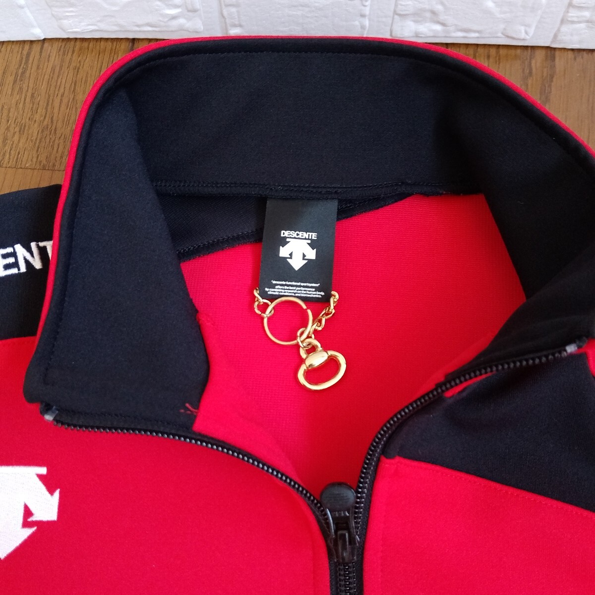 DESCENTE レッド ブラック 長袖フルジップジャケットです。ネックのタグ部分にゴールドな金具、右肩から袖口、左肩甲骨部分、右ネック後ネック真中まで黒の切替、左右肩に『DESCENTE』の白の刺繍、右胸にもデサントの矢印下向きのロゴ刺繍がデザインされています。