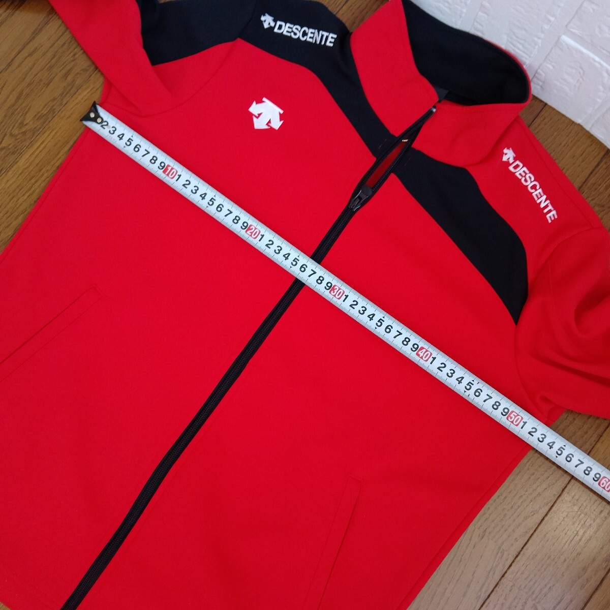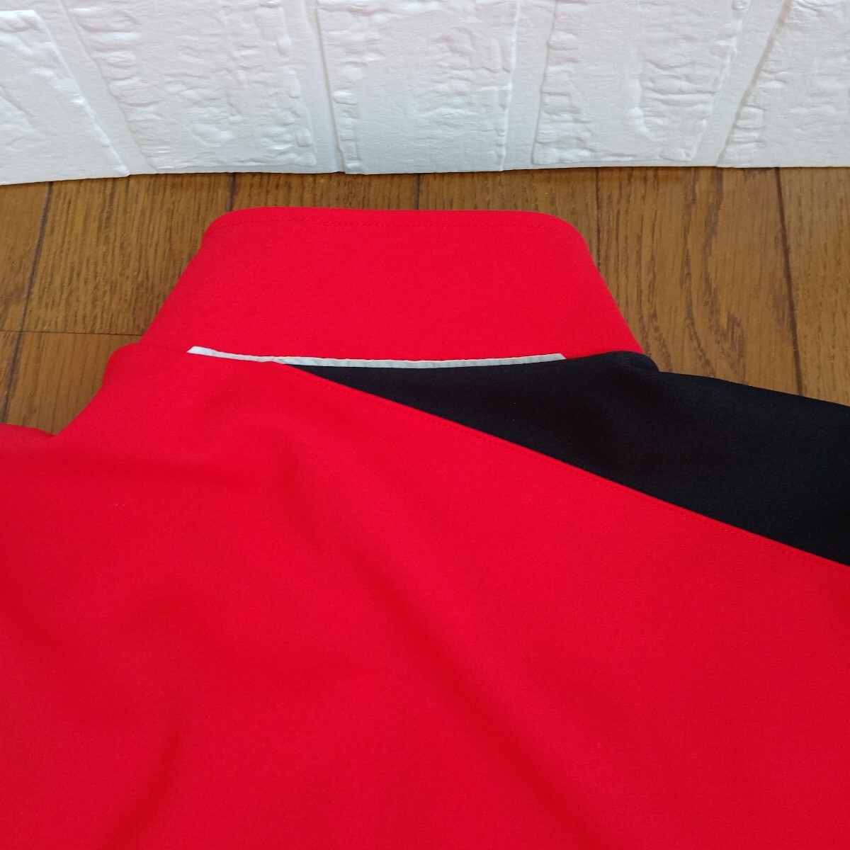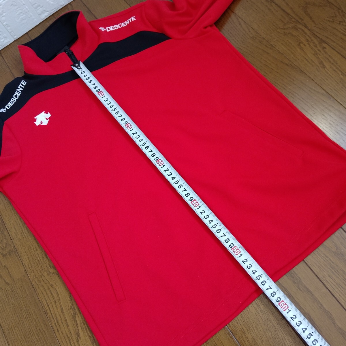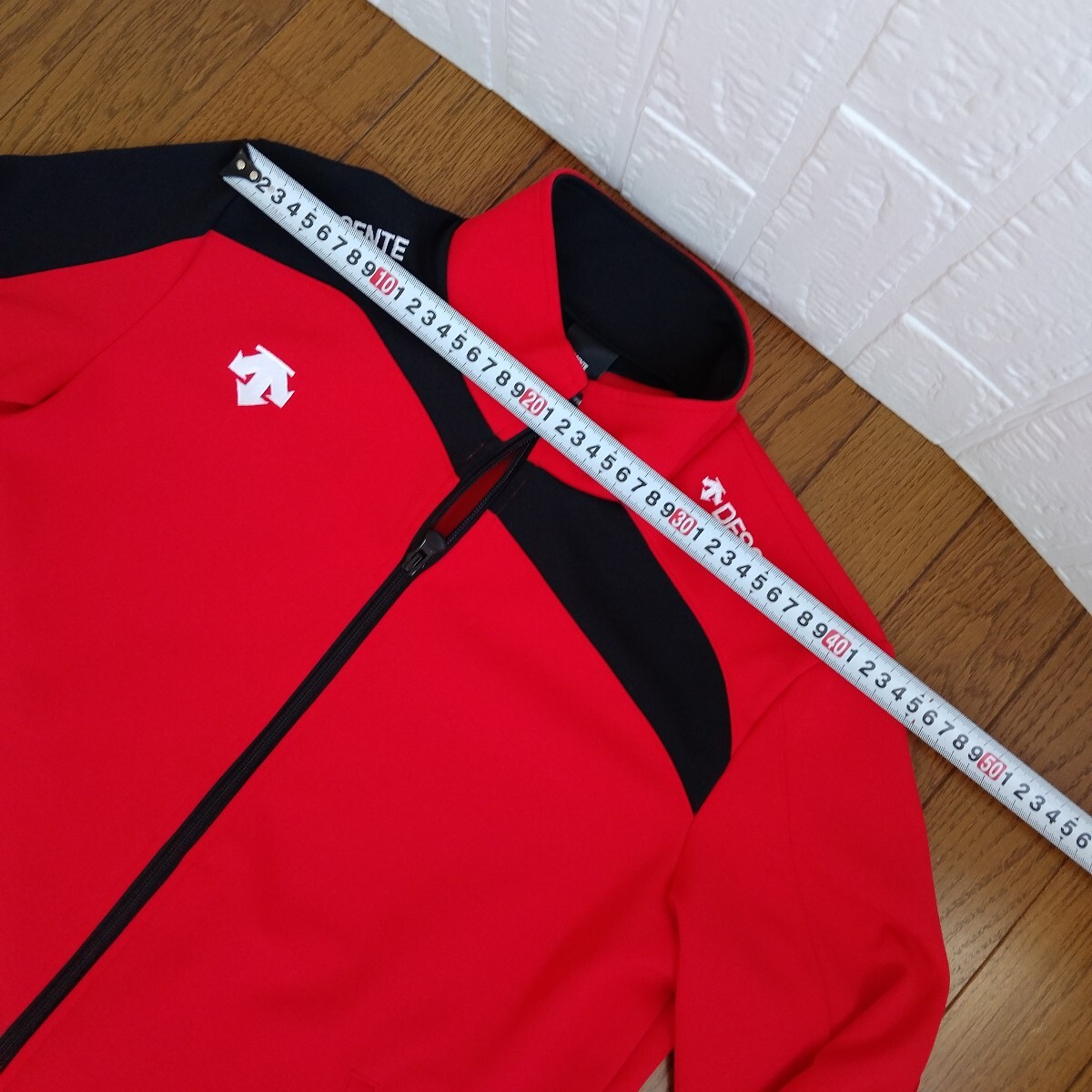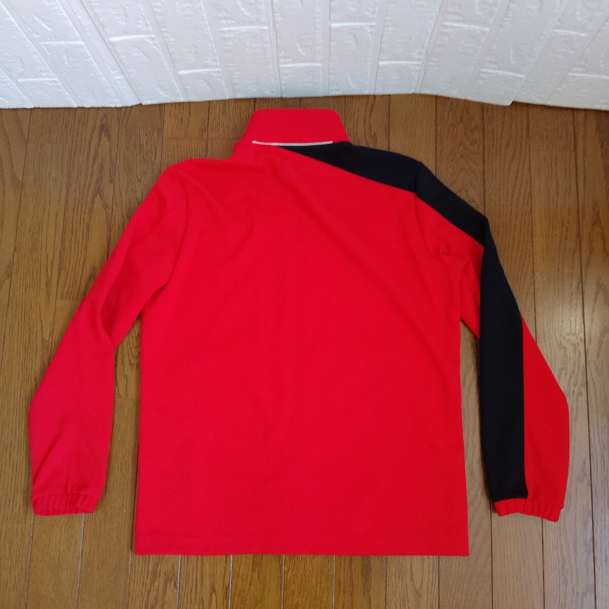 DESCENTE レッド ブラック 長袖フルジップジャケットです。ネックのタグ部分にゴールドな金具、右肩から袖口、左肩甲骨部分、右ネック後ネック真中まで黒の切替、左右肩に『DESCENTE』の白の刺繍、右胸にもデサントの矢印下向きのロゴ刺繍がデザインされています。