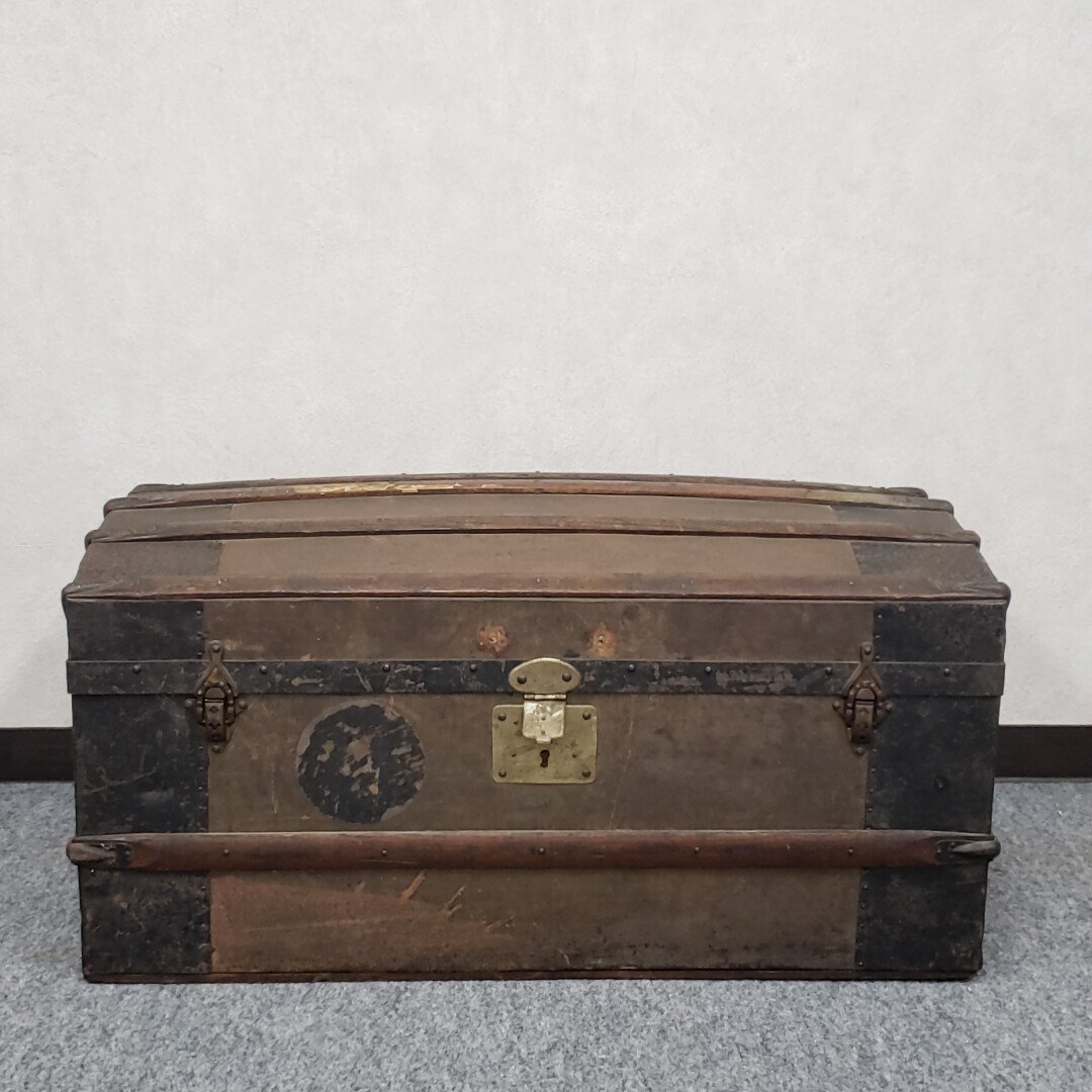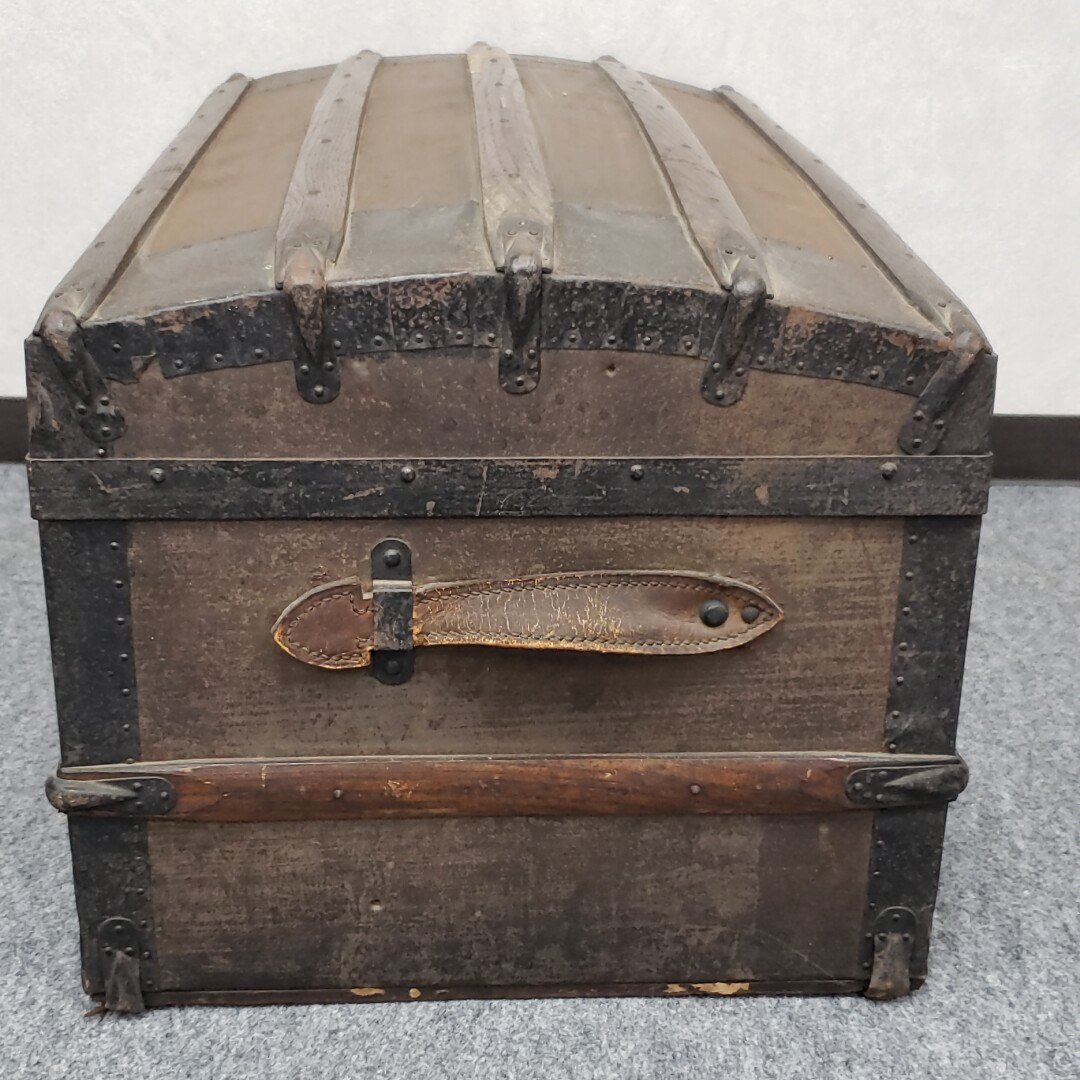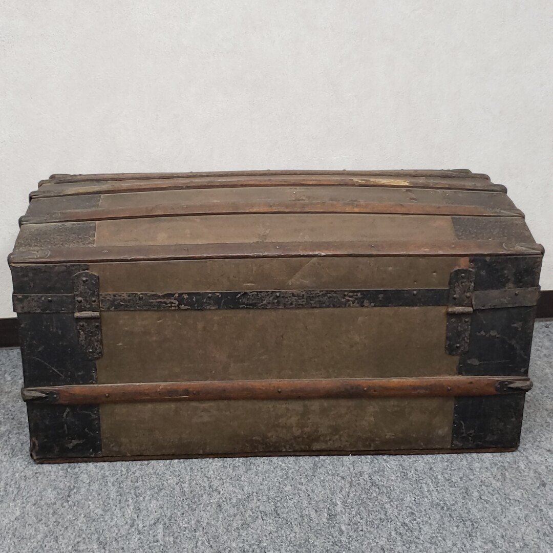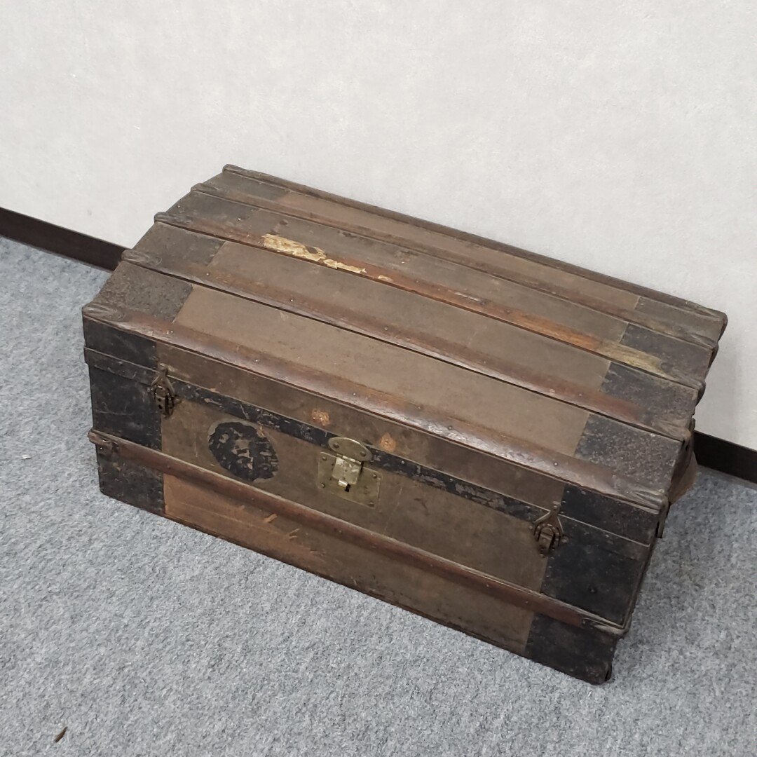 トランクは木製で全体が鉄板がはられ持ち手は皮で出来ていてしっかりした作りです。現状お渡しになります。 | 古い時代の雰囲気や船旅のロマンを感じさせるトランクです。インテリアやディスプレイいかがでしょうか。 発送サイズ |