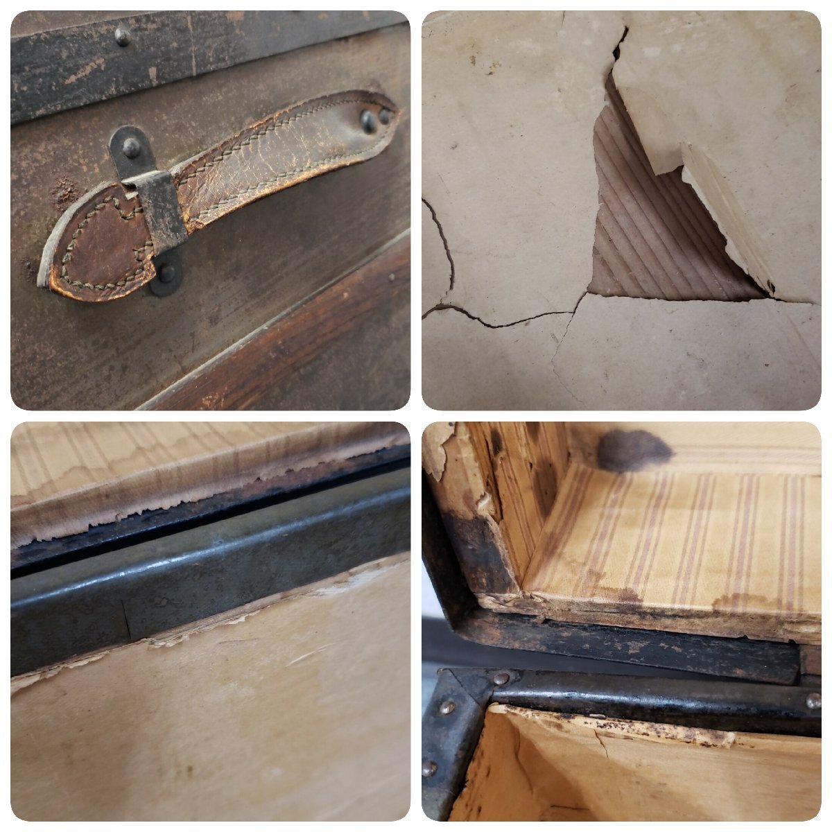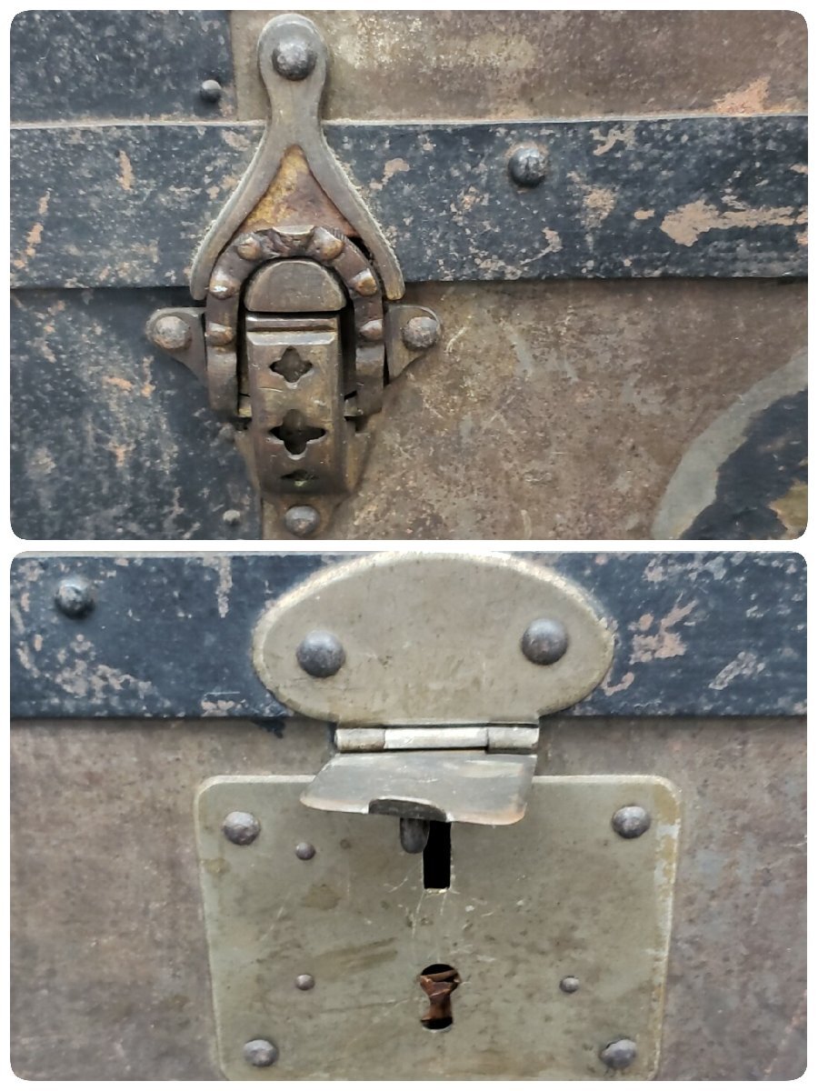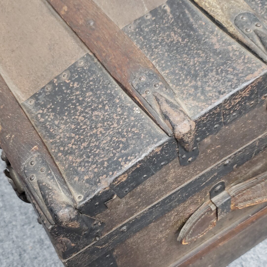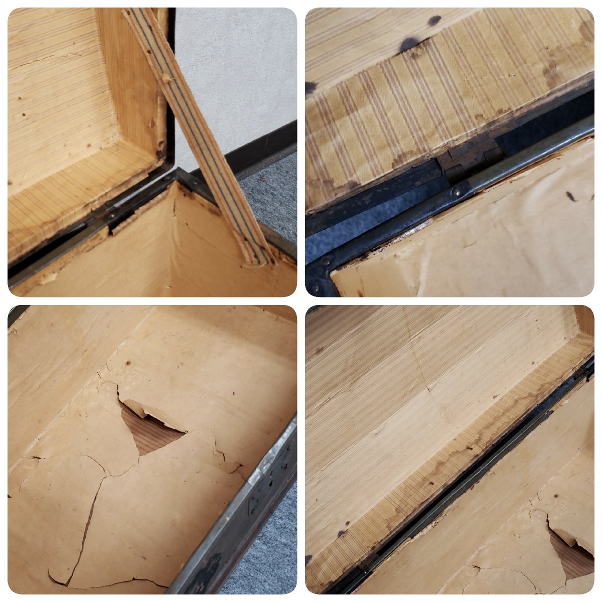 トランクは木製で全体が鉄板がはられ持ち手は皮で出来ていてしっかりした作りです。現状お渡しになります。 | 古い時代の雰囲気や船旅のロマンを感じさせるトランクです。インテリアやディスプレイいかがでしょうか。 発送サイズ |