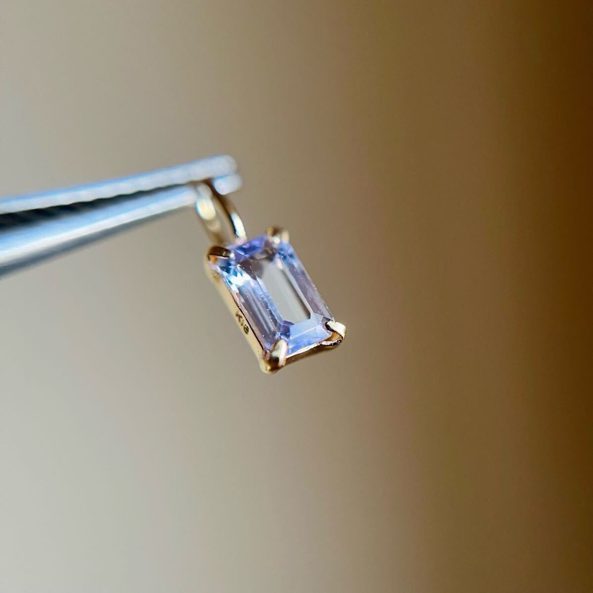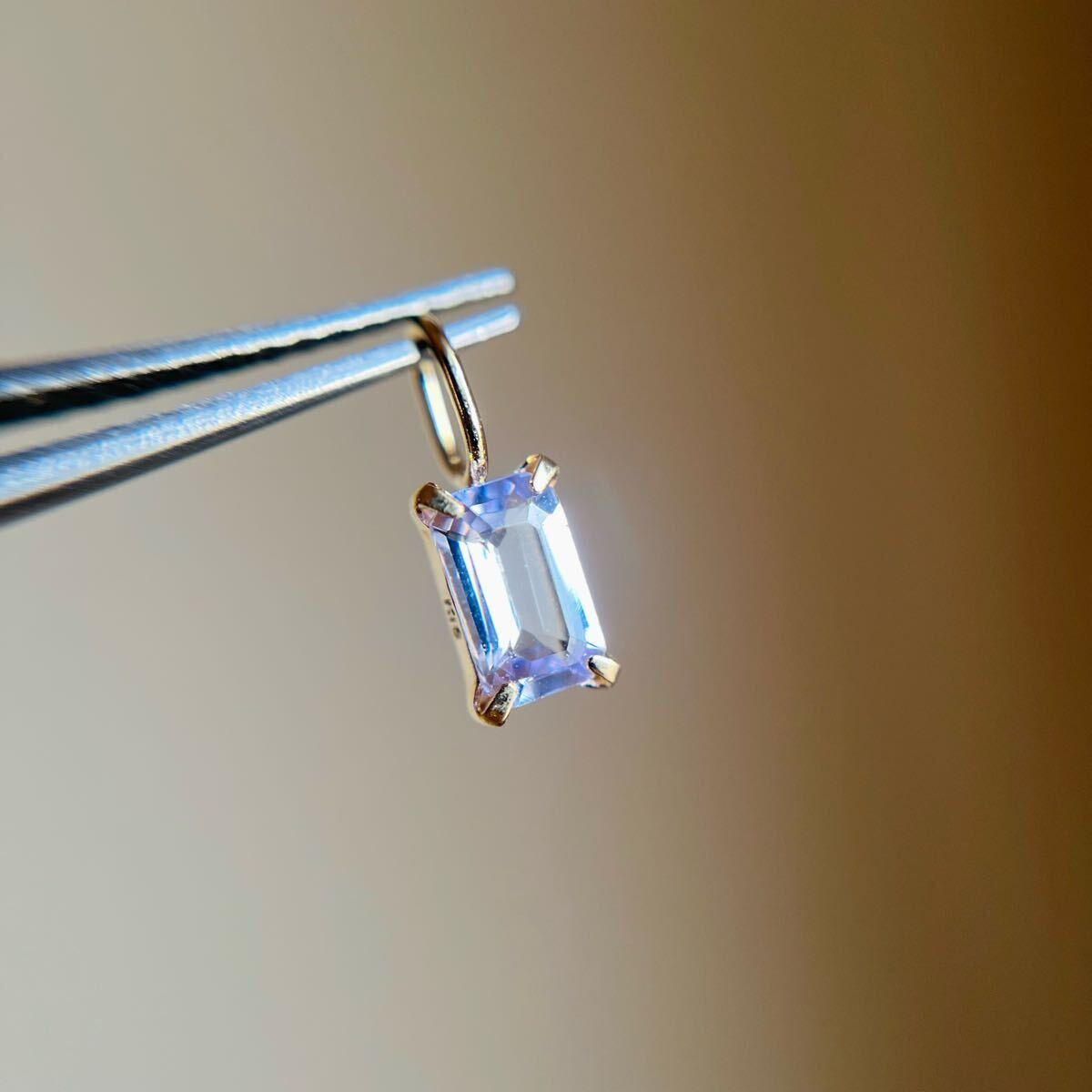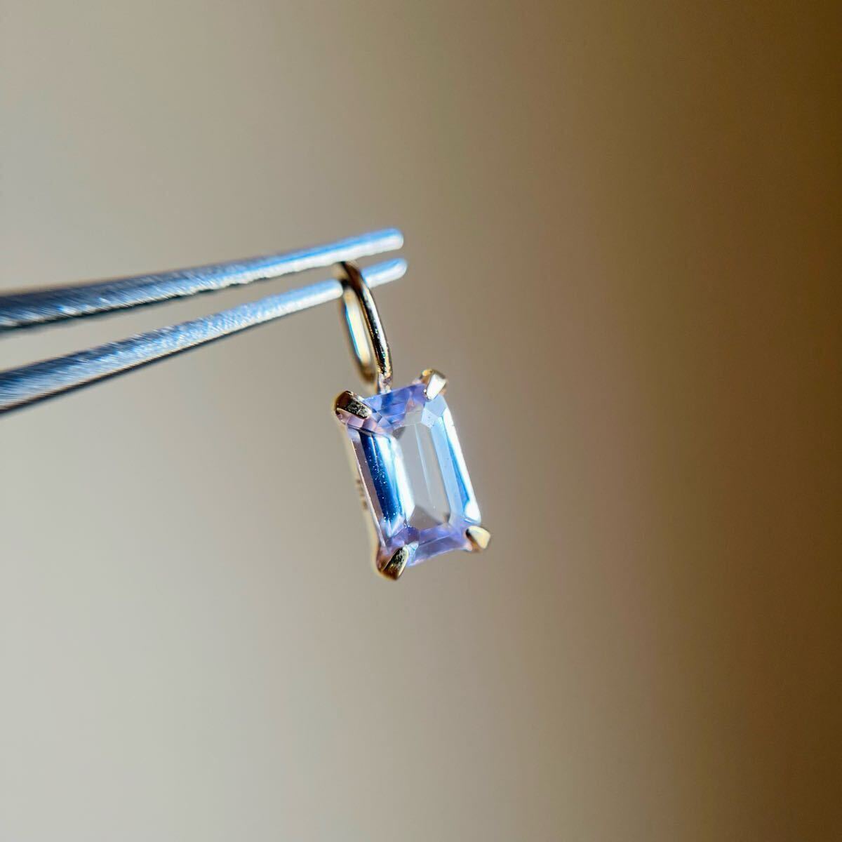 パープリッシュブルーがキラリと輝く天然タンザナイトのバケットカットのペンダントトップです。