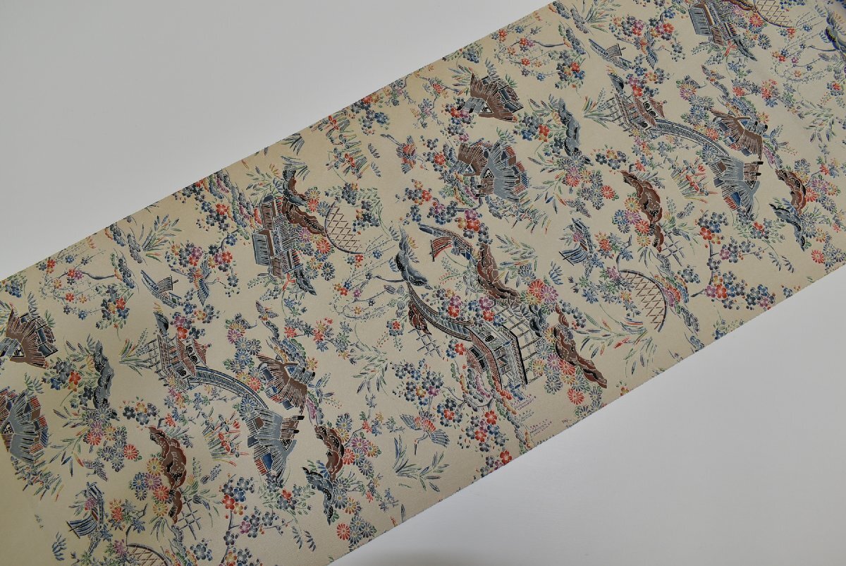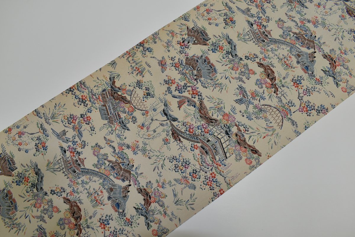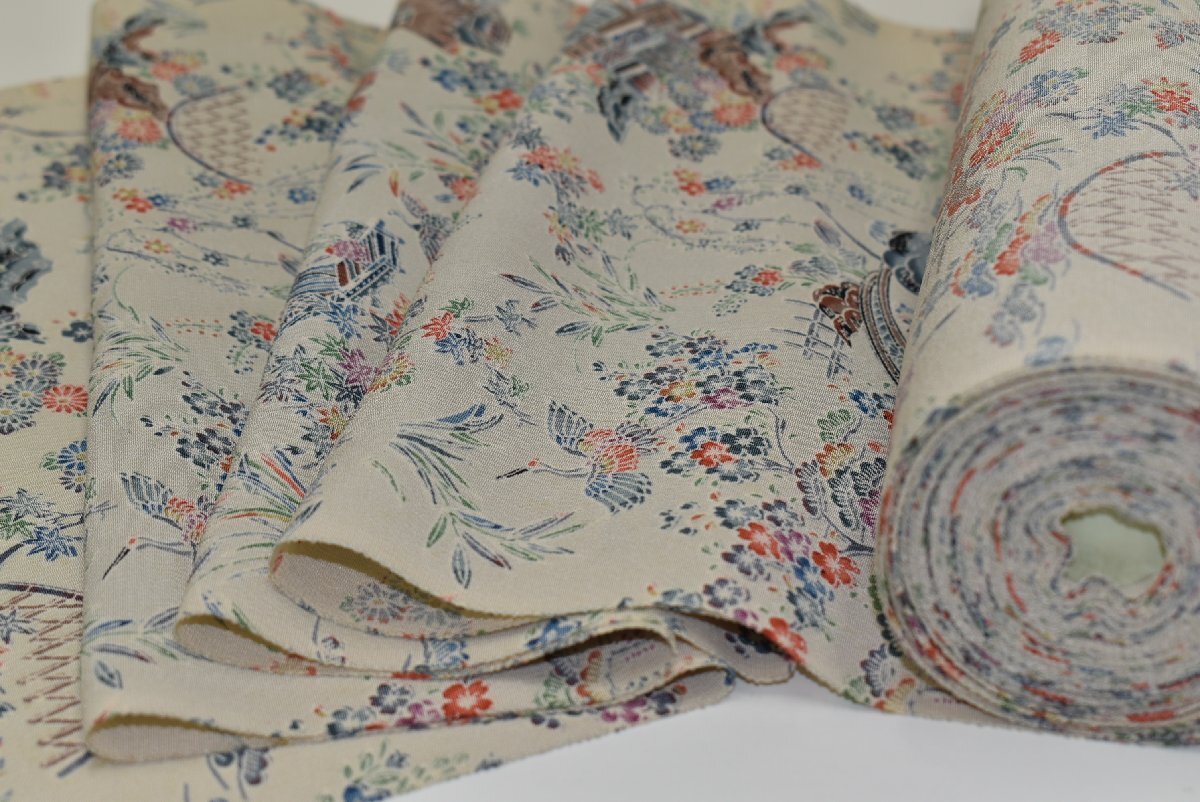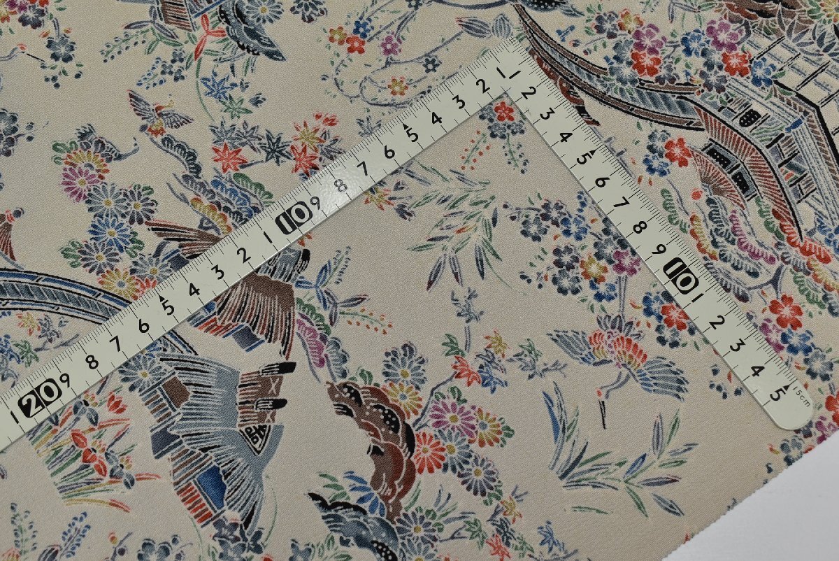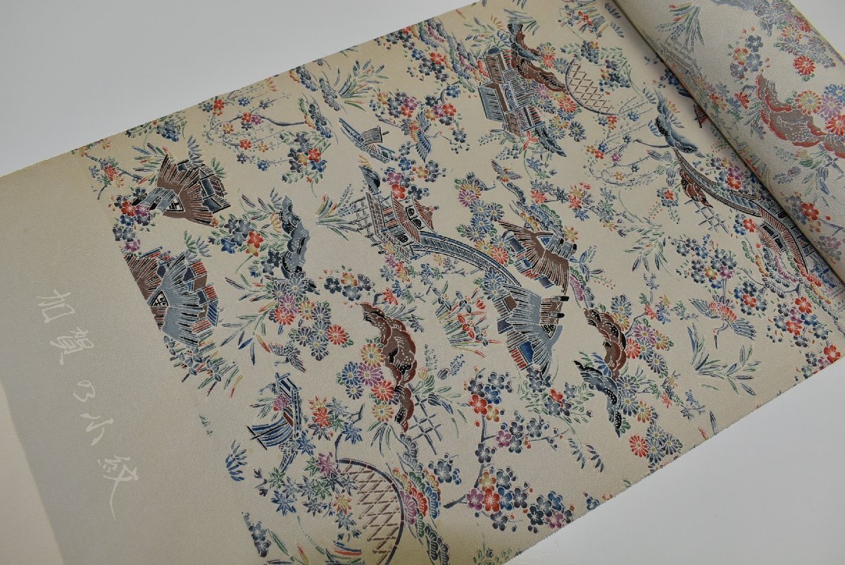 【ちどりや】未使用品 美品 正絹 縮緬 小紋 加賀友禅染め 着尺反物 茶屋辻文様 四季の花 鶴 渋薄水色 Y352