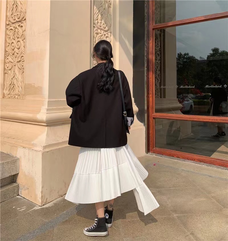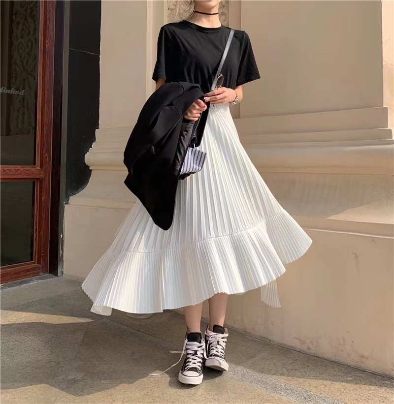 アシンメトリー ランダム プリーツ スカート ロング ホワイト 白 モノトーン フレアシルエット L