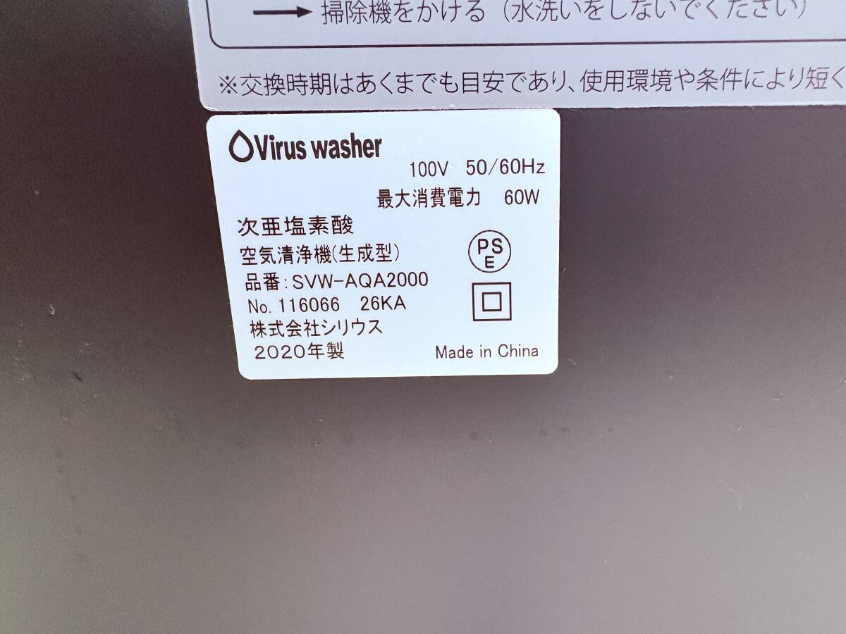 | ■CH0447/シリウス/次亜塩素酸空気清浄機/Viruswasher ウイルスウォッシャー/SVW-AQA2000(S)/2020年製■ | |