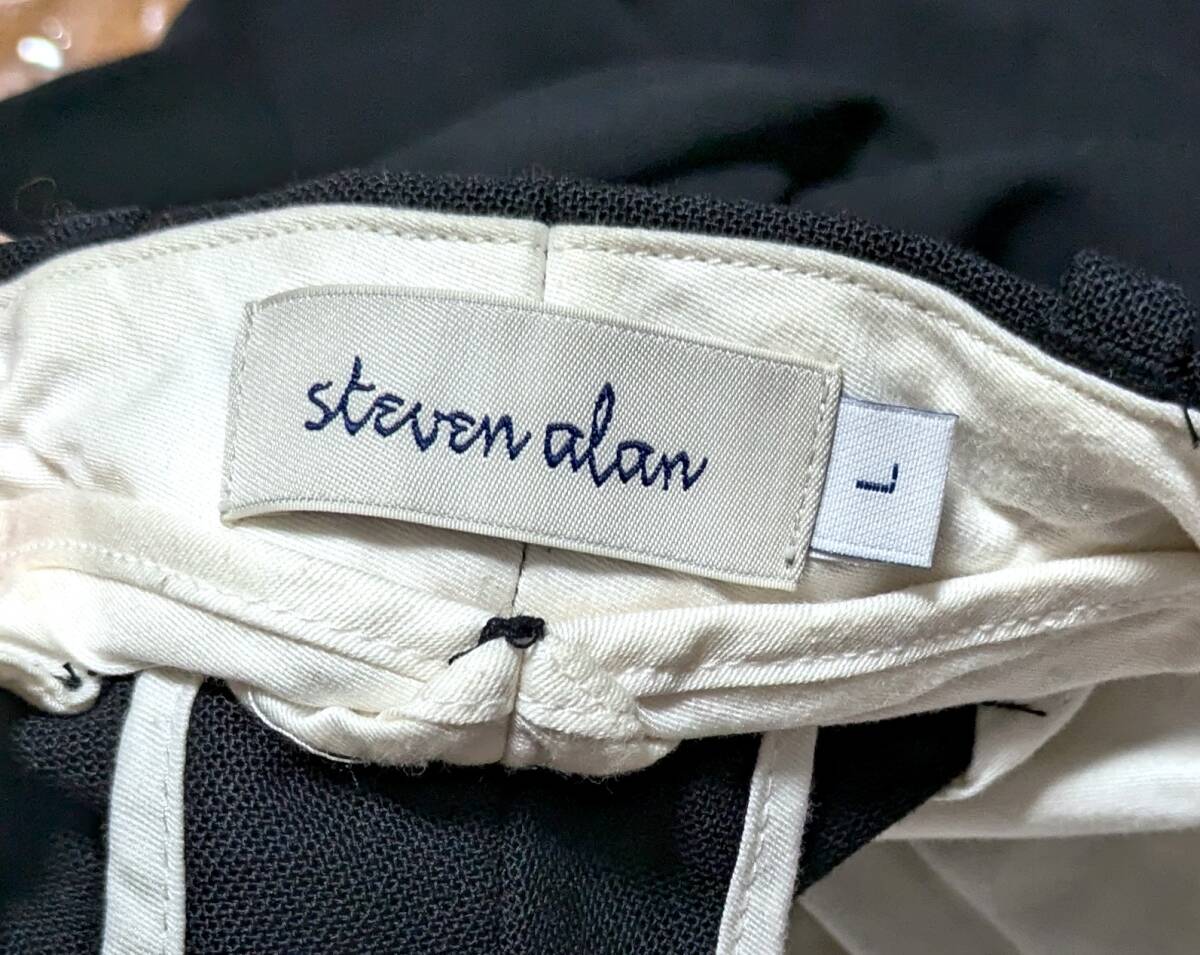 ブランド:スティーブン アラン。春夏スラックス。カジュアルに履ける大人のキレイめパンツです。状態特に目立つ傷汚れなく状態良いかと思います。ブラック。Lサイズw85,股上31,股下66,ワタリ幅33,裾幅19[cm]。