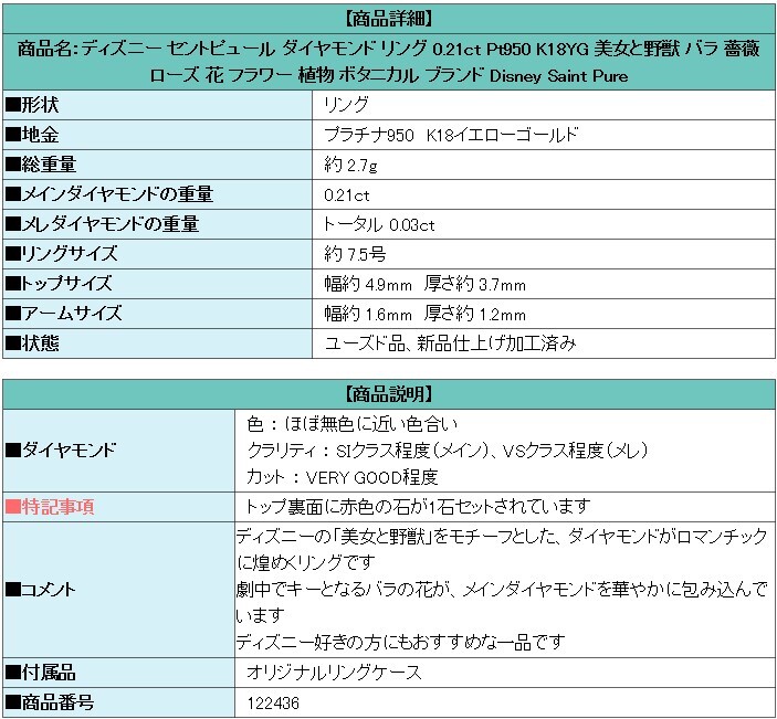 | 商品名:ディズニー セントピュール ダイヤモンド リング 0.21ct Pt950 K18YG 美女と野獣 バラ 薔薇 ローズ 花 フラワー 植物 ボタニカル ブランド Disney Saint Pure | |
