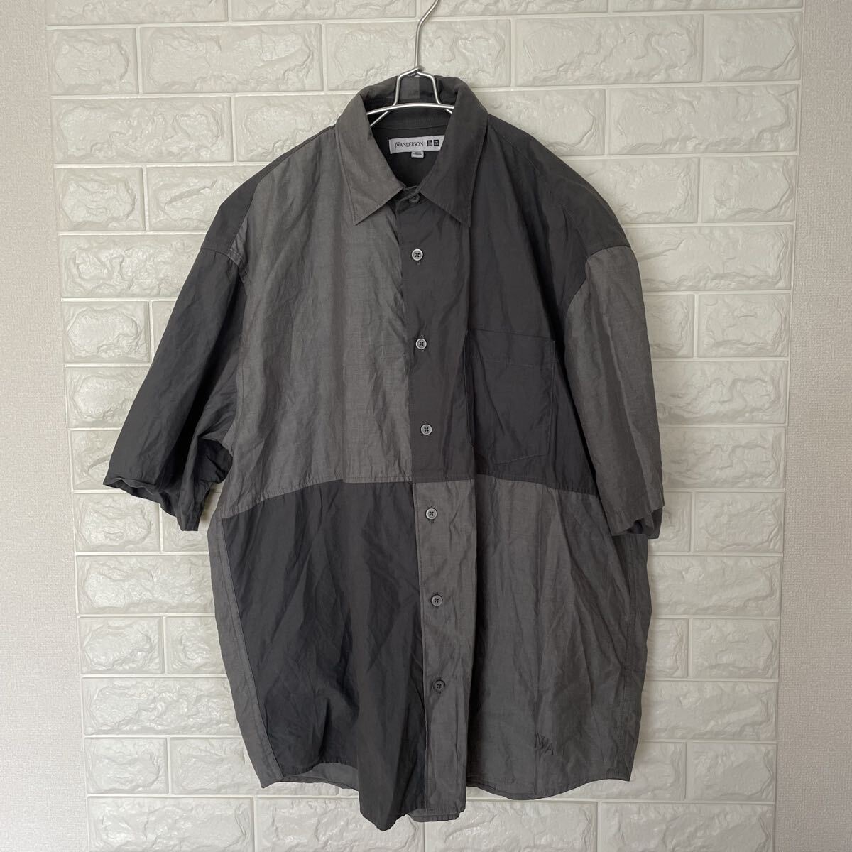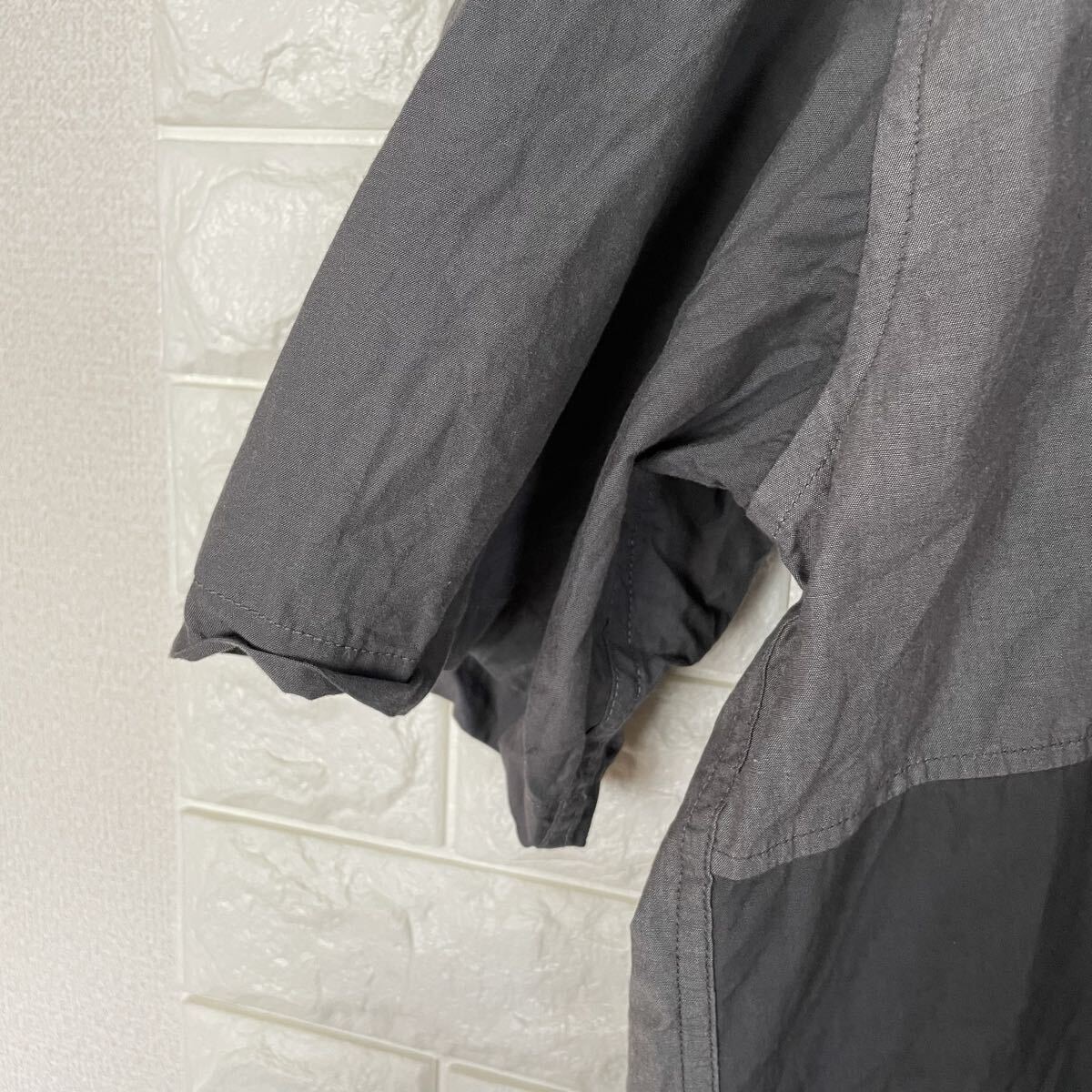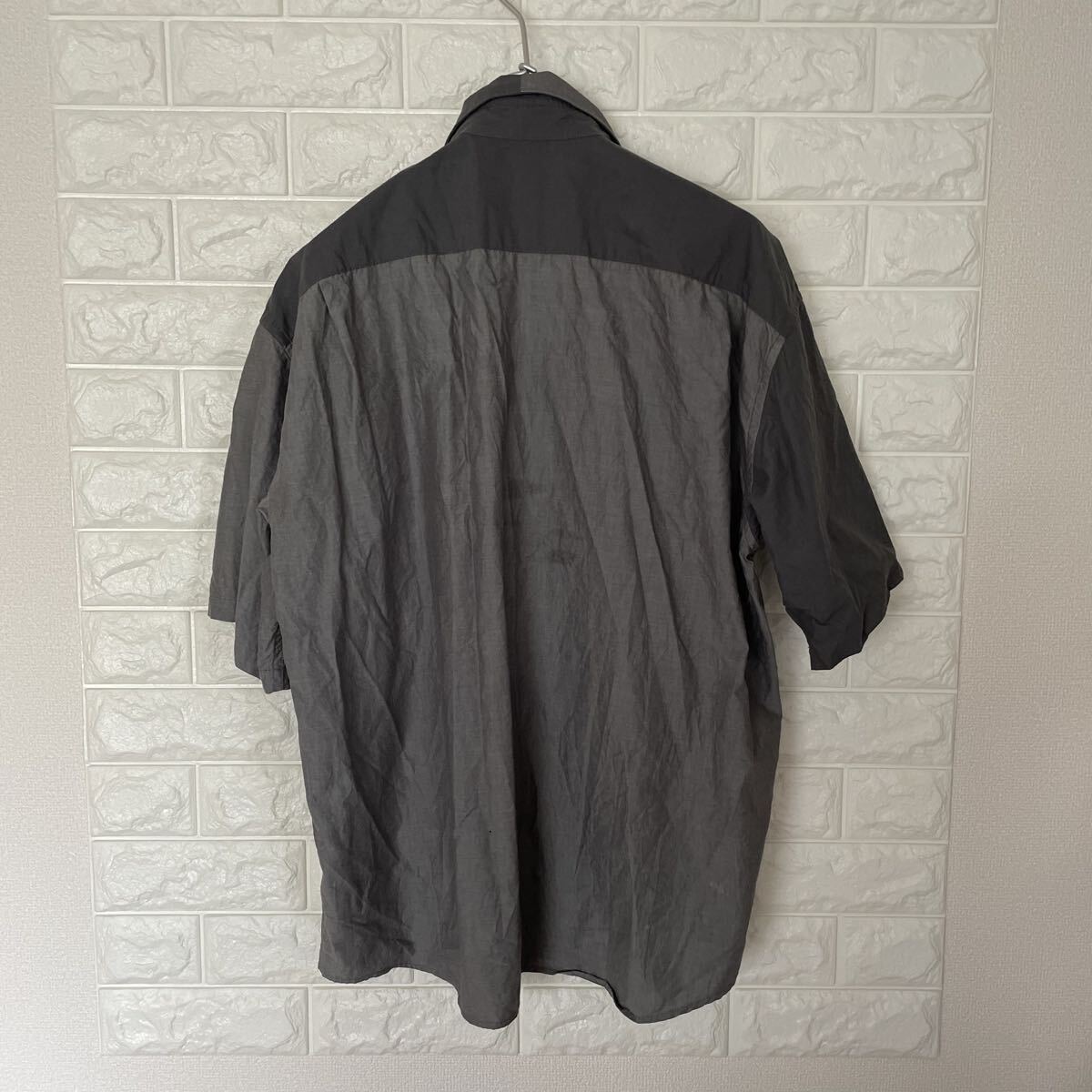 グレー系の半袖シャツ、ポケット付きでスタイリッシュなデザイン。