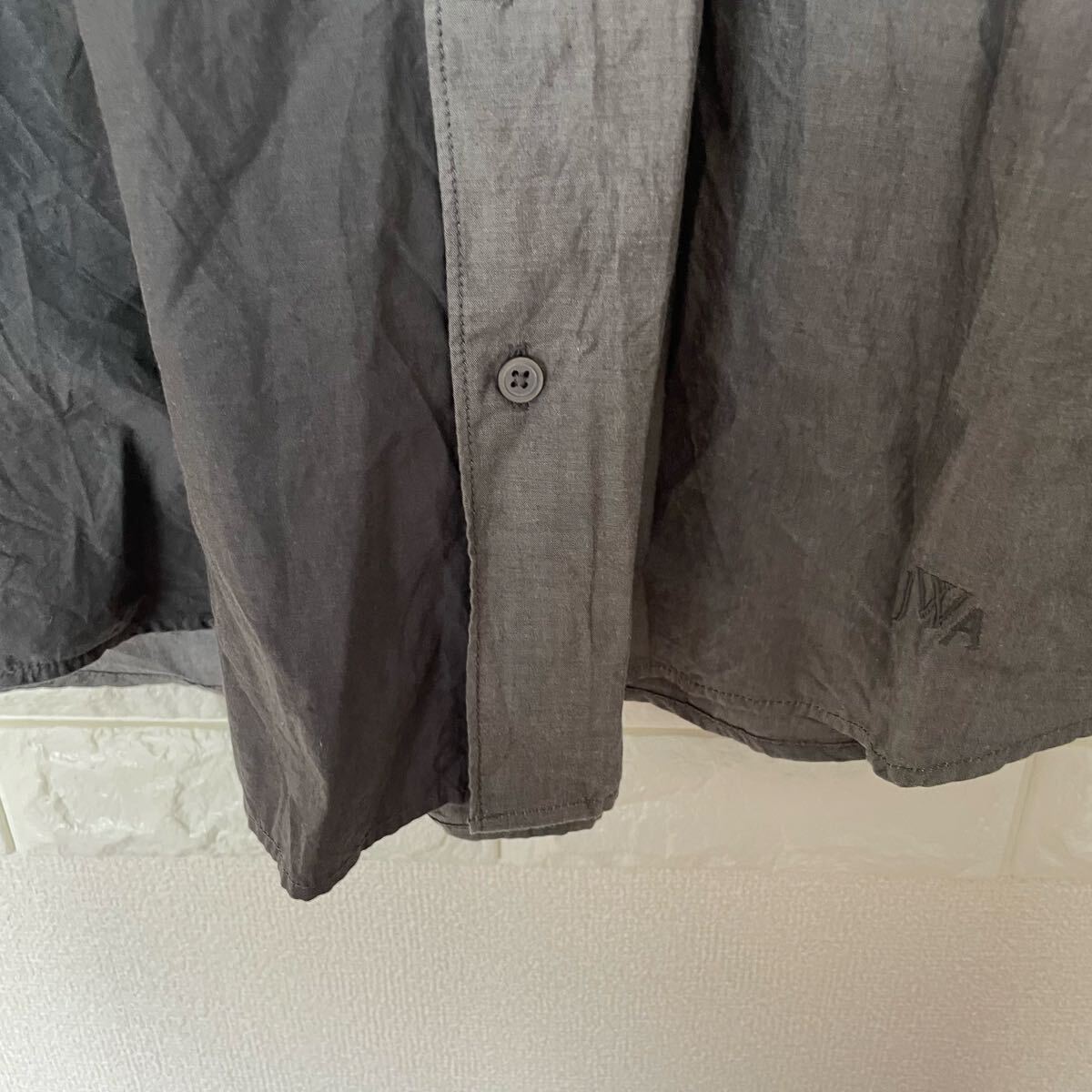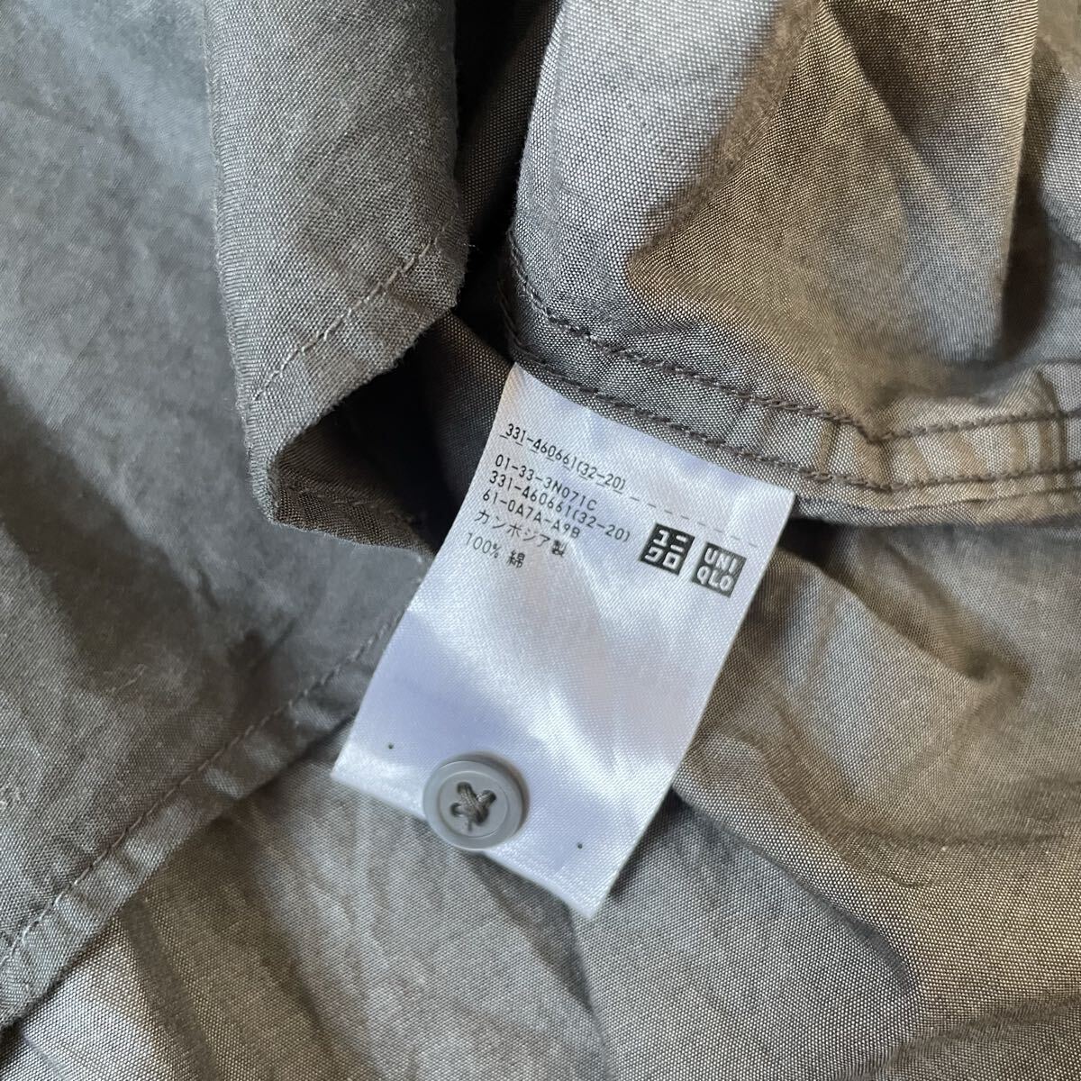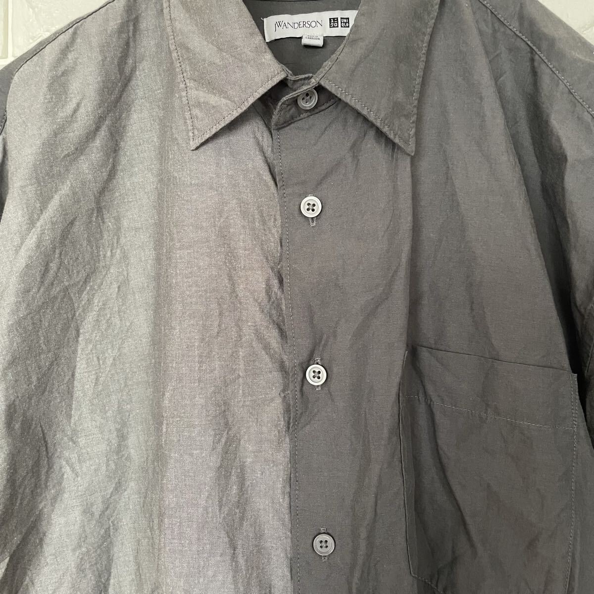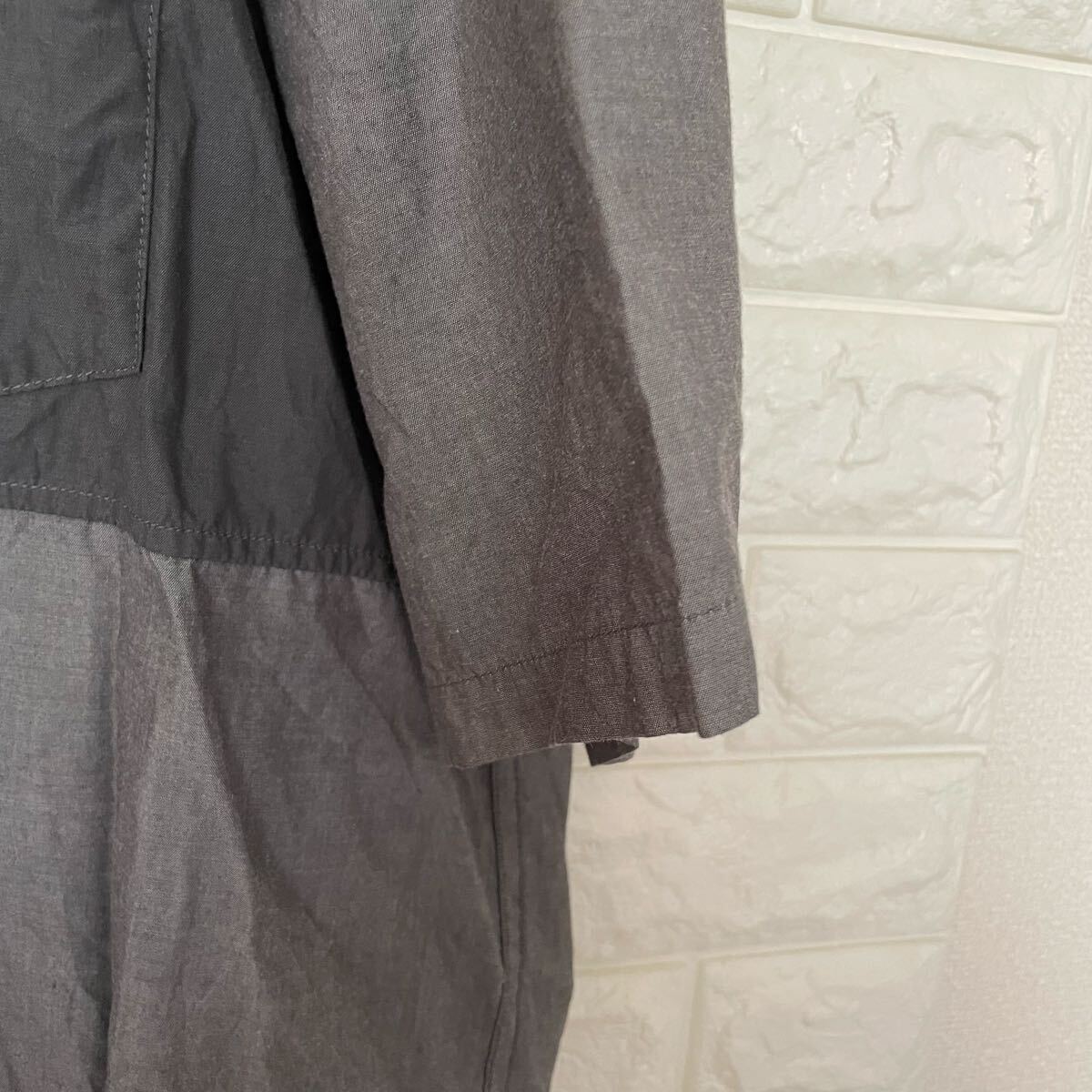 グレー系の半袖シャツ、ポケット付きでスタイリッシュなデザイン。