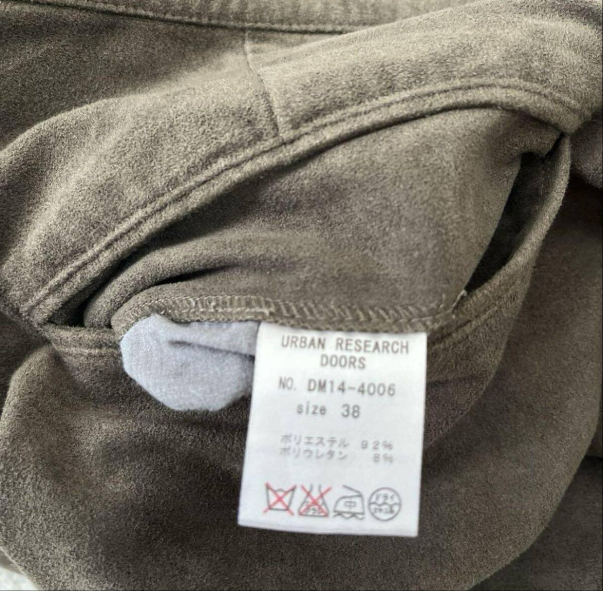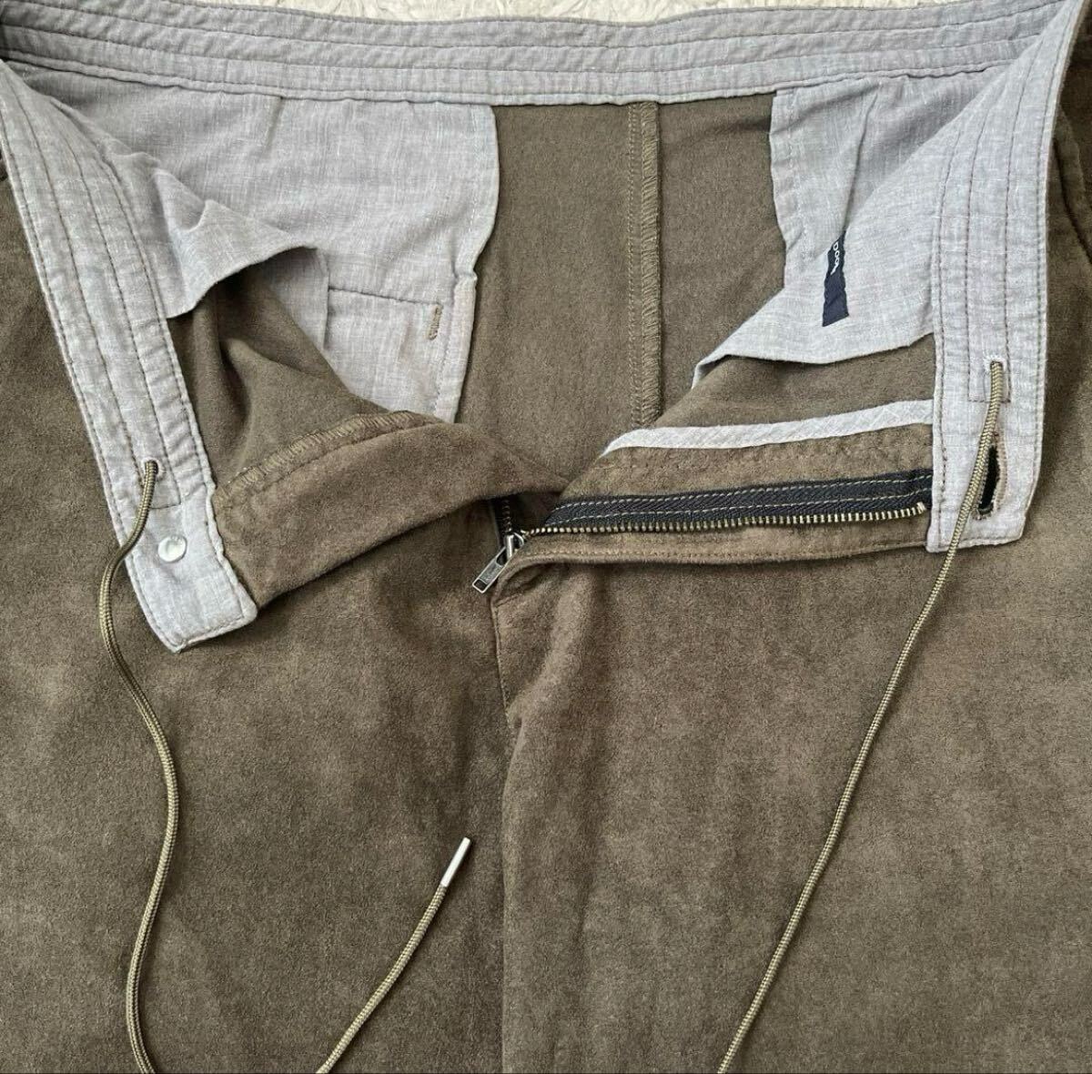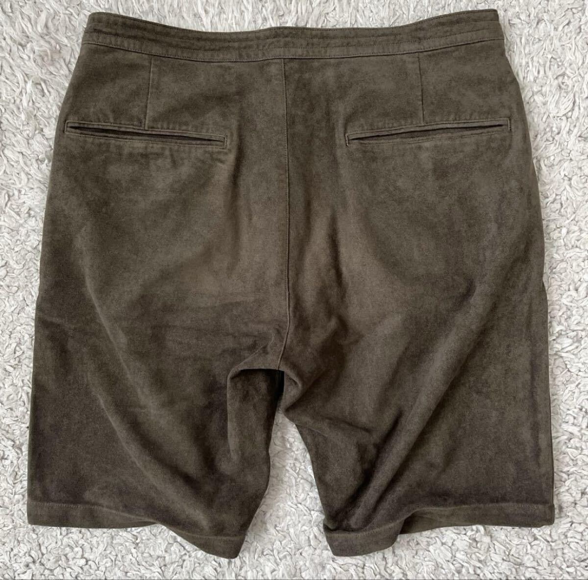 スエード風のブラウンショートパンツ、ドローコードとファスナー付き。