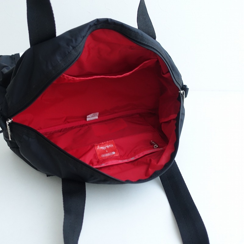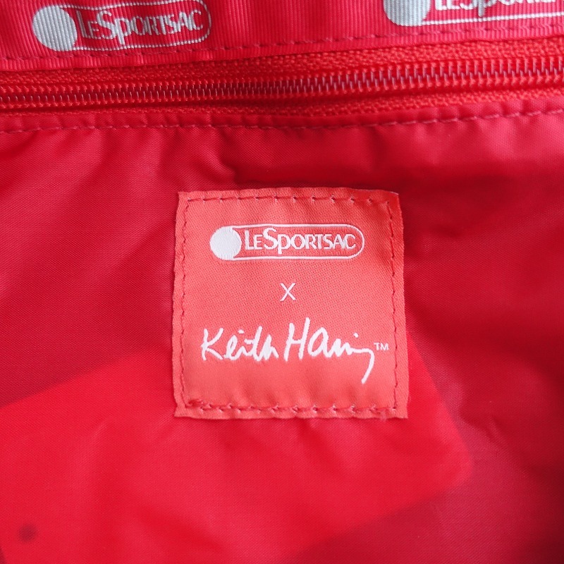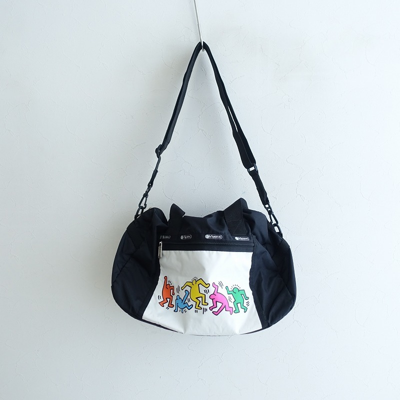 LESPORTSACのボストンバッグです。カラーはブラックで、開口はダブルファスナーです。表面にファスナーポケットが1個付きで、キースヘリングのポップイラストがプリントされたデザインです。内側はオープンポケットが2個あり、ショルダーベルトは着脱・長さ調節ができます。取り外し可能なショルダーひもが1本付属しております。 |