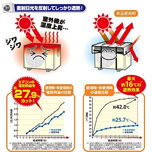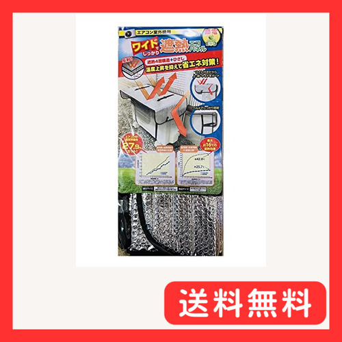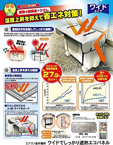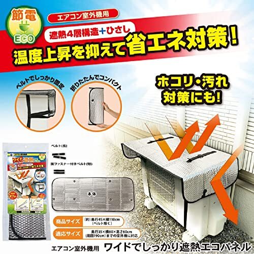 「エアコン室外機用 ワイドでしっかり遮熱エコパネル」▼4580260589850▼(商品説明)・シルバー 110x45センチメートル (x 1) 328022・商品サイズ (幅×奥行×高さ) :0.5×110.0×45.0(cm)・原産国:中国・内容量:220g・材質:本体:ポリエステル・アルミニウムパイピング部・ベルト部:ポリプロピレン100%説明 遮熱4層構造で温度上昇を抑えて省エネ対策! エアコンの電気料金を約27.9%カット!