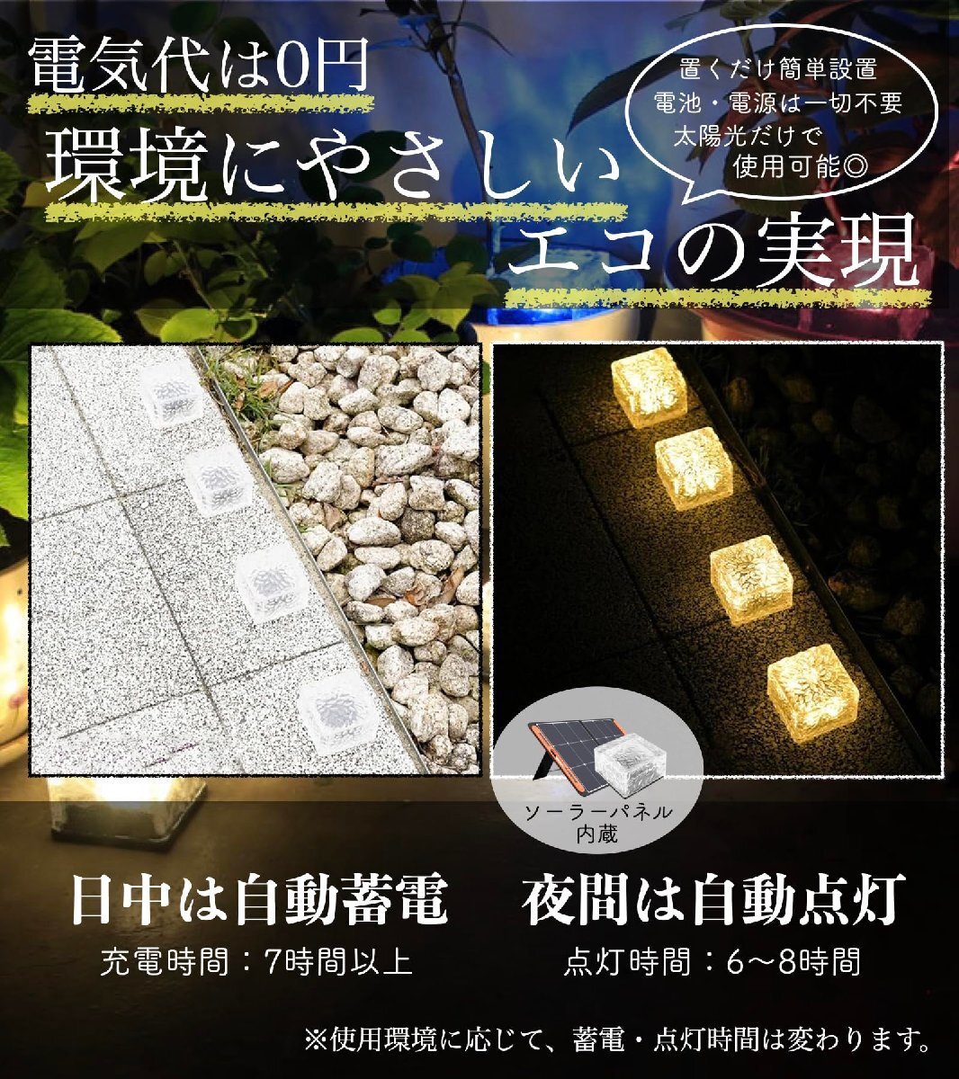 【電気代0円!自動点灯】本製品は、人気の太陽光パネル充電で、電気代ゼロ!!電源や配線が不要な環境にやさしい経済的なソーラーライトです。ソーラーパネルは太陽光を電気エネルギーに変換し、内蔵の充電池に蓄電します。夜になると、日中蓄電した電気を使ってライトは自動的に点灯します。ワンボタン設計!初めて使用する場合は内部のスイッチボタンを押すだけで、ライトは自動的にオン/オフになり、毎日手動でオン/オフする必要はありません。駐輪場や玄関周り、通路や階段などにお勧めのガーデンライトです。(1日を通して日当たりの良い場所に設置してください)※曇りの日は充電時間が足りず、充電効率や充電時間が低下する場合がありますので、ご注意ください。