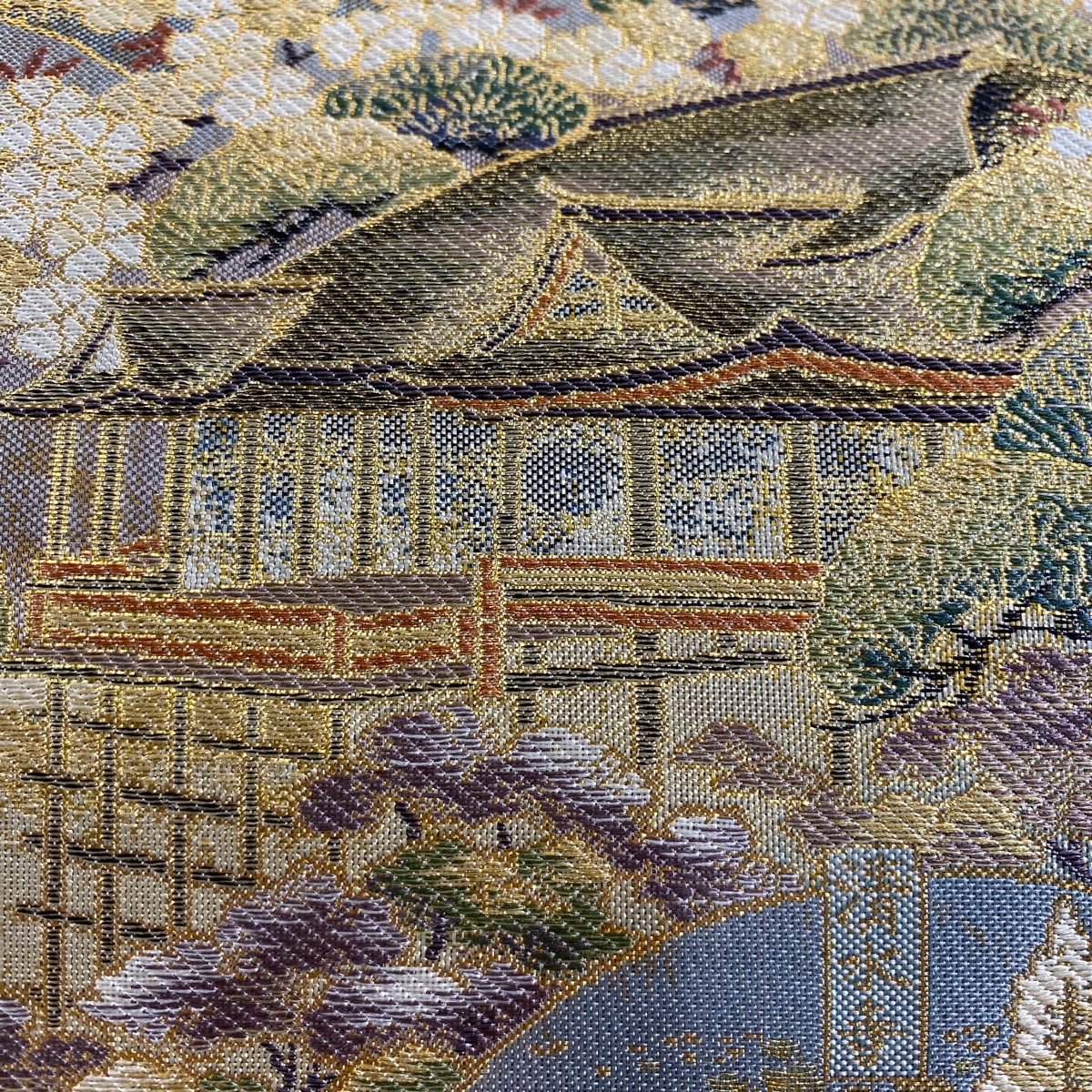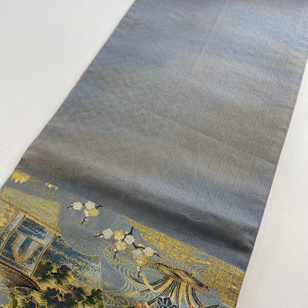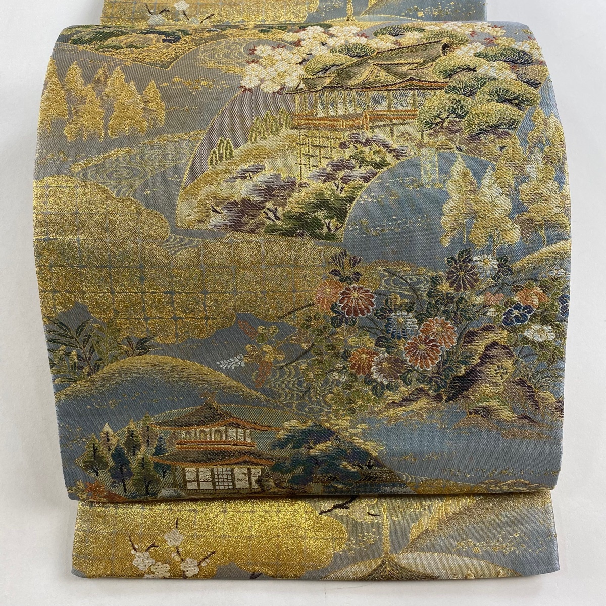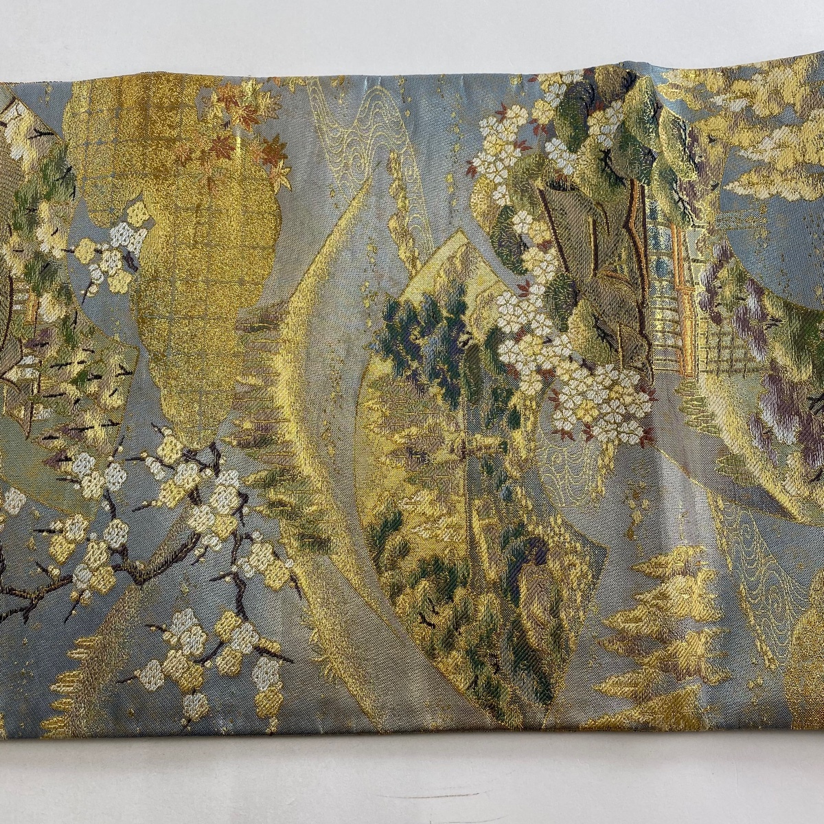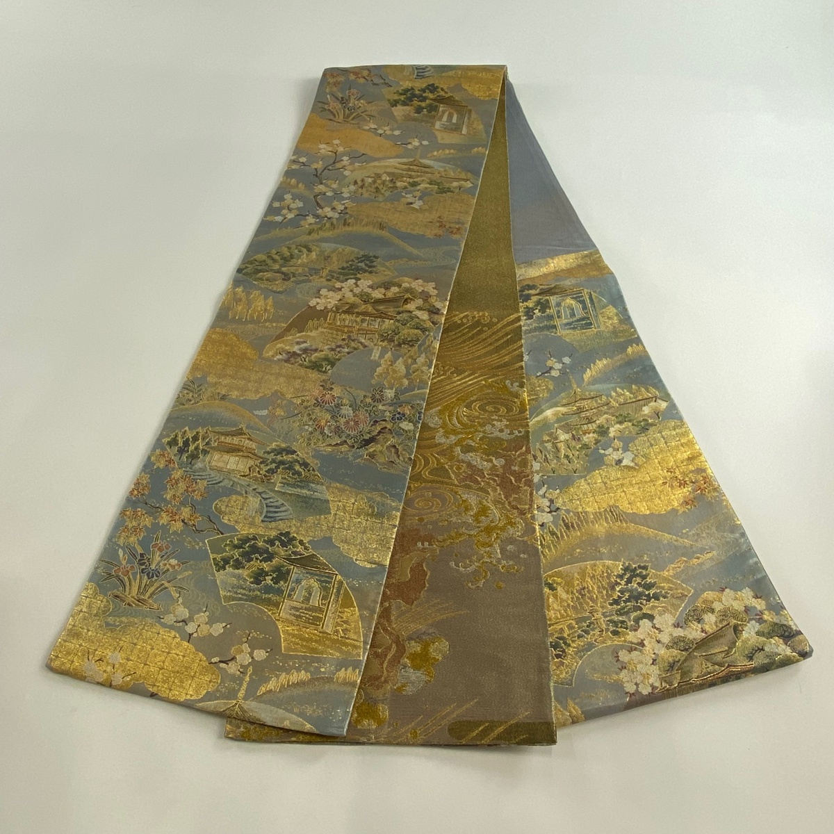 | 袋帯 名品 扇面 風景 箔 金糸 青灰色 六通 正絹 【中古】 |