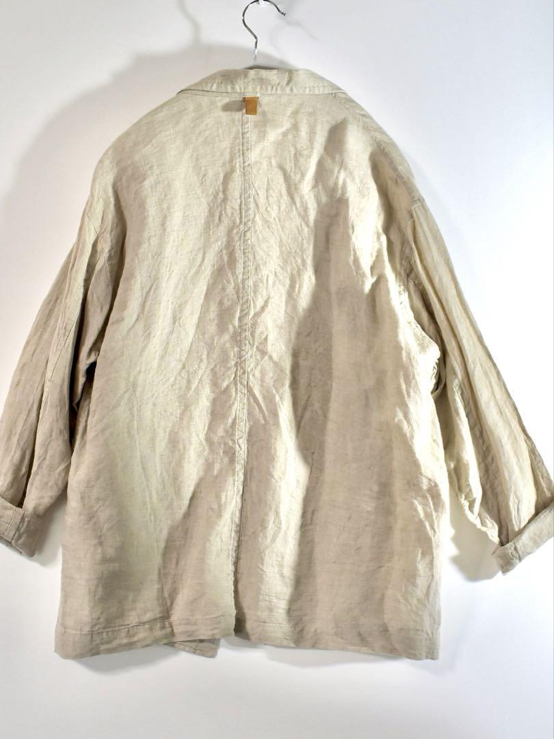 〈ジャケット〉程よい余裕を持たせたリラックスフィットのイージーダブルジャケット。軽いシャツ生地を使用しているため夏場まで着用いただけます。筒袖・ノーベント・パッチポケットと軽い仕立てなのでTシャツやショートパンツなどカジュアルアイテムとも好相性。背中心に配したレザータブもポイント。