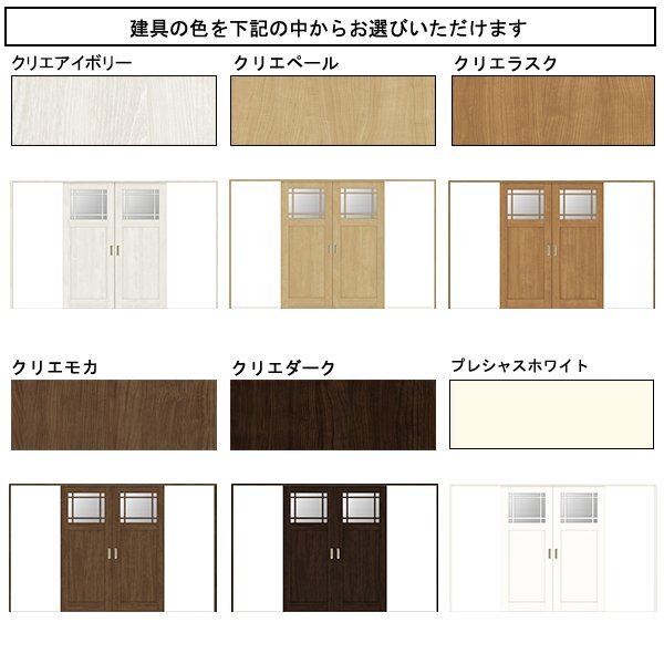 | 商品紹介 | ○ トステムの室内建具 引分け戸 ラシッサS クリエ ○ デザインLGJ 格子付 ○ ノンケーシング * 色をお選び頂けます * 引手色をお選びいただけます * 枠幅を選びいただけます * 敷居を4種類よりお選び頂けます(画像参照) * ガラスの種類をお選び頂けます(画像参照) * オプション・ソフトモーションを(シングル又はダブル)からお選びいただけます。 * オプション・バーハンドル(片側)をお選びいただけます。 * 同時に複数セット、お買上げ頂けますと、送料の値引を致します。 違うサイズ(違う種類)との組合せでもOKです、是非お問合せ下さい。 |