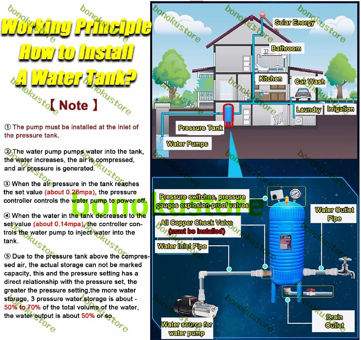 動作原理: 圧力タンクをウォーターポンプ (ウォーターポンプは付属していません) に接続し、空気圧を使用して水を供給し、水量が圧力値に達するとポンプの電源をオフにしてポンプを停止します。水量が減少すると、自動的に水をポンプします。突然の停電があっても、短時間で通常の水を供給できます。