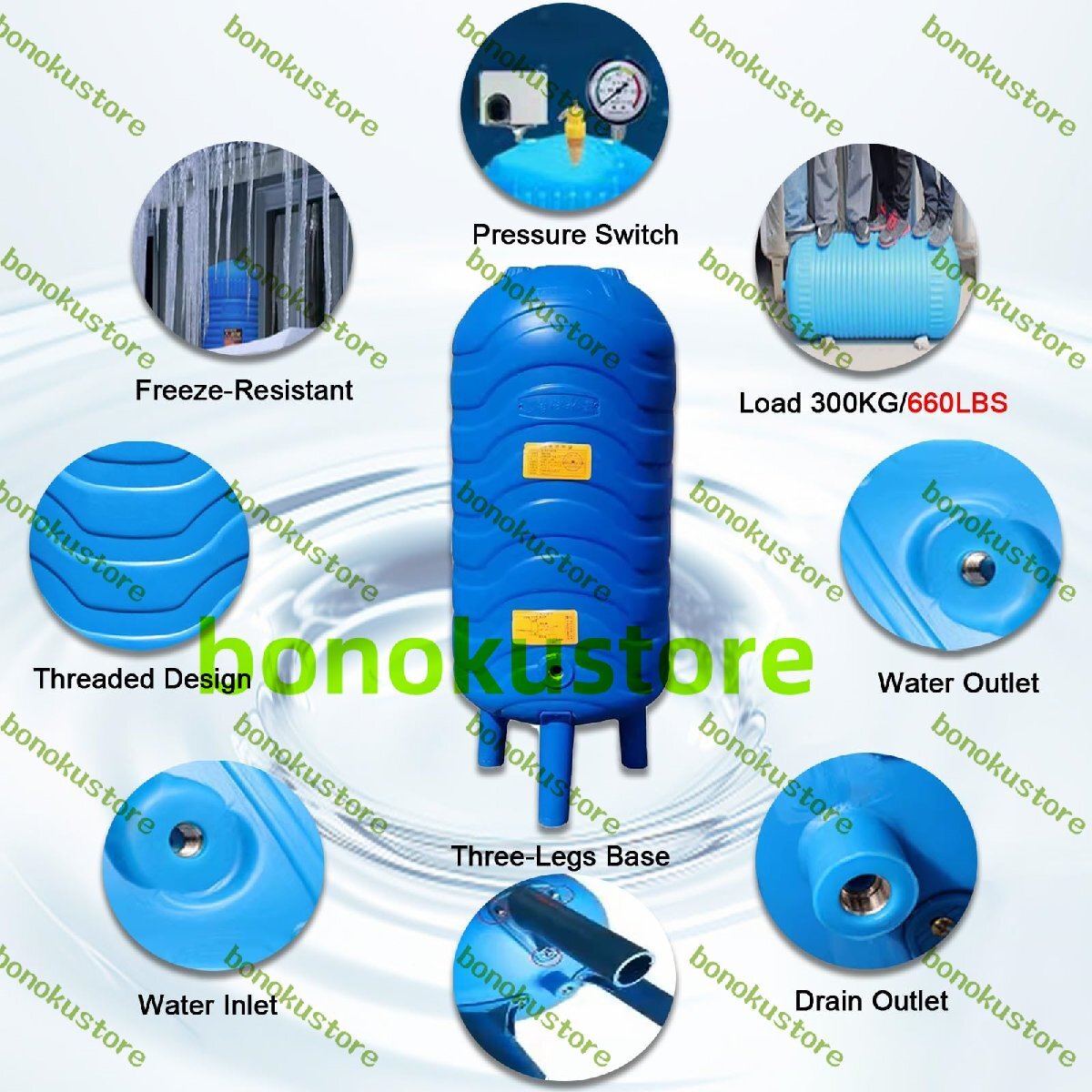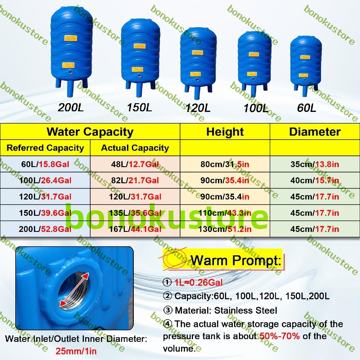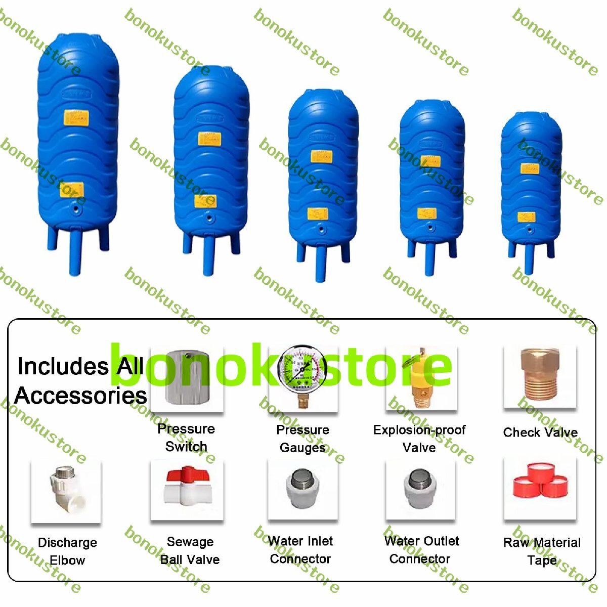 圧力タンク 貯水タンク 井戸水加圧貯蔵タンク、 自立型 PP 家庭用 給水容器 200 150 120 100 60L、 農業灌漑用、 キャンプ用、 釣り用、 エア抜きバルブ付き および設置キット(31.7 gallon/120 L)