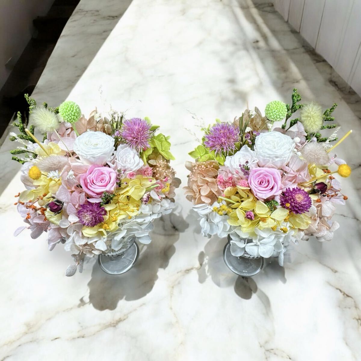 ドライフラワーとプリザーブドフラワーでアレンジしたフラワーアレンジメント2個セットです。ピンク、イエロー、ホワイト、グリーンなど様々な色合いの花材を使用しており、華やかで可愛らしい印象に仕上げました。お部屋のインテリアやプレゼントにいかがでしょうか。花瓶はガラス製です。リボンは取り外し可能です。ウェルカムスペース、お盆のお供えや、一周忌、三回忌などのご自宅、贈り物などにも、インテリアなど