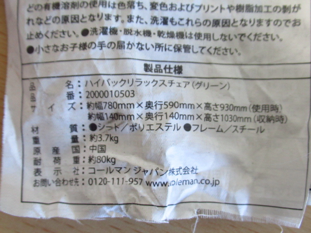 Coleman コールマン ハイバックリラックスチェア グリーン / Hilander 折りたたみチェア 緑 アウトドア キャンプ 管理25G0725F