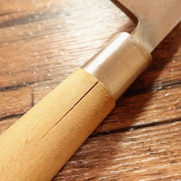 和包丁の口輪(鍔の部分)は動く場合がありますが、水が掛かると柄が膨張して固定されます。不具合ではありません。